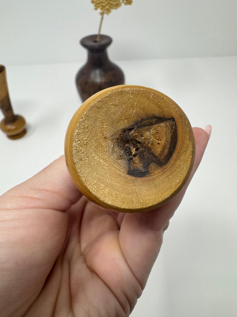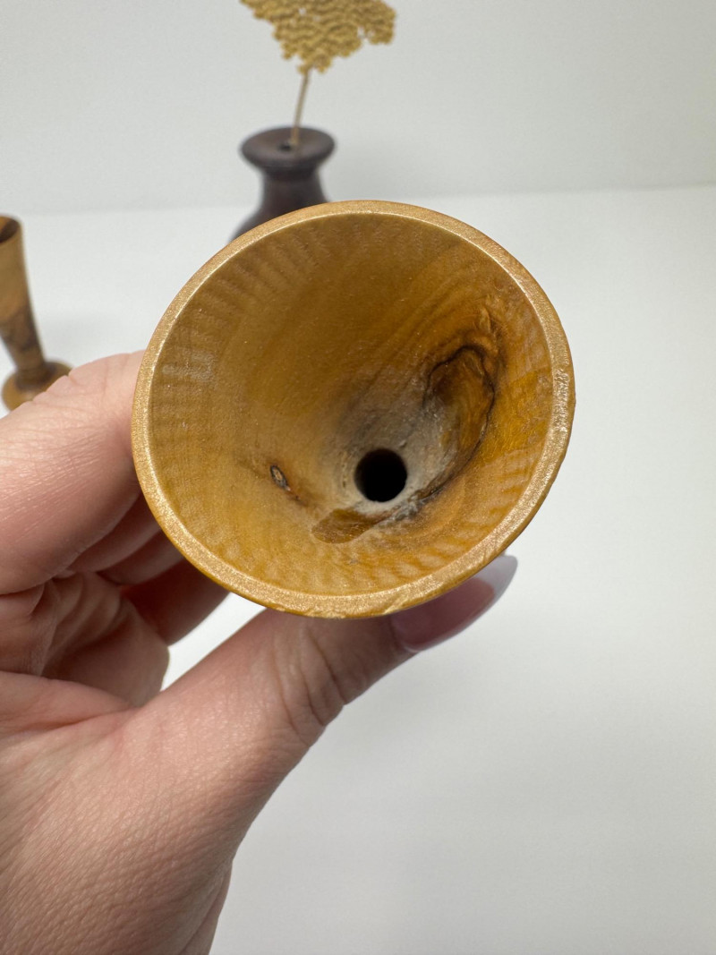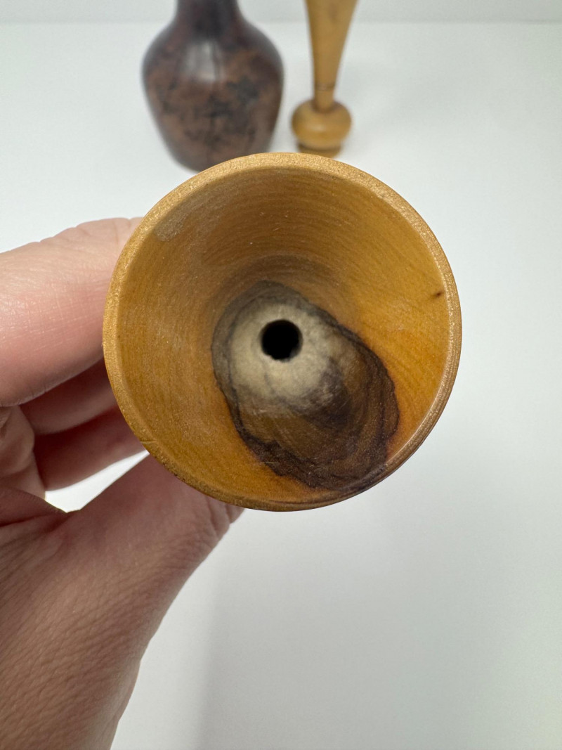 Signed Burlwood Vase w/ 2 Small Turned Wood Vases. 4.5” - 5”