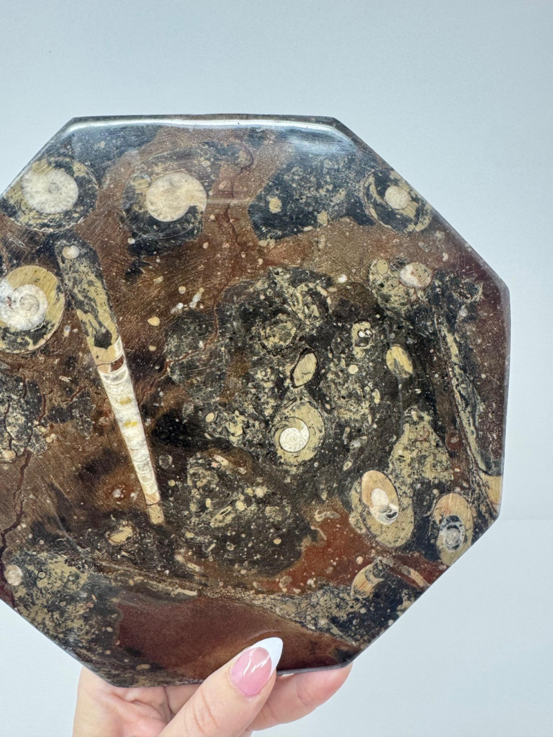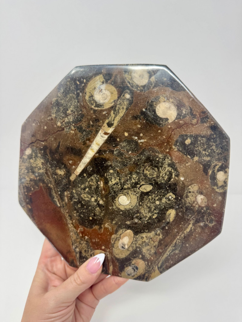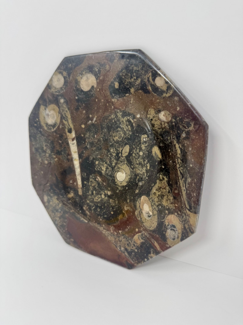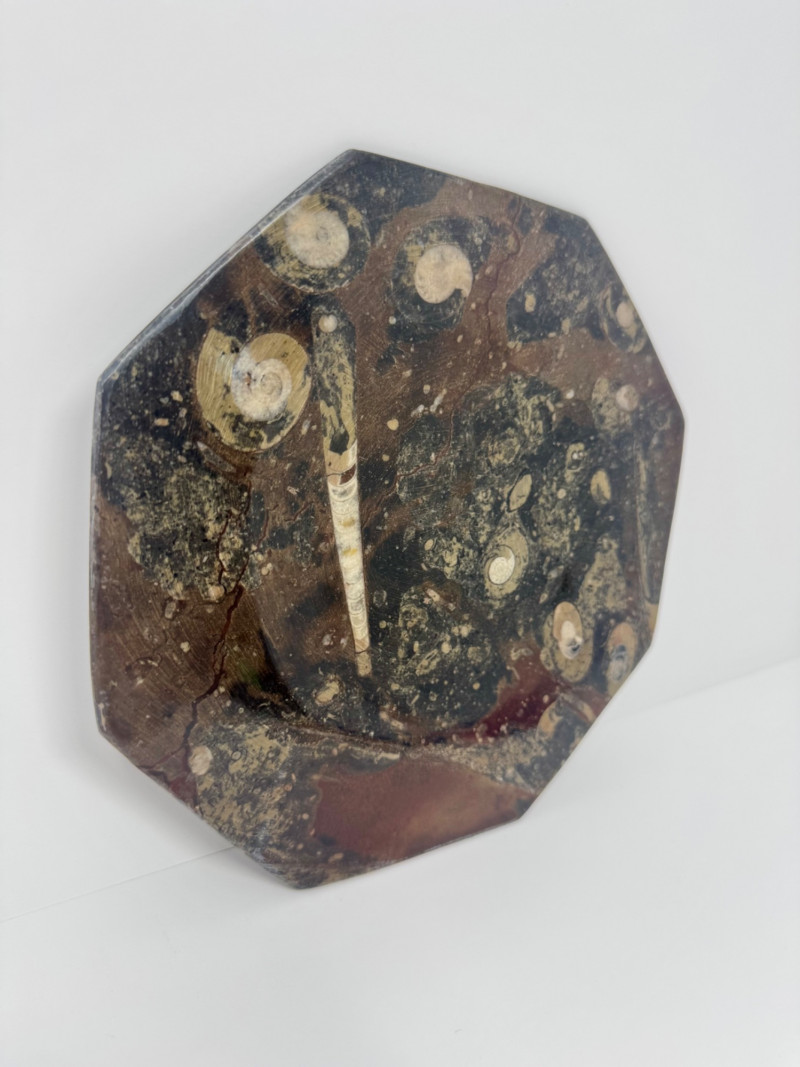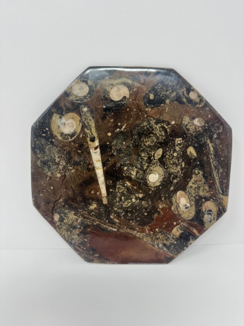 Large Brown Fossil Octagon Platter w/ Ammonoids & Orthoceras. Measures approx. 8" diameter