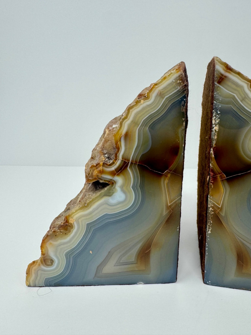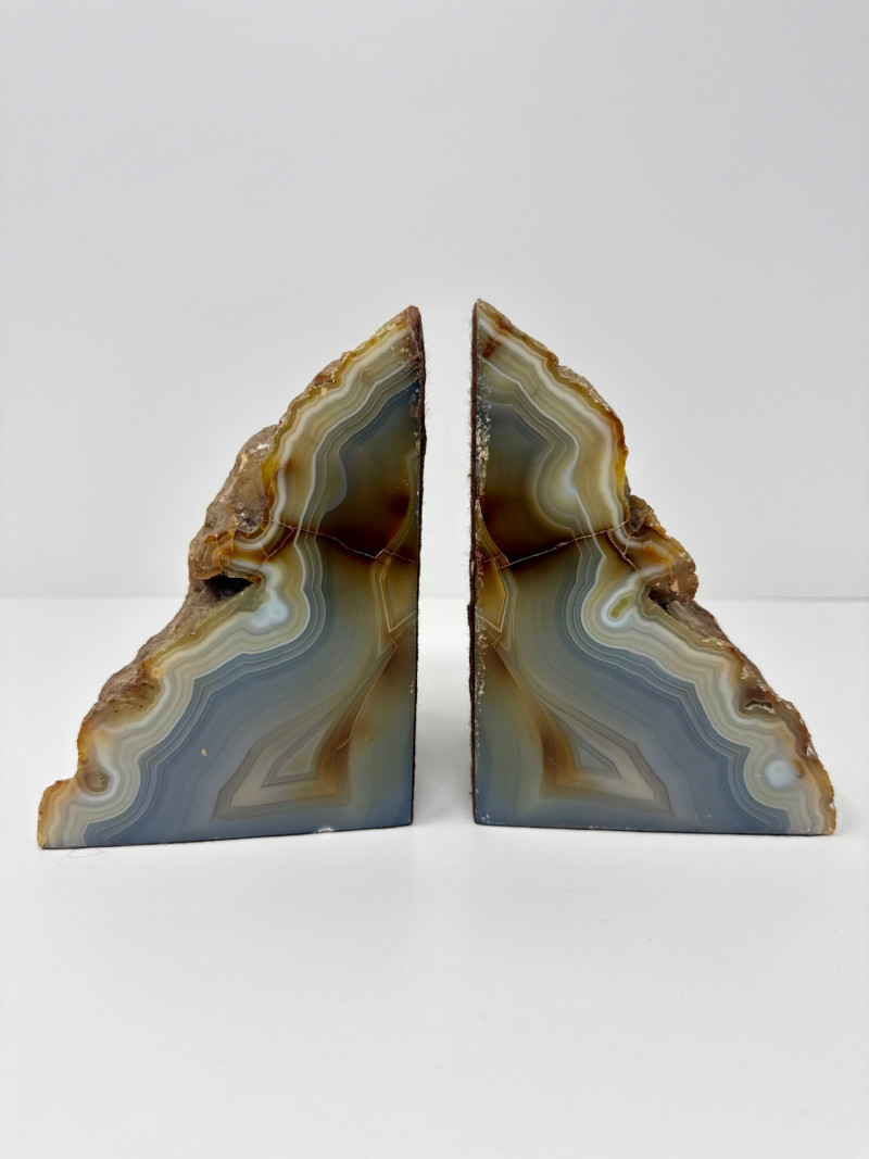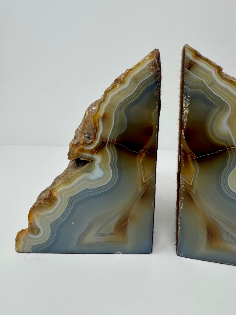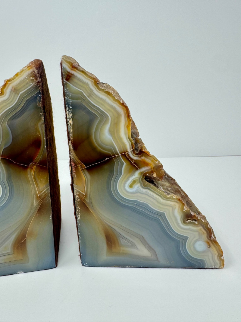 Pair Of Polished Agate Geode Bookends - Gray, Brown, & Gold Tones. Each measures approx. 6" tall Please note: These mineral specimens have not been professionally tested or identified. They are offered "as-is" based on visual assessment. All items are sold "as is" with no guarantees regarding quality, content, or purity. By placing a bid, you acknowledge and agree to these terms. Refunds will not be issued based on these factors.