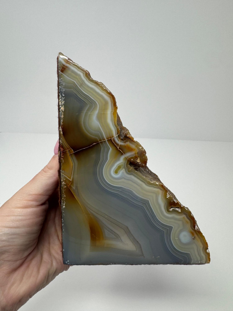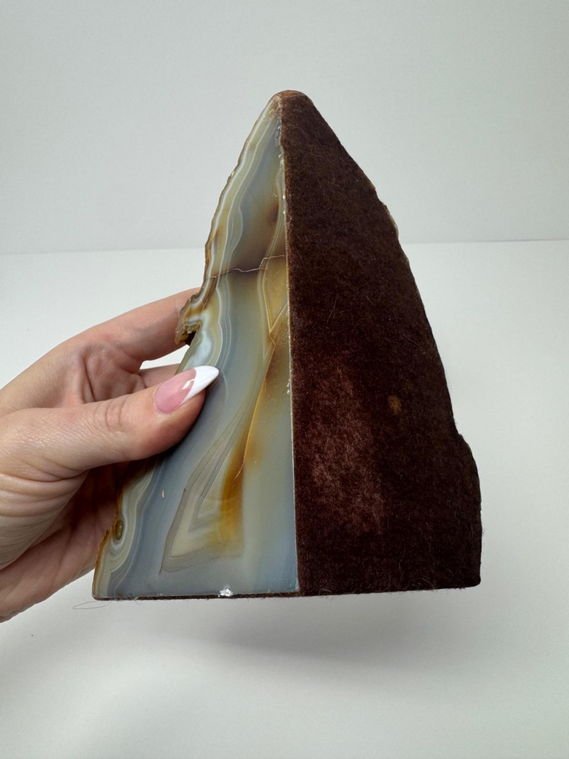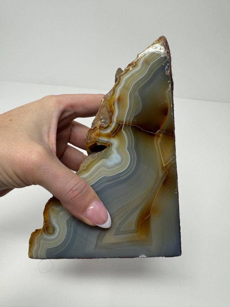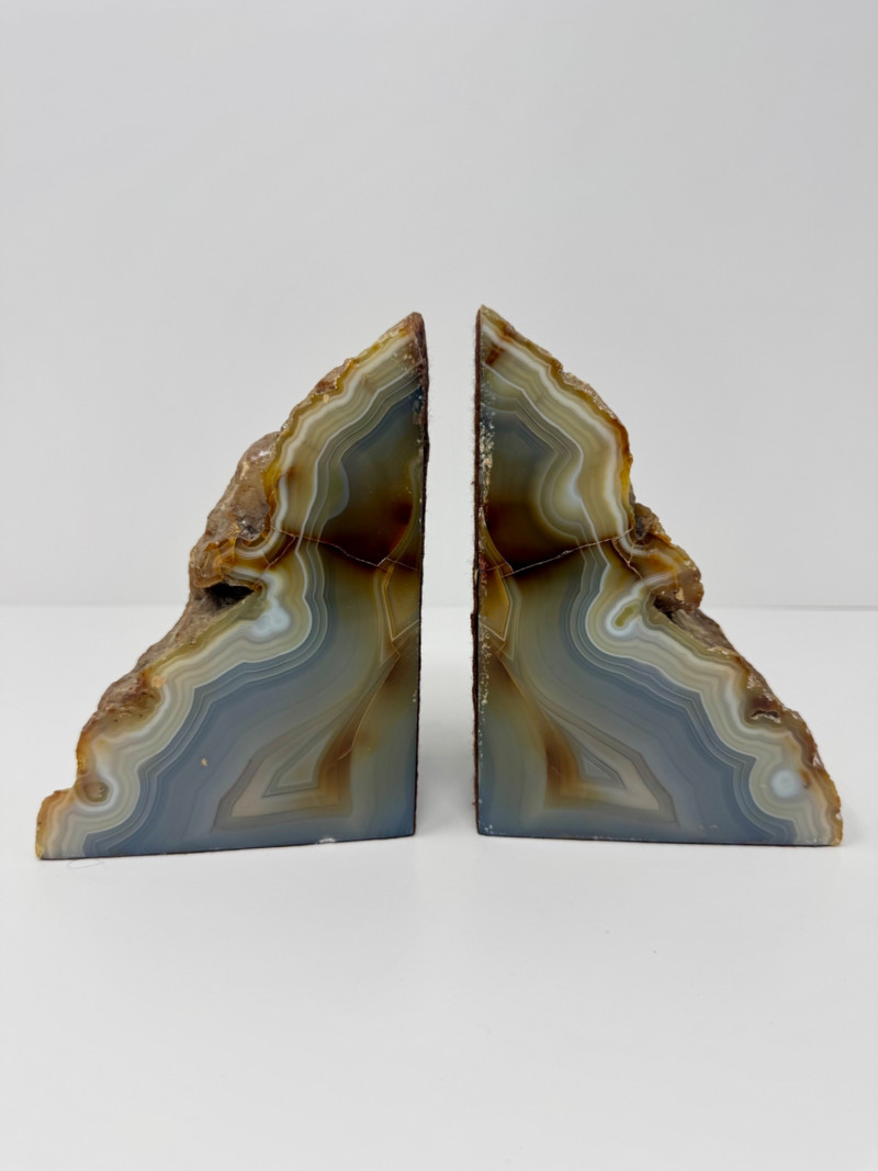 Pair Of Polished Agate Geode Bookends - Gray, Brown, & Gold Tones. Each measures approx. 6" tall Please note: These mineral specimens have not been professionally tested or identified. They are offered "as-is" based on visual assessment. All items are sold "as is" with no guarantees regarding quality, content, or purity. By placing a bid, you acknowledge and agree to these terms. Refunds will not be issued based on these factors.