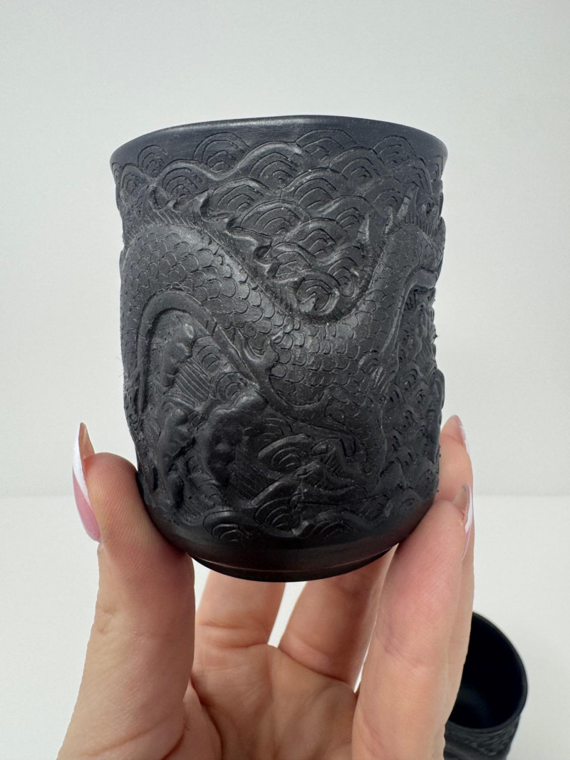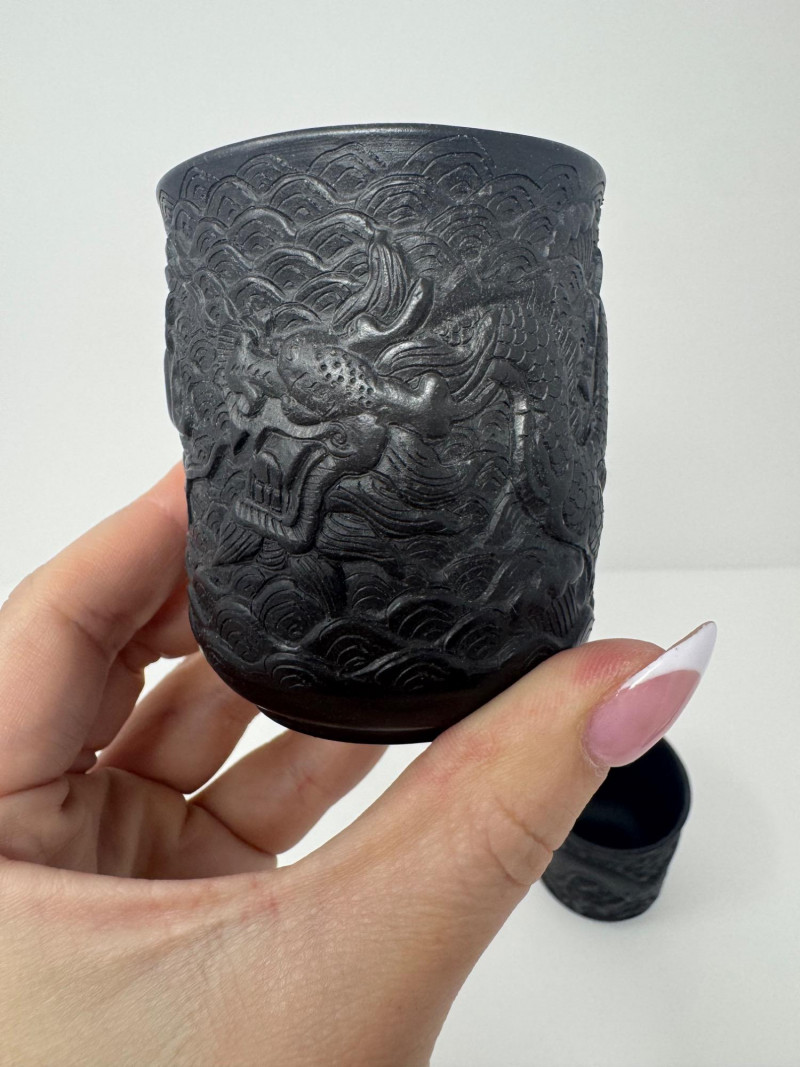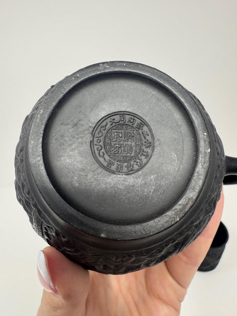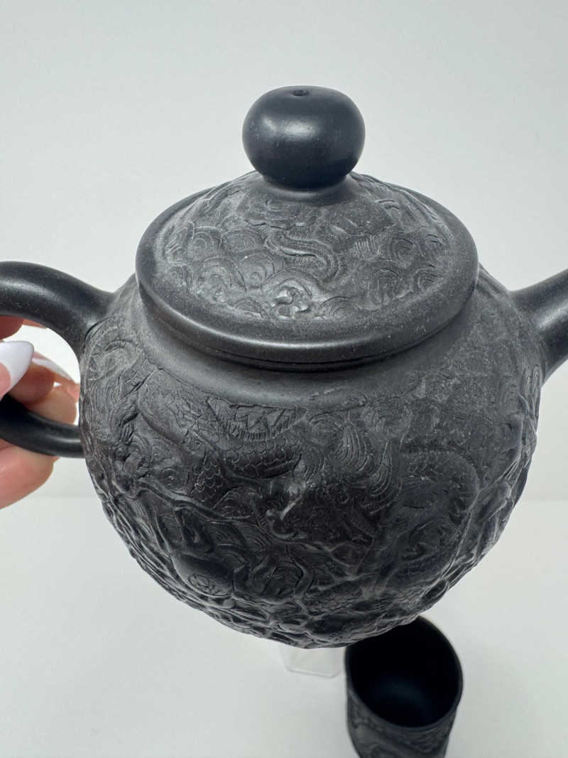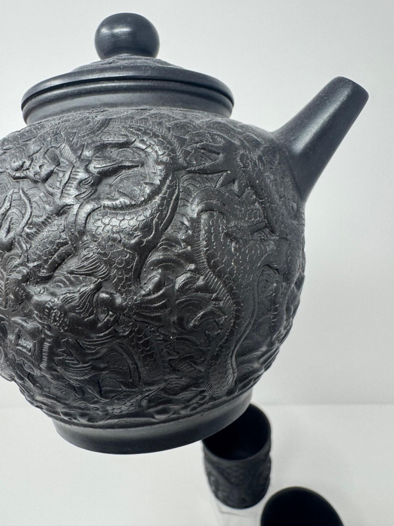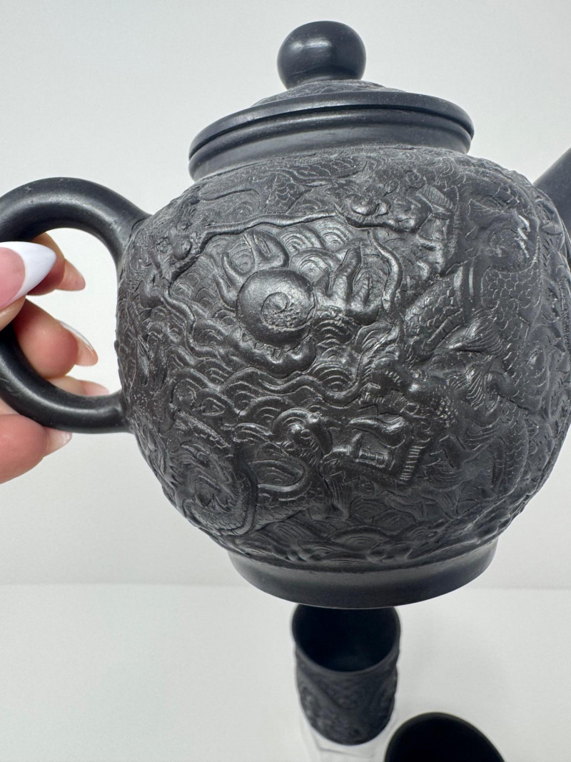 Black Dragon Embossed Teapot + 2 Matching Cups - Signed Base.