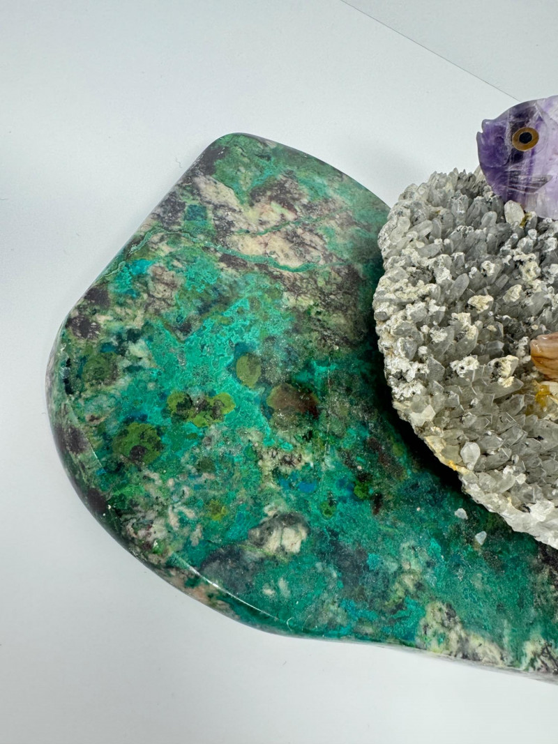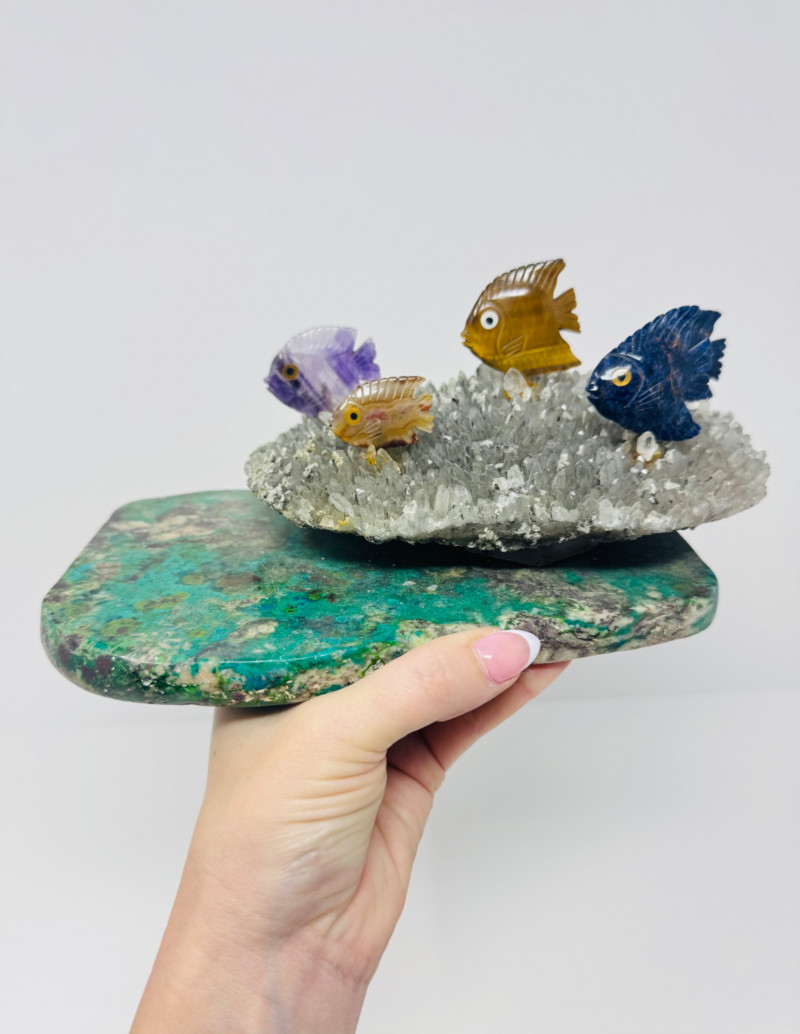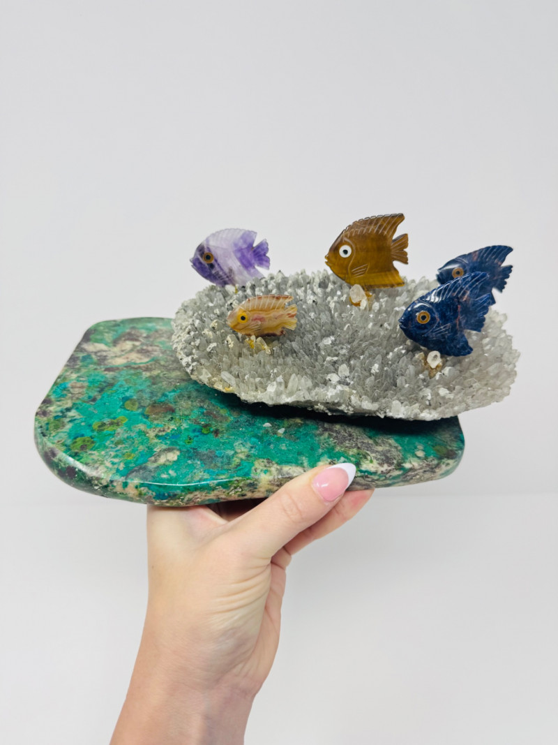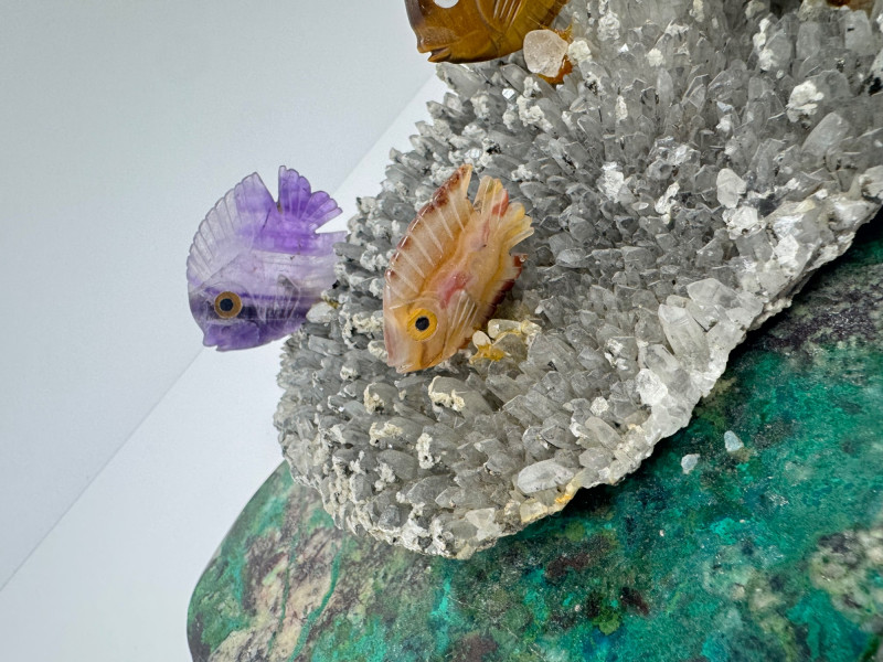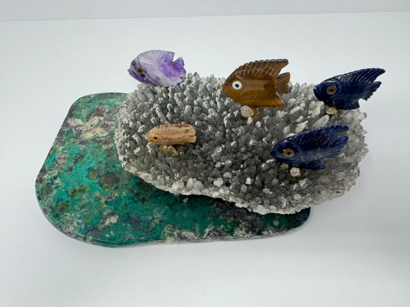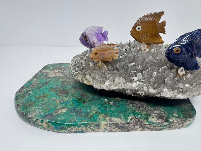 Large 10” Gemstone Fish Sculpture on Crystal Coral-Like Stone Base.