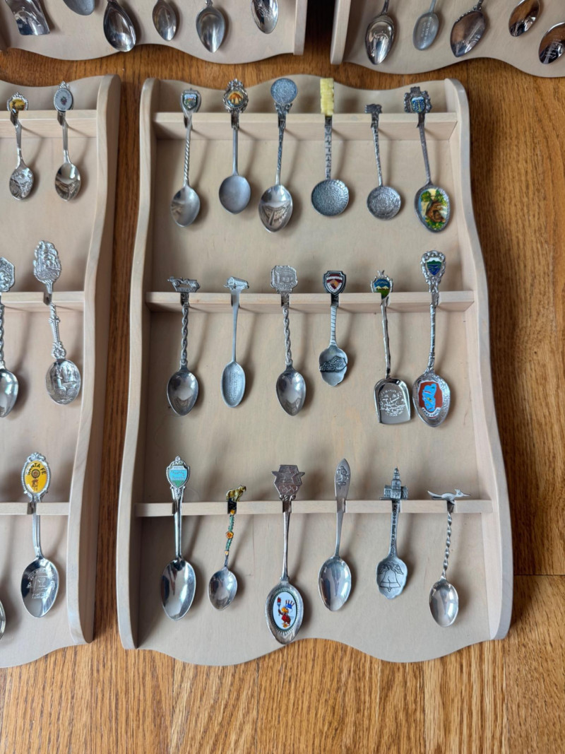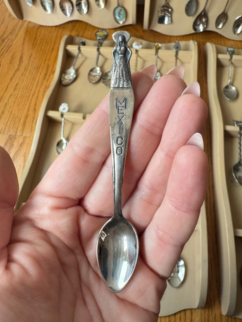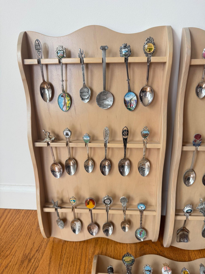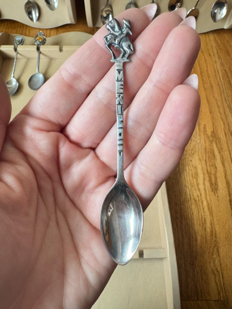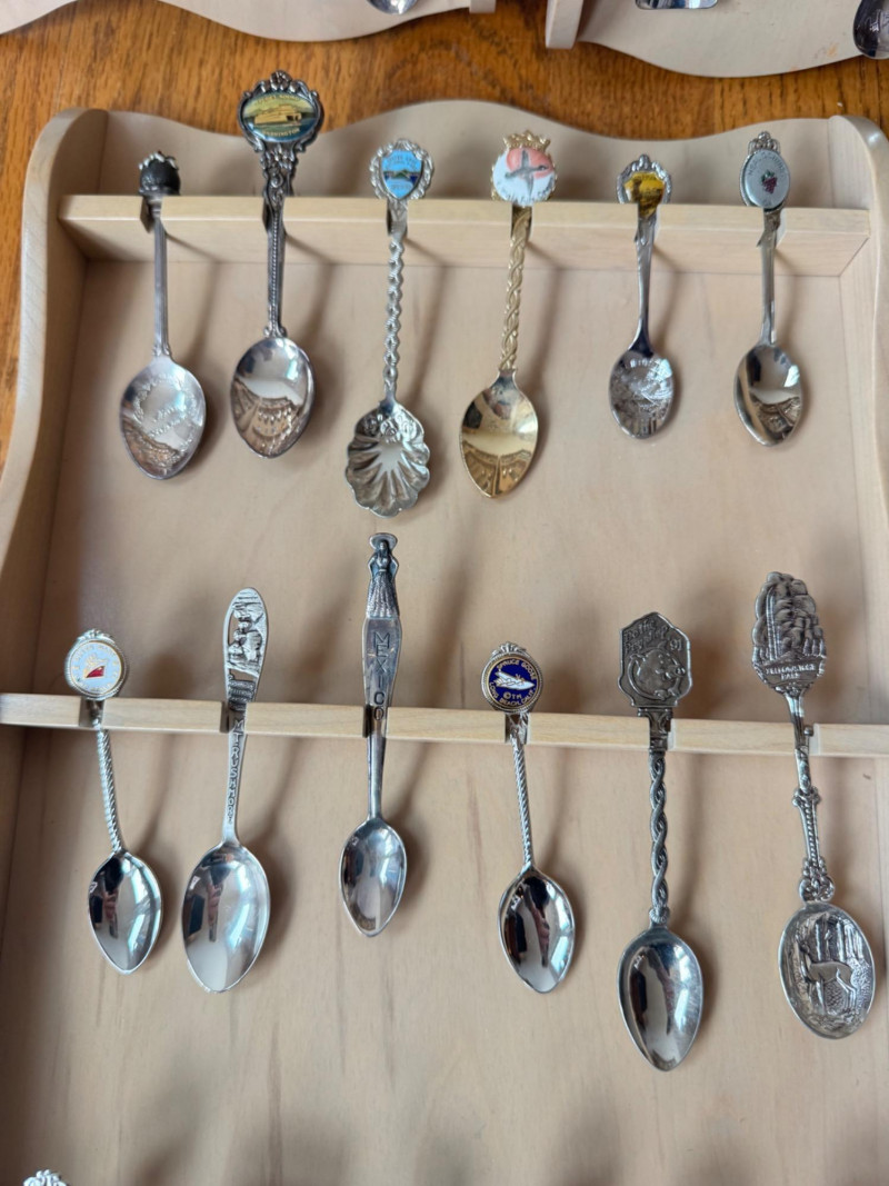 World Souvenir Spoon Collection w/ 5 Racks, 11pcs Silver Marked - #2. Disclaimer: We do not test the metals of the items listed for auction. By placing a bid, you acknowledge and agree that you are purchasing the item "as is" and without any guarantee of metal quality. We do not offer refunds based on metal content or purity.