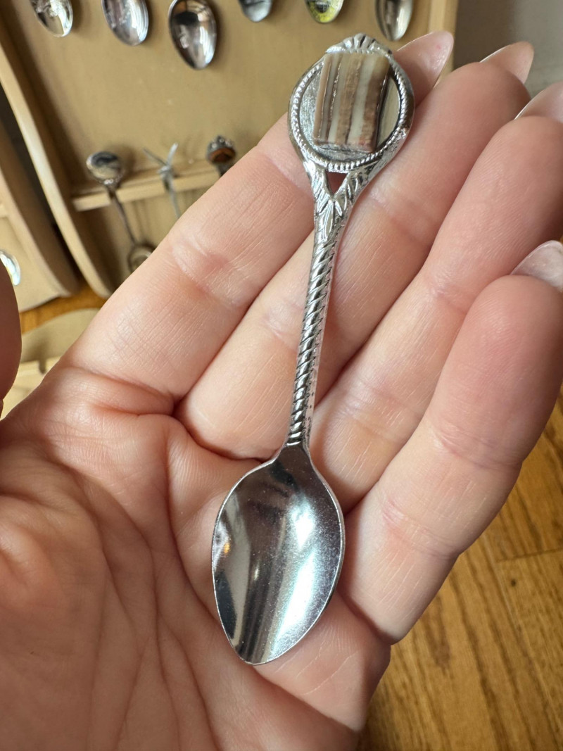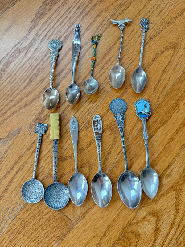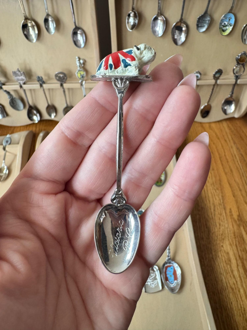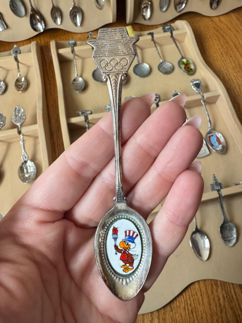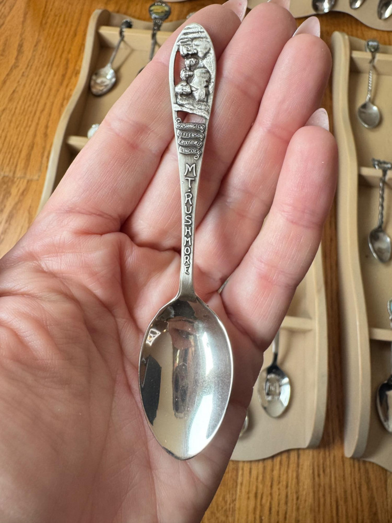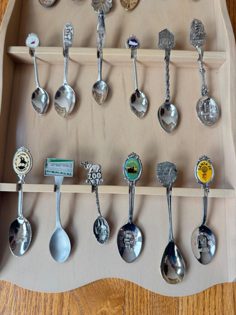 World Souvenir Spoon Collection w/ 5 Racks, 11pcs Silver Marked - #2. Disclaimer: We do not test the metals of the items listed for auction. By placing a bid, you acknowledge and agree that you are purchasing the item "as is" and without any guarantee of metal quality. We do not offer refunds based on metal content or purity.