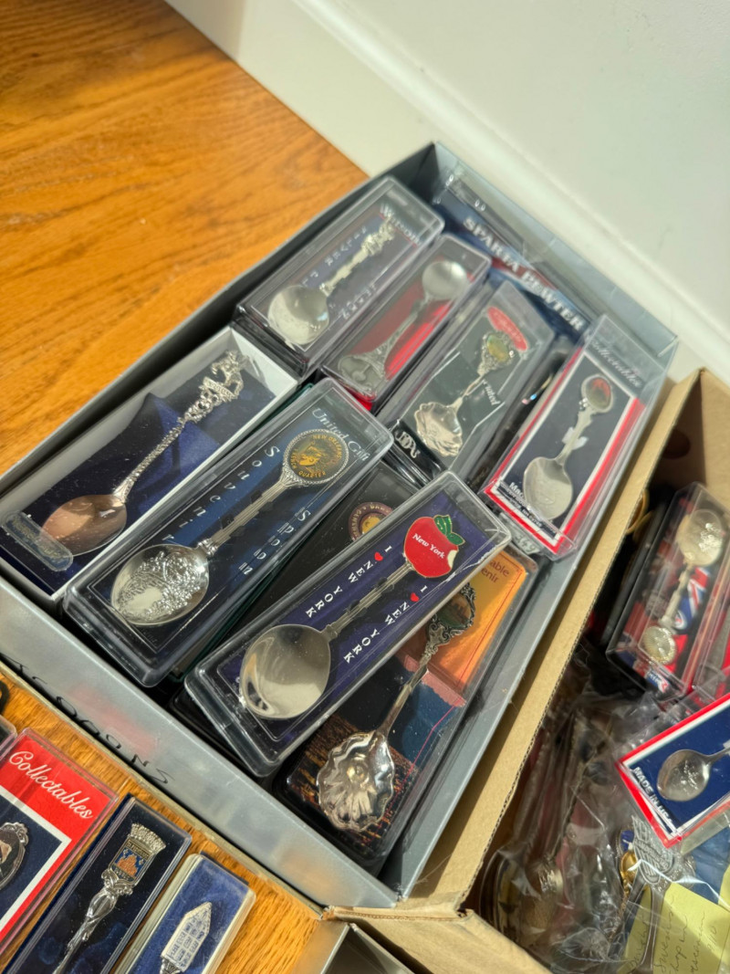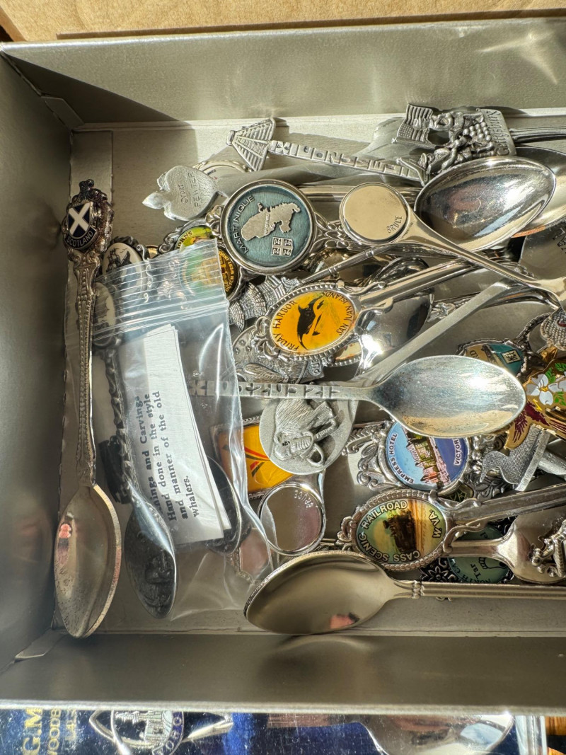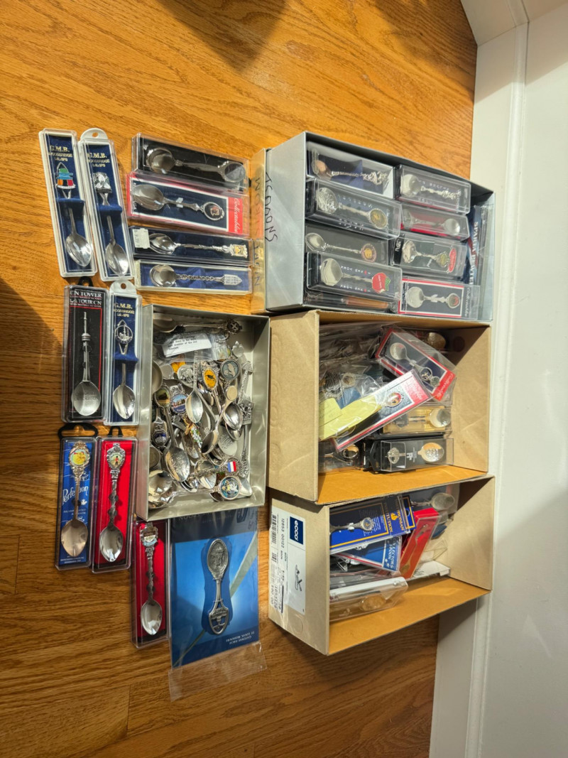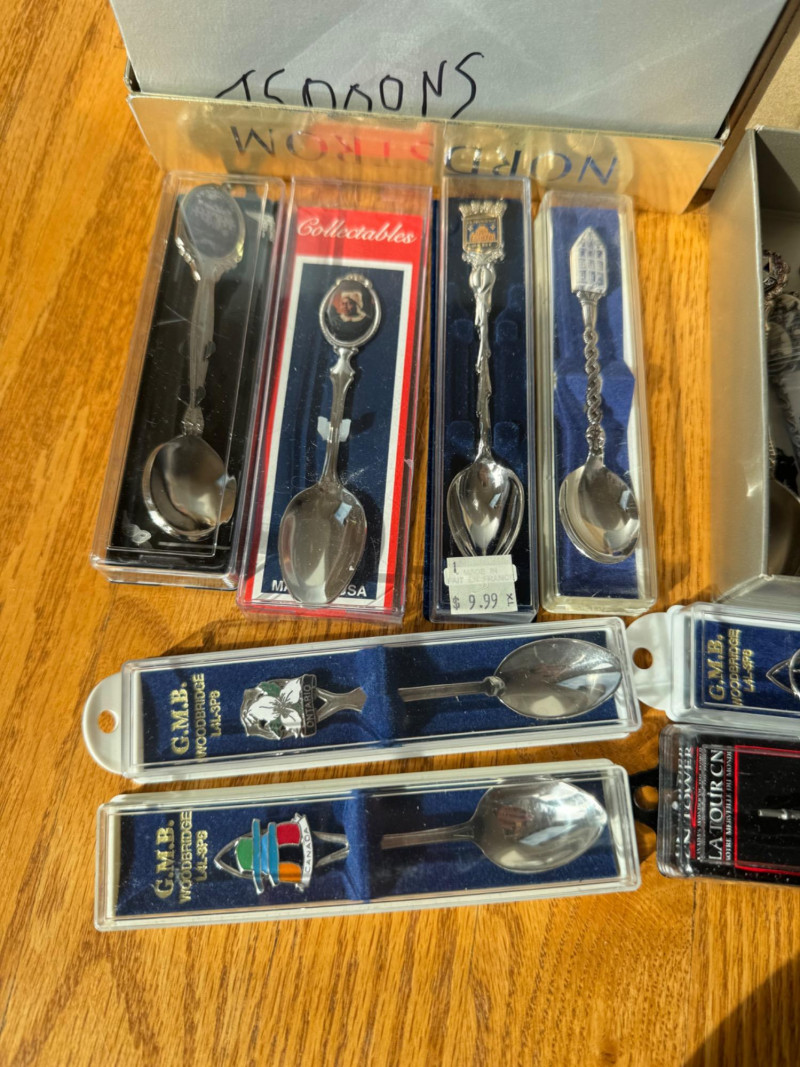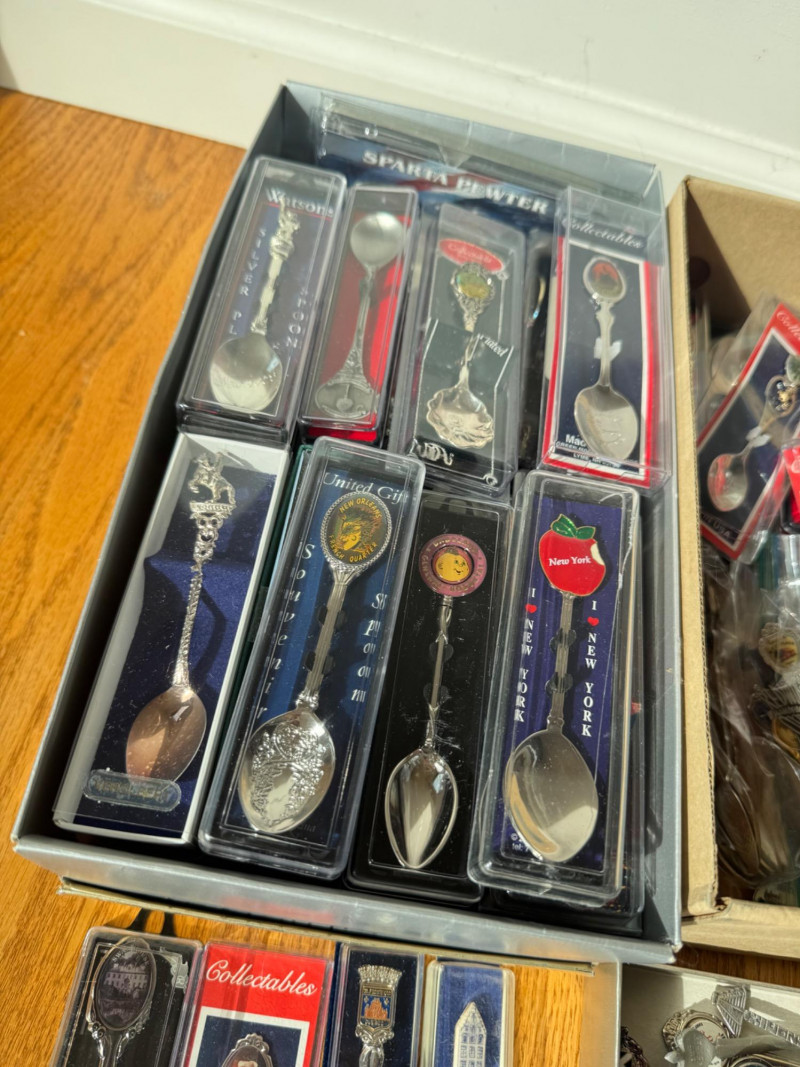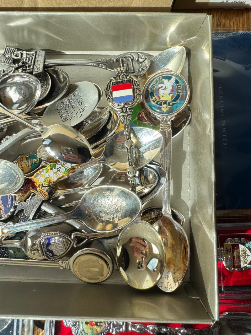 Large Lot of Collector Souvenir Spoons – Sterling, Plated & Pewter. Disclaimer: We do not test the metals of the items listed for auction. By placing a bid, you acknowledge and agree that you are purchasing the item "as is" and without any guarantee of metal quality. We do not offer refunds based on metal content or purity.