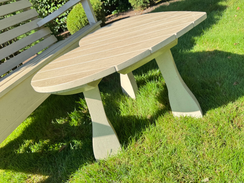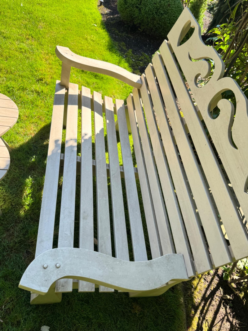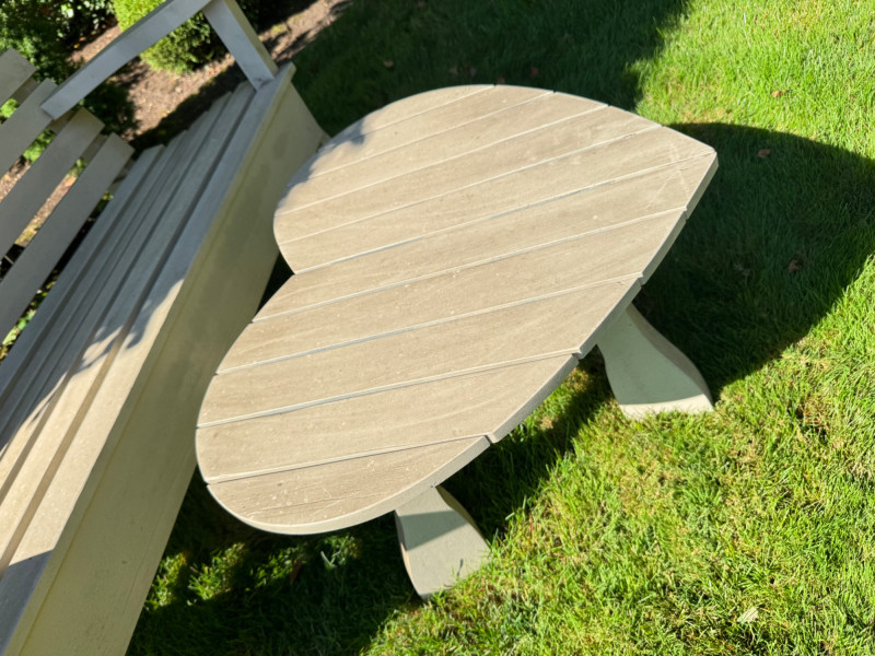 Heart-Cutout Wood Bench w/ Armrests & Matching Heart Table. Bidding on this lot is an agreement that: (1.) You will have at least 2 capable, able bodied persons to lift and load at a minimum. (2.) You will bring a hand truck and/or any other tools needed to remove this item. If these steps are not followed your item will be forfeit and no refund given.
