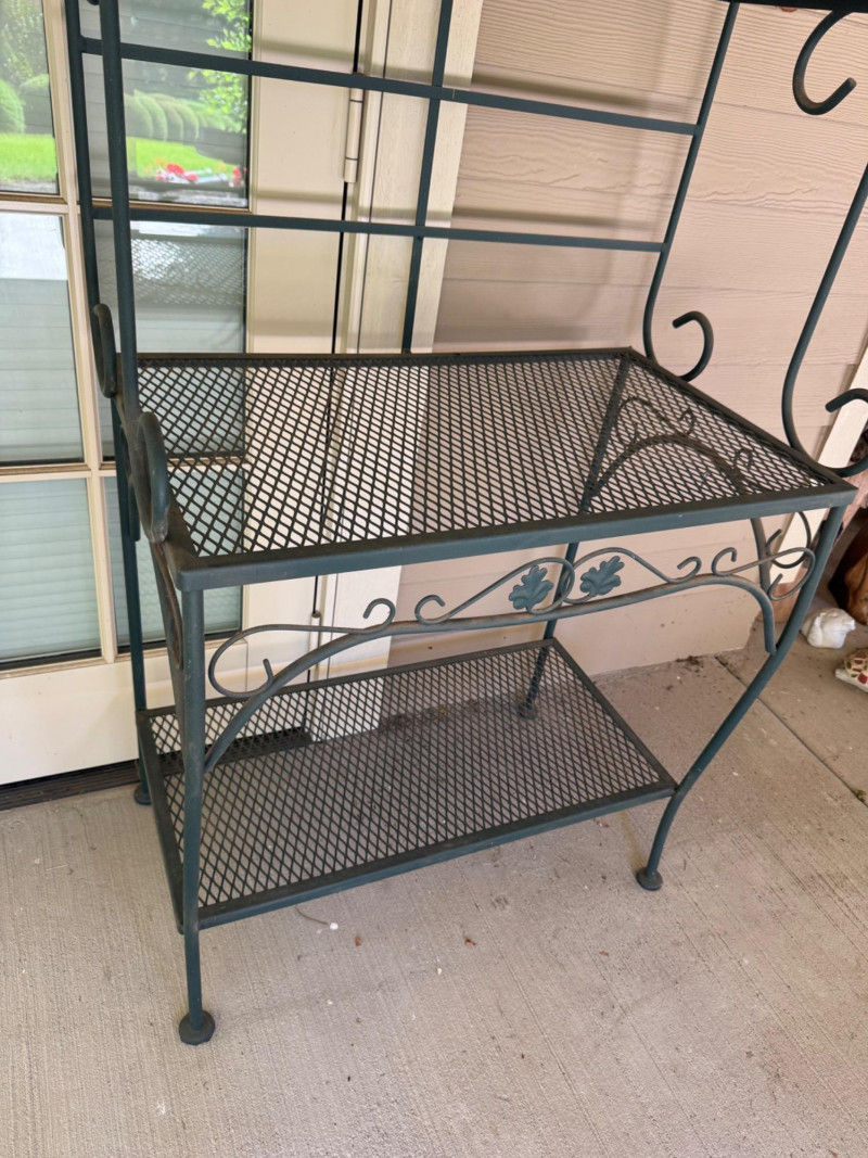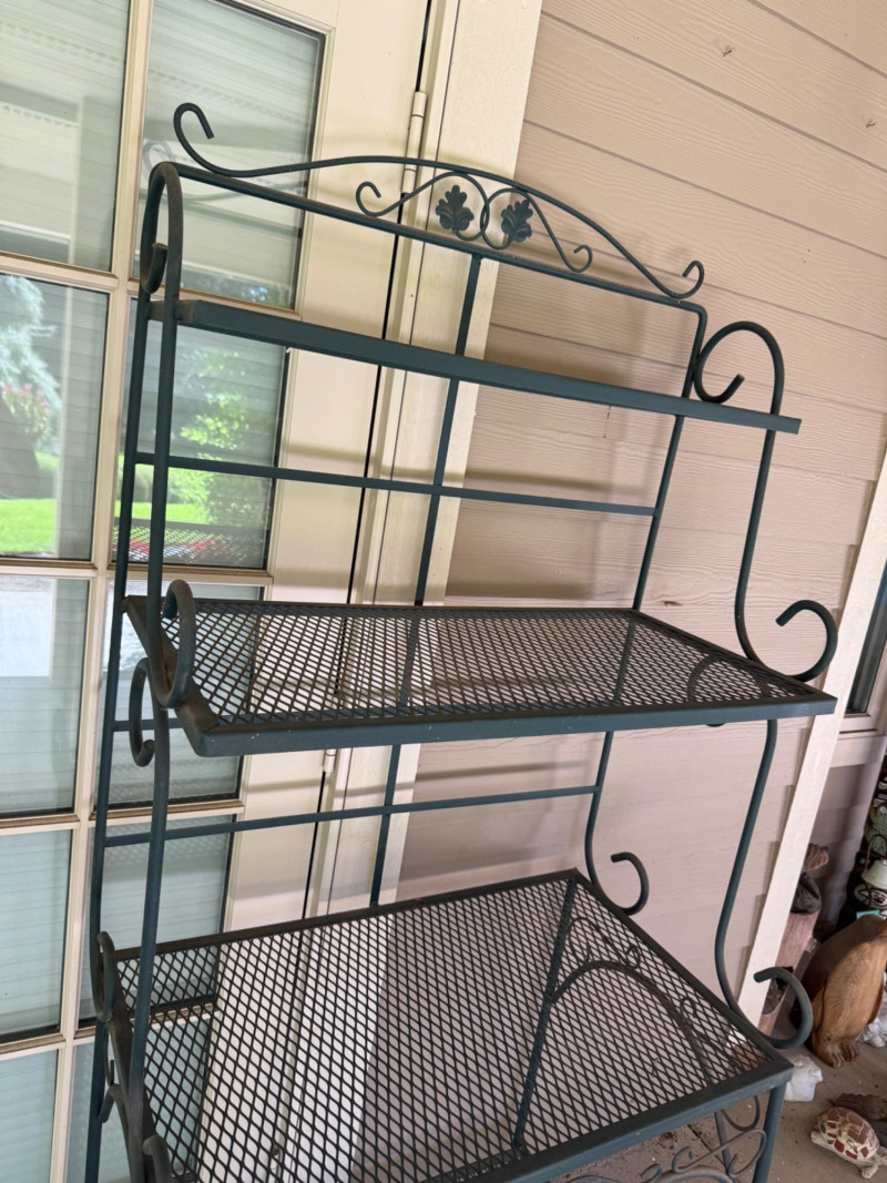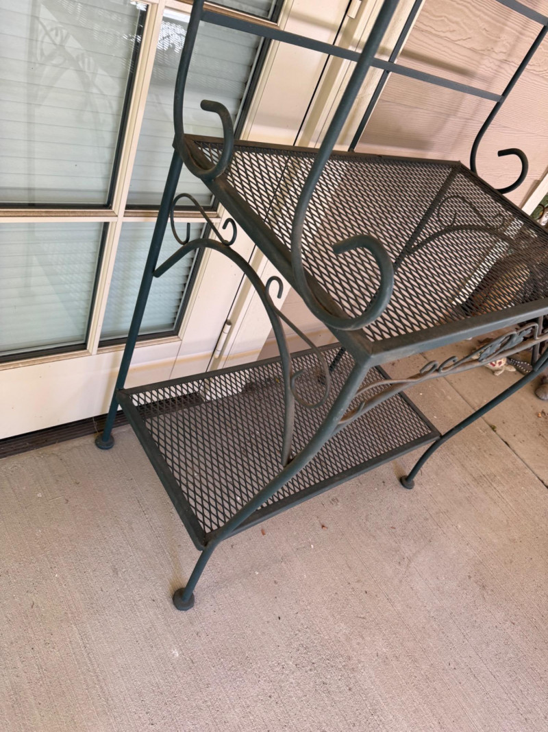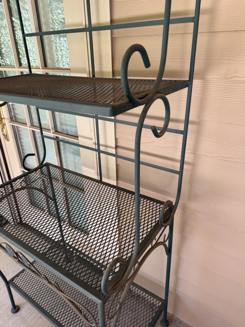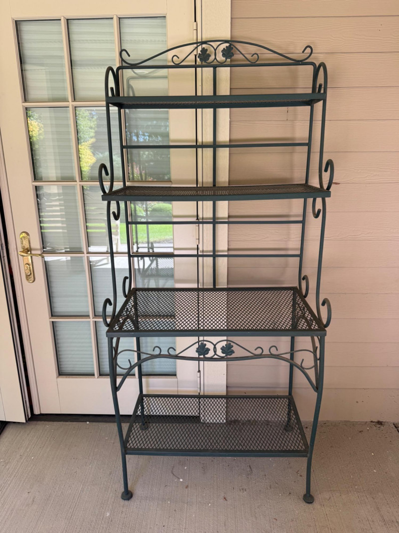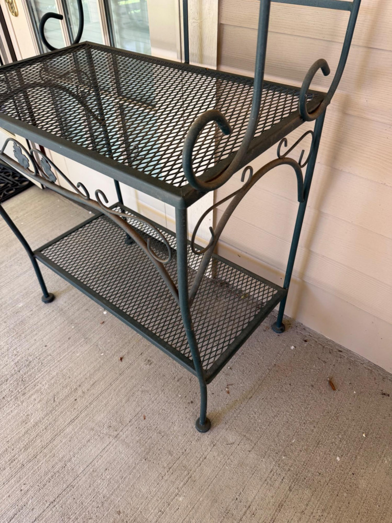 Wrought Iron 4-Tier Bakers Rack Shelf w/ Scroll & Leaf Detail. Bidding on this lot is an agreement that: (1.) You will have at least 2 capable, able bodied persons to lift and load at a minimum. (2.) You will bring a hand truck and/or any other tools needed to remove this item. If these steps are not followed your item will be forfeit and no refund given.