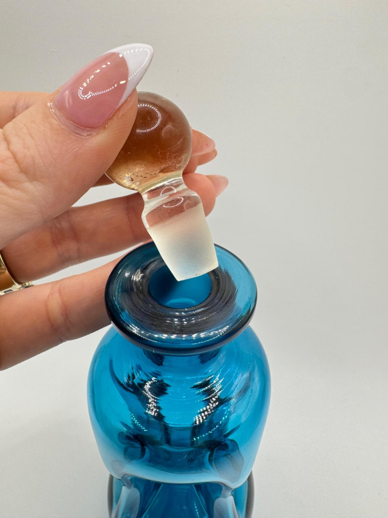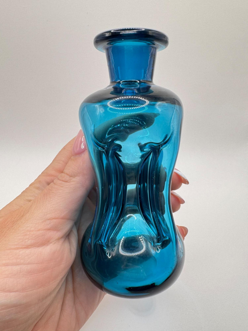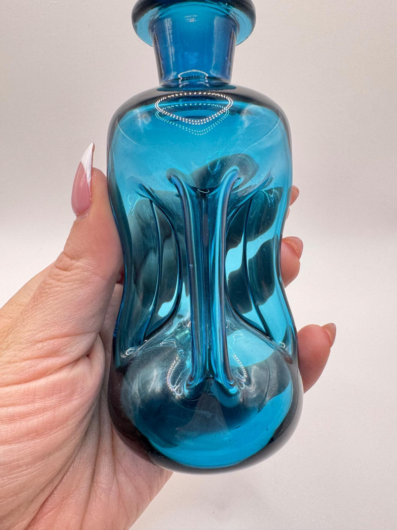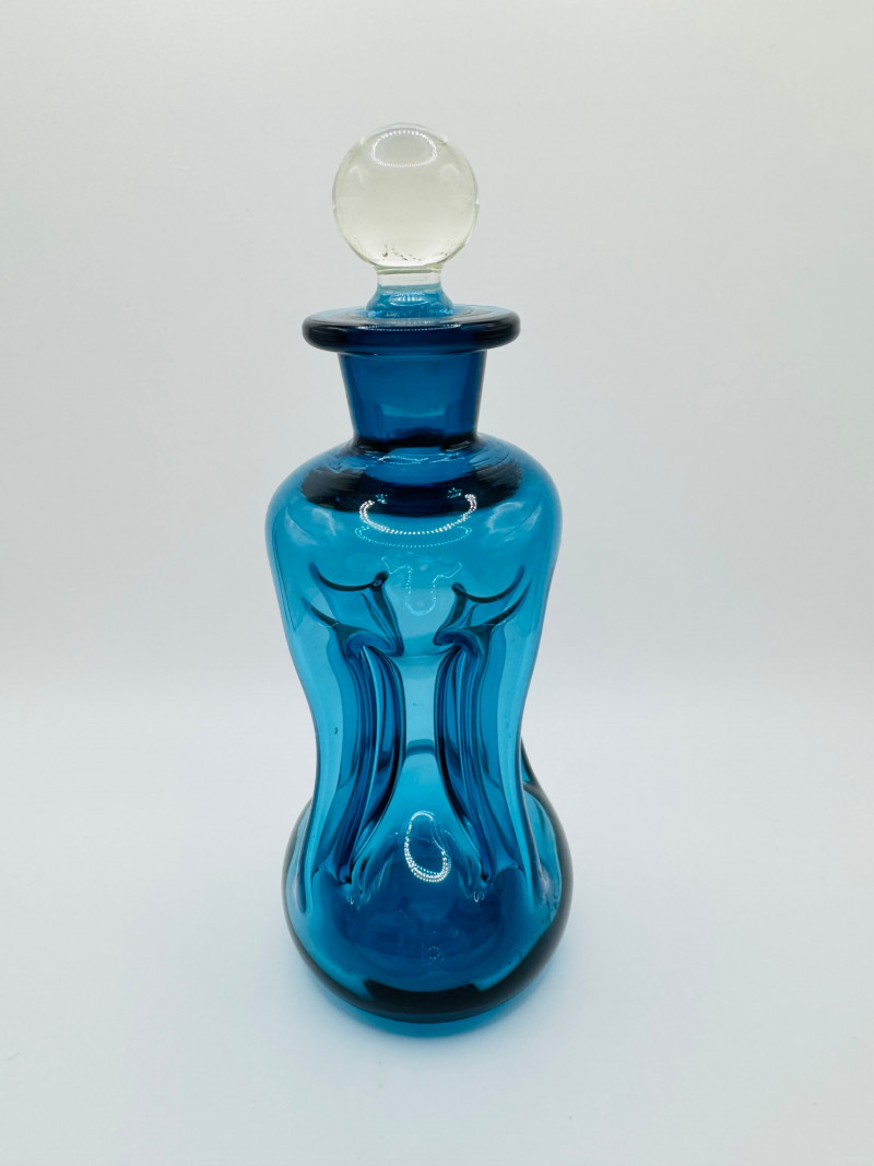 Blue Holmegaard Kluk Kluk Style Glass Perfume Bottle w/ Stopper. 6" Tall.