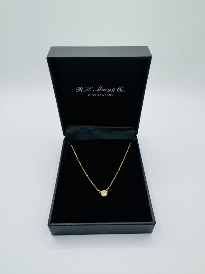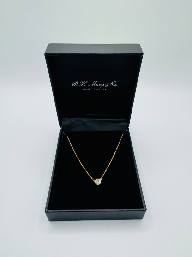 Macy’s 14K Gold Bezel Diamond Pendant Necklace 1/5ct, 1.07g. Disclaimer: The jewelry in this auction lot has not been tested. By placing a bid, you agree to purchase the item as is, with no guarantees regarding metal quality, content, or purity. Refunds will not be issued on these factors.