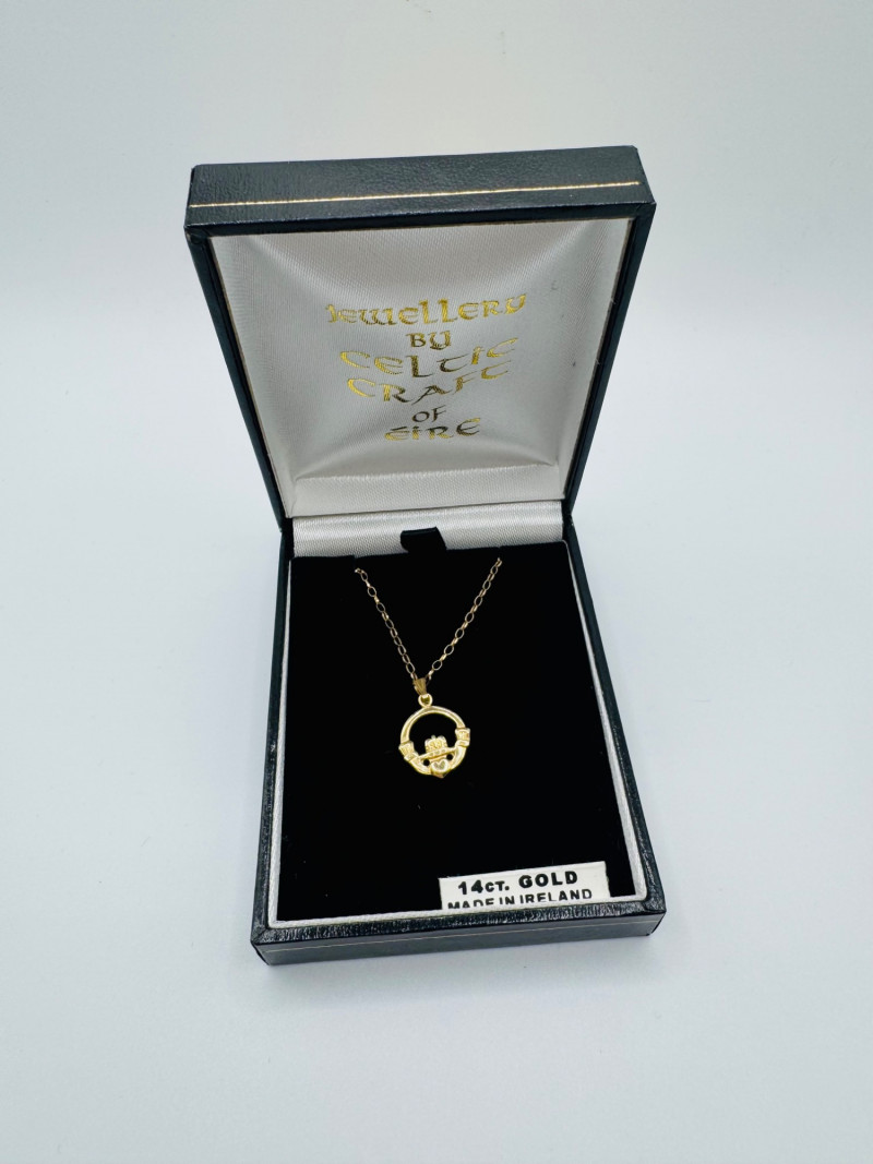 14K Gold Claddagh Pendant Necklace Celtic Craft Ireland 1.87g. Disclaimer: The jewelry in this auction lot has not been tested. By placing a bid, you agree to purchase the item as is, with no guarantees regarding metal quality, content, or purity. Refunds will not be issued on these factors.