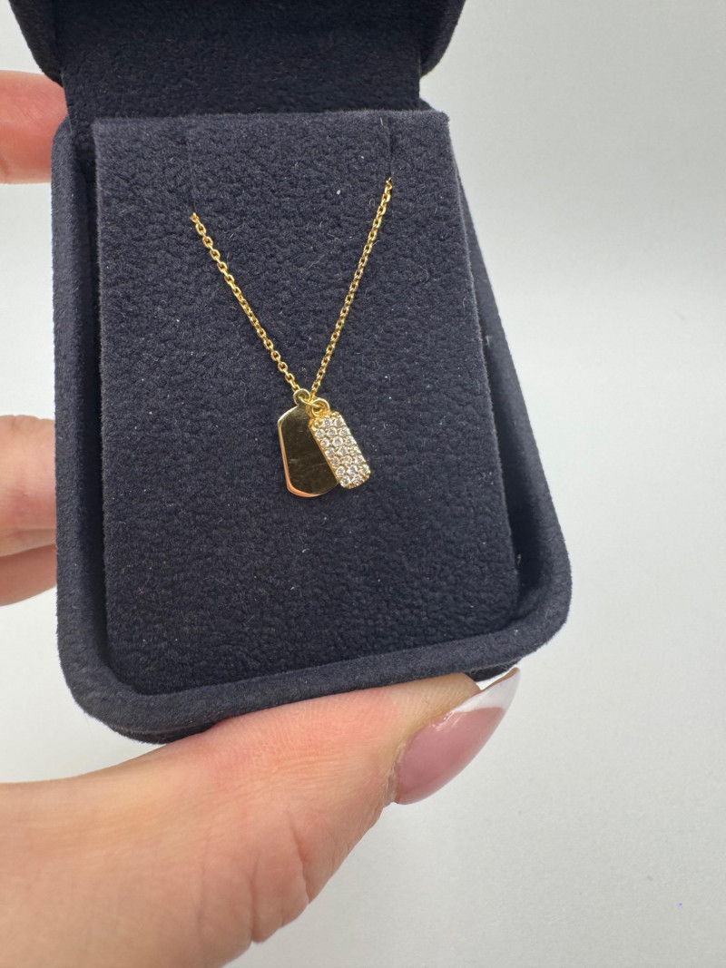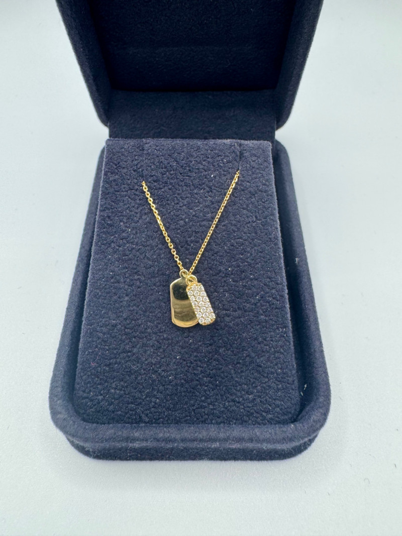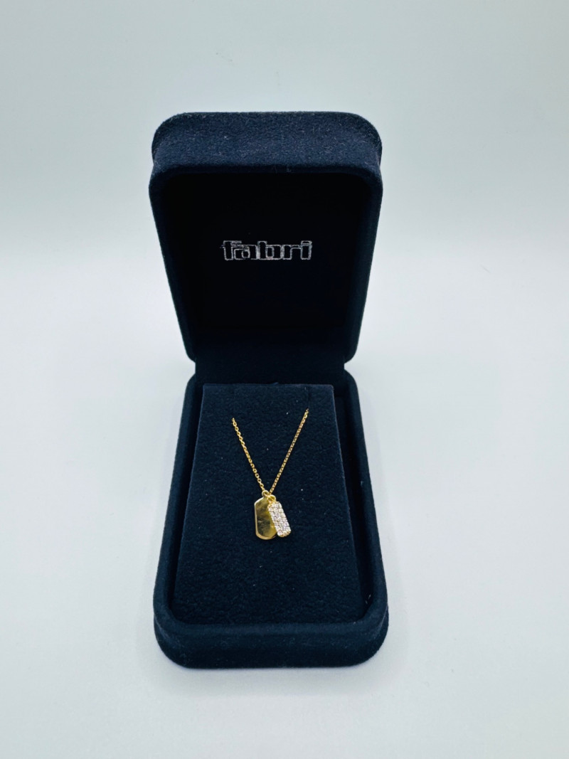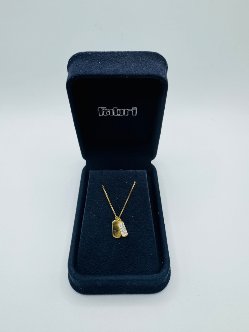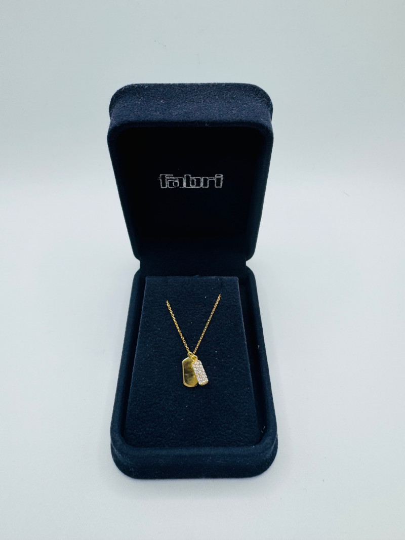 14K Gold Fabri Diamond Dog Tag Pendant Necklace - Turkey 2.24g. Marked 14K gold, made in Turkey Brand: Fabri Double pendant dog tag style One plain polished tag One diamond pavé tag (sparkly stones) Adjustable chain 16–18 inches Total weight approx. 2.24 grams Includes Fabri jewelry box