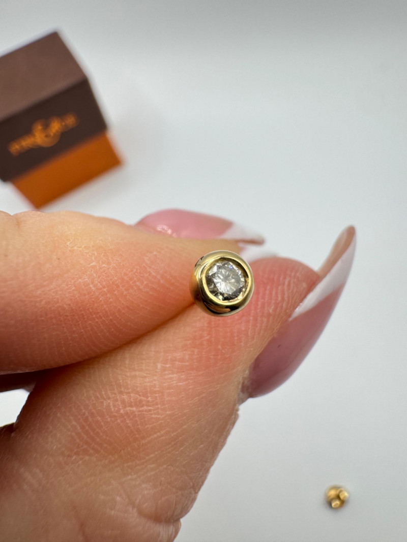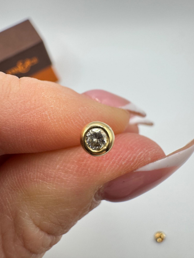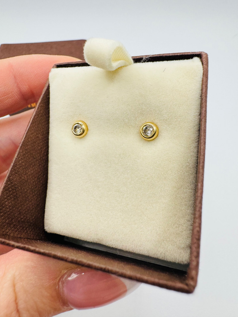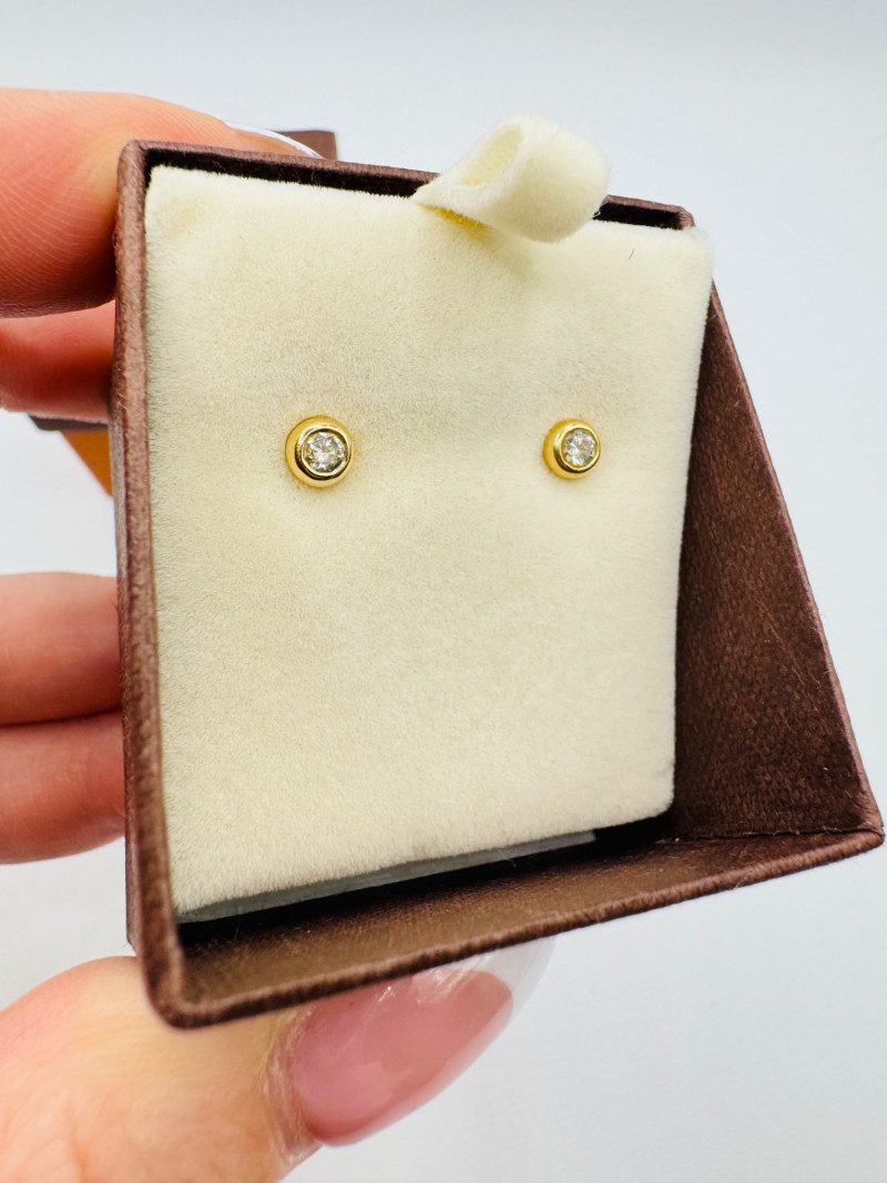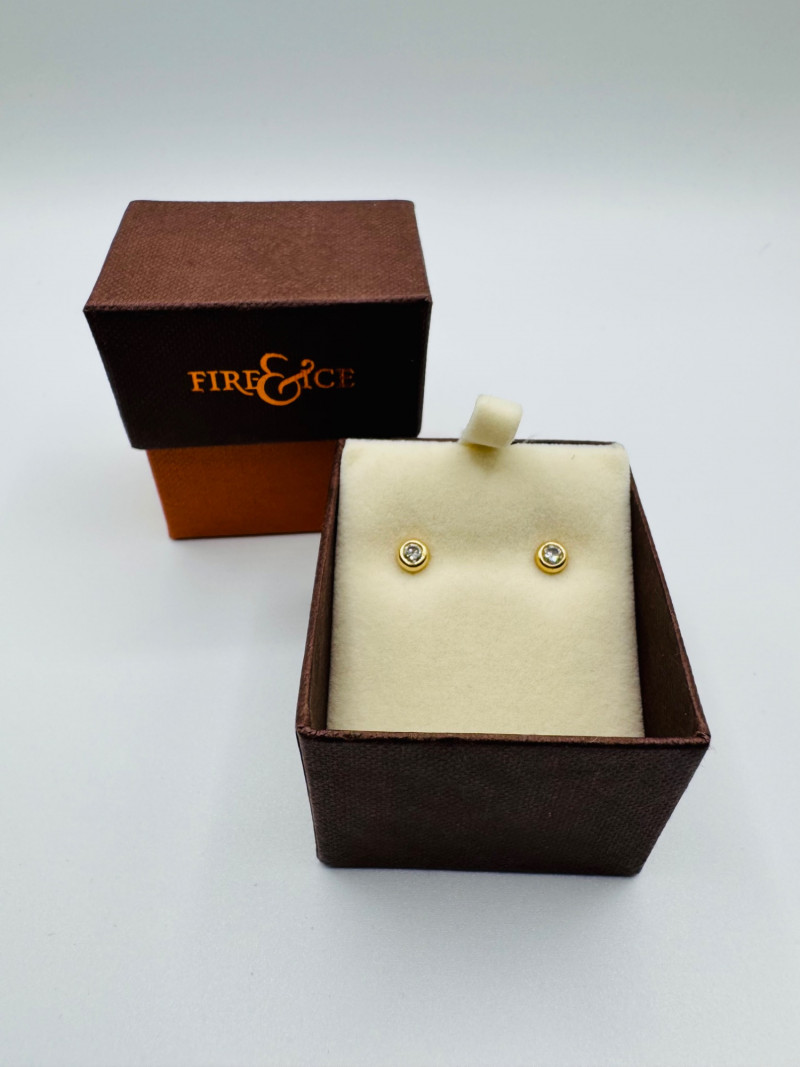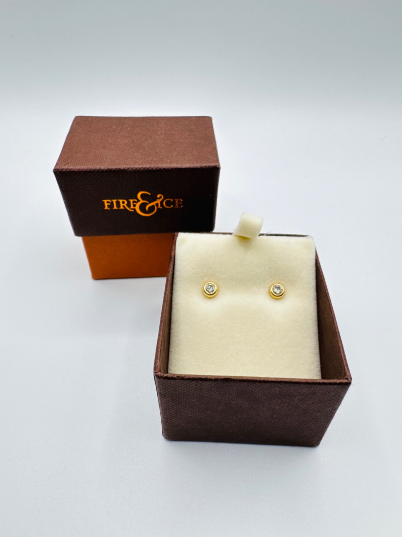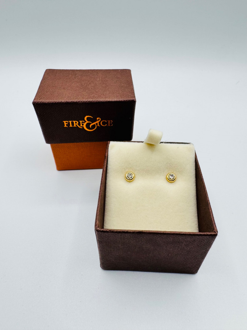 Fire & Ice 14K Gold & Diamond Stud Earrings, .20ctw Bezel Set. Disclaimer: The jewelry in this auction lot has not been tested. By placing a bid, you agree to purchase the item as is, with no guarantees regarding metal quality, content, or purity. Refunds will not be issued on these factors.