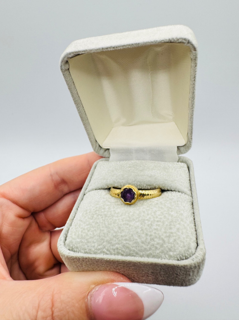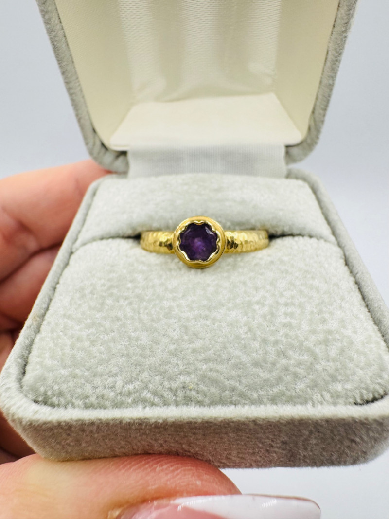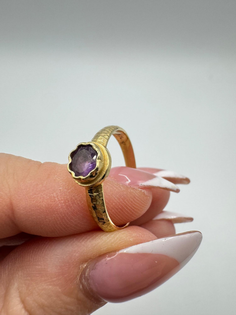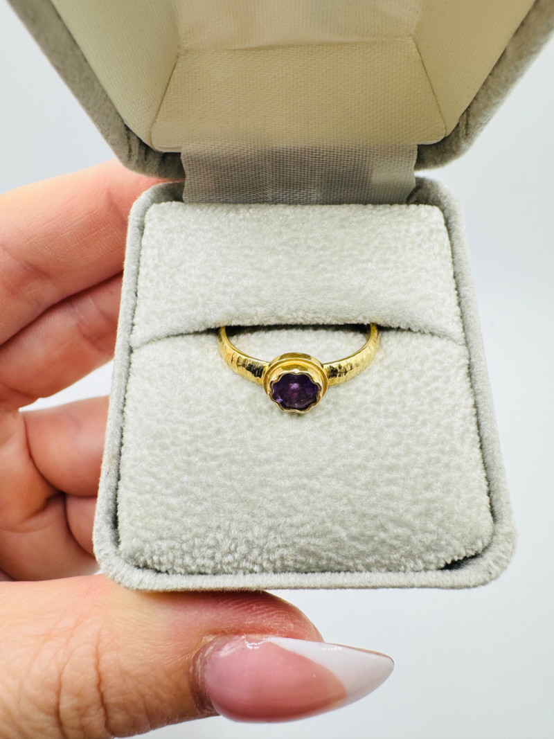 14K Gold Amethyst Ring w/ Hammered Band – Size 8, 2.73g. Disclaimer: The jewelry in this auction lot has not been tested. By placing a bid, you agree to purchase the item as is, with no guarantees regarding metal quality, content, or purity. Refunds will not be issued on these factors.