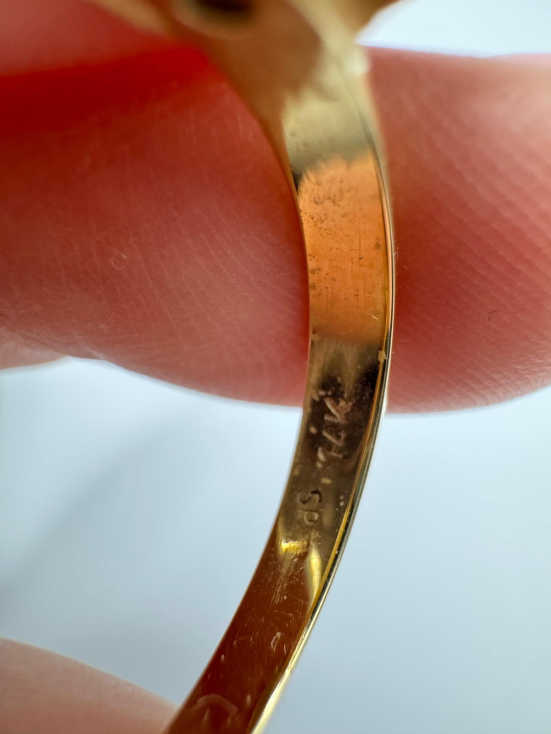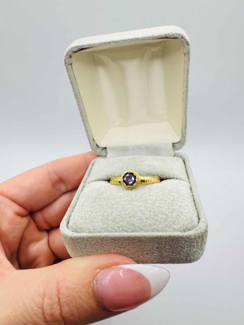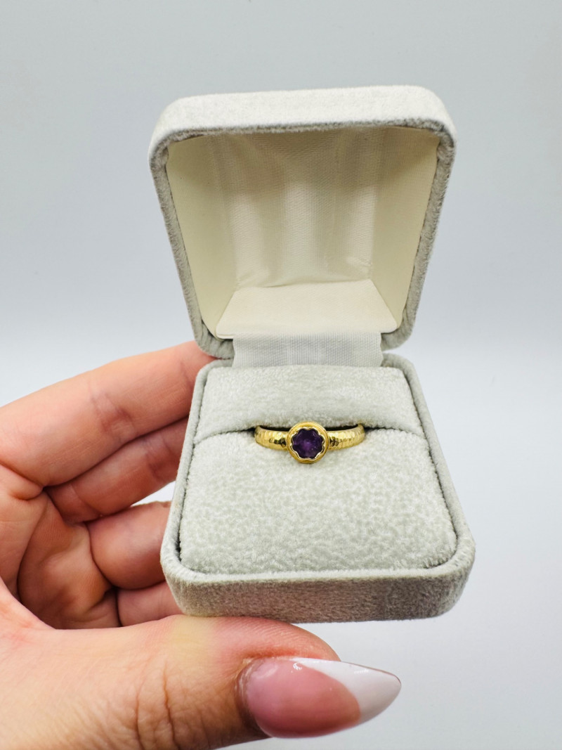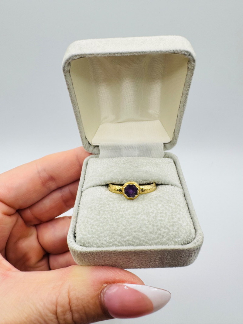 14K Gold Amethyst Ring w/ Hammered Band – Size 8, 2.73g. Disclaimer: The jewelry in this auction lot has not been tested. By placing a bid, you agree to purchase the item as is, with no guarantees regarding metal quality, content, or purity. Refunds will not be issued on these factors.