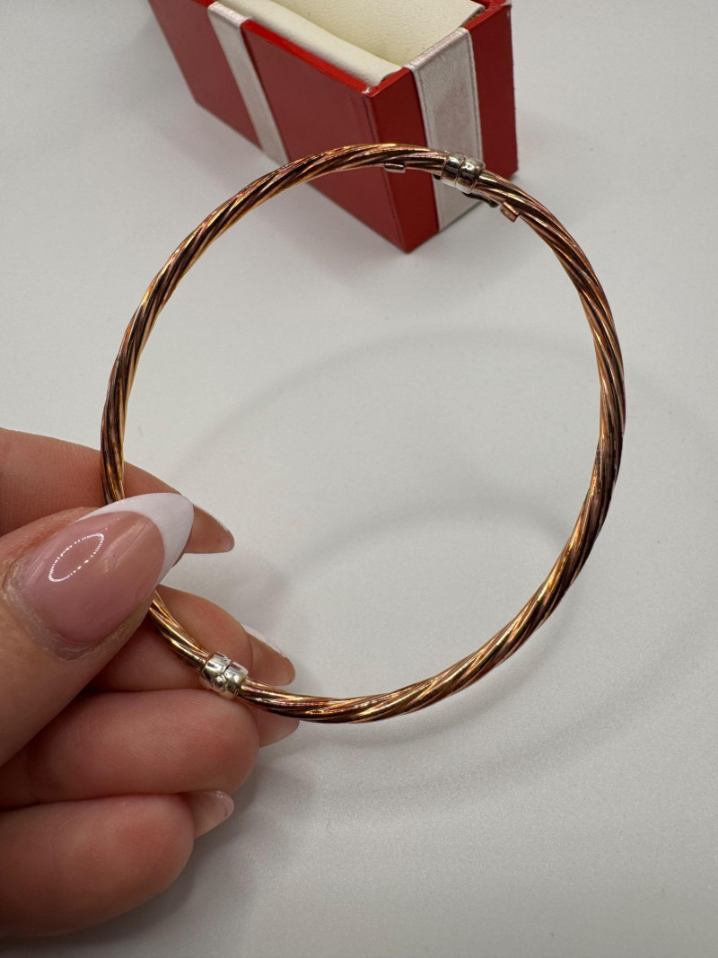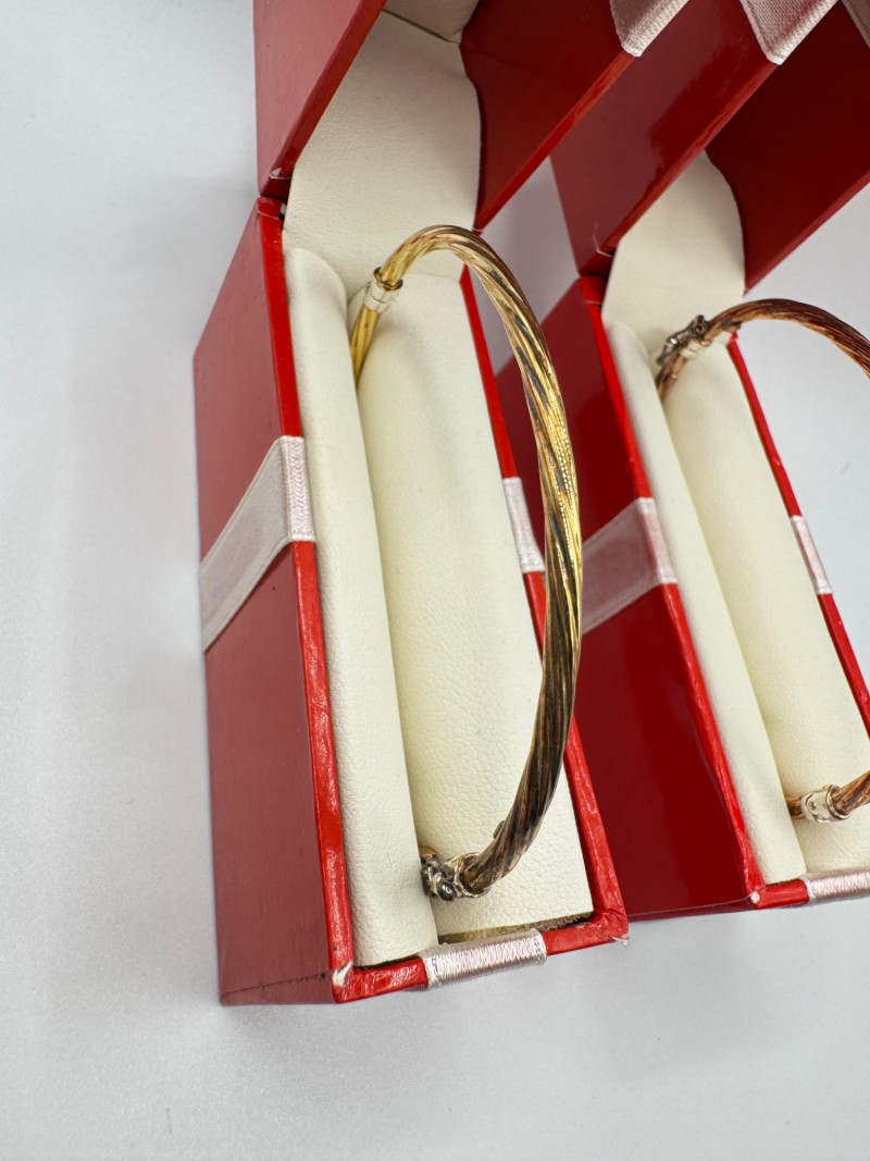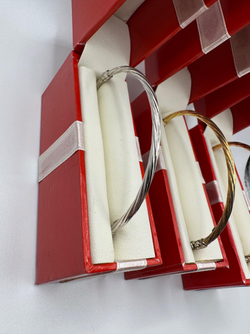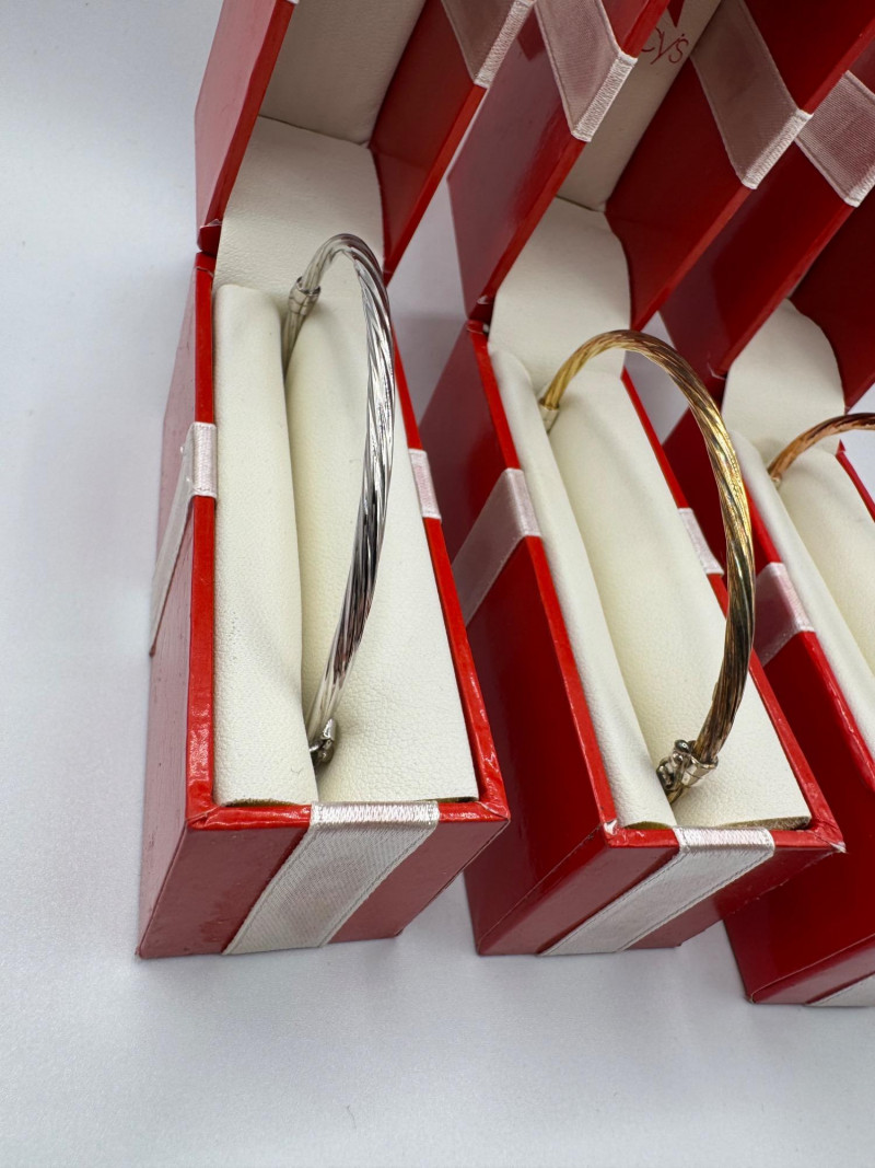 Set of 3 Sterling Silver Bangles, Italy – Silver, Gold & Rose Tones. Disclaimer: The jewelry in this auction lot has not been tested. By placing a bid, you agree to purchase the item as is, with no guarantees regarding metal quality, content, or purity. Refunds will not be issued on these factors.
