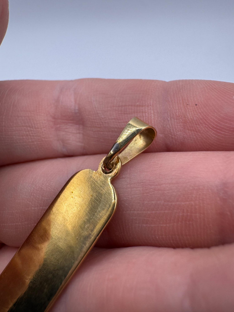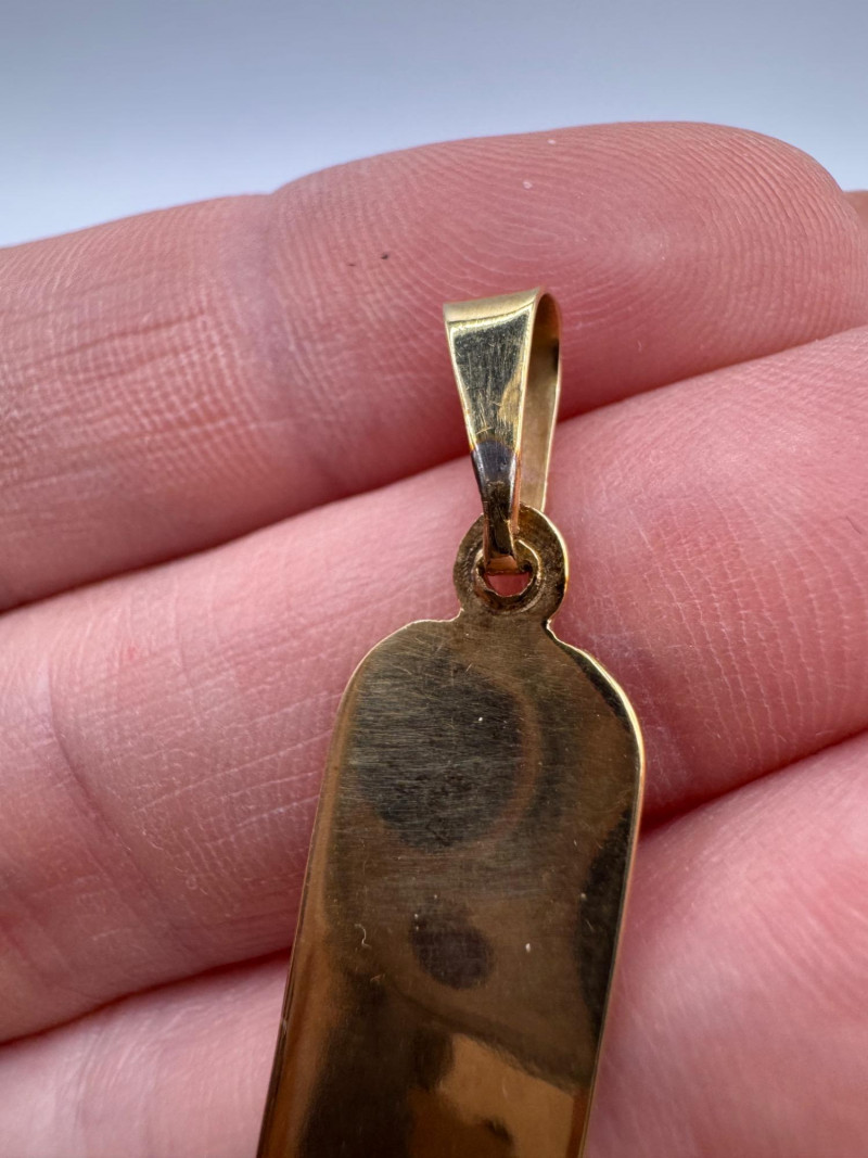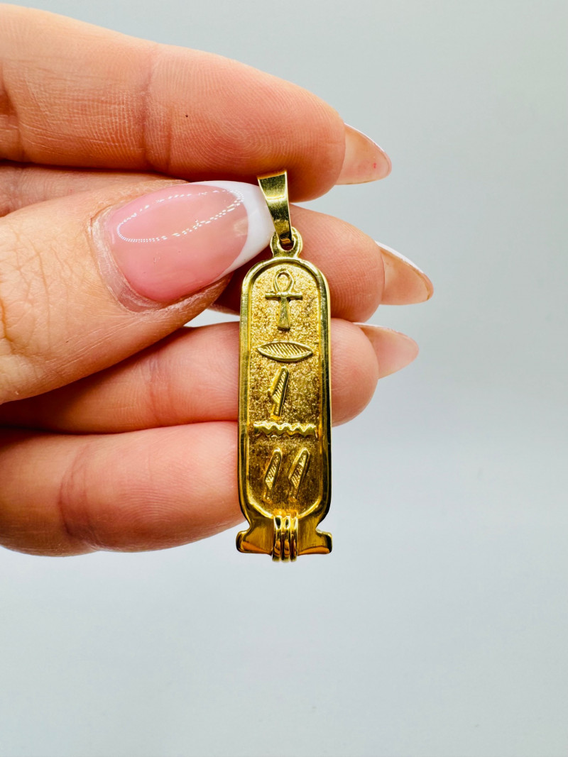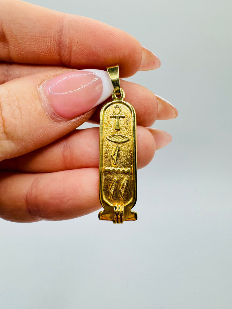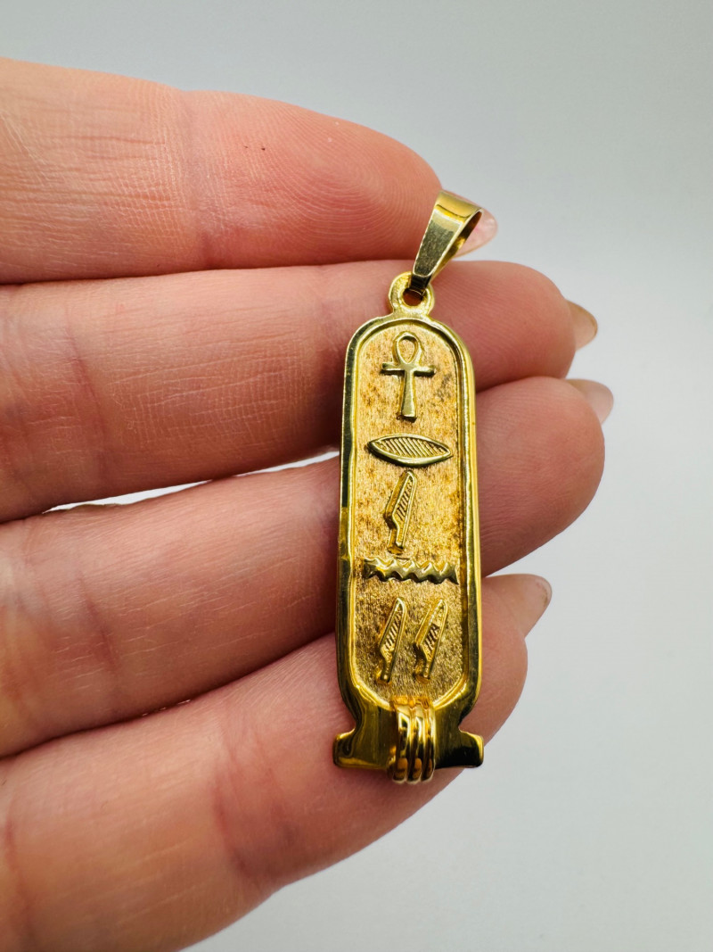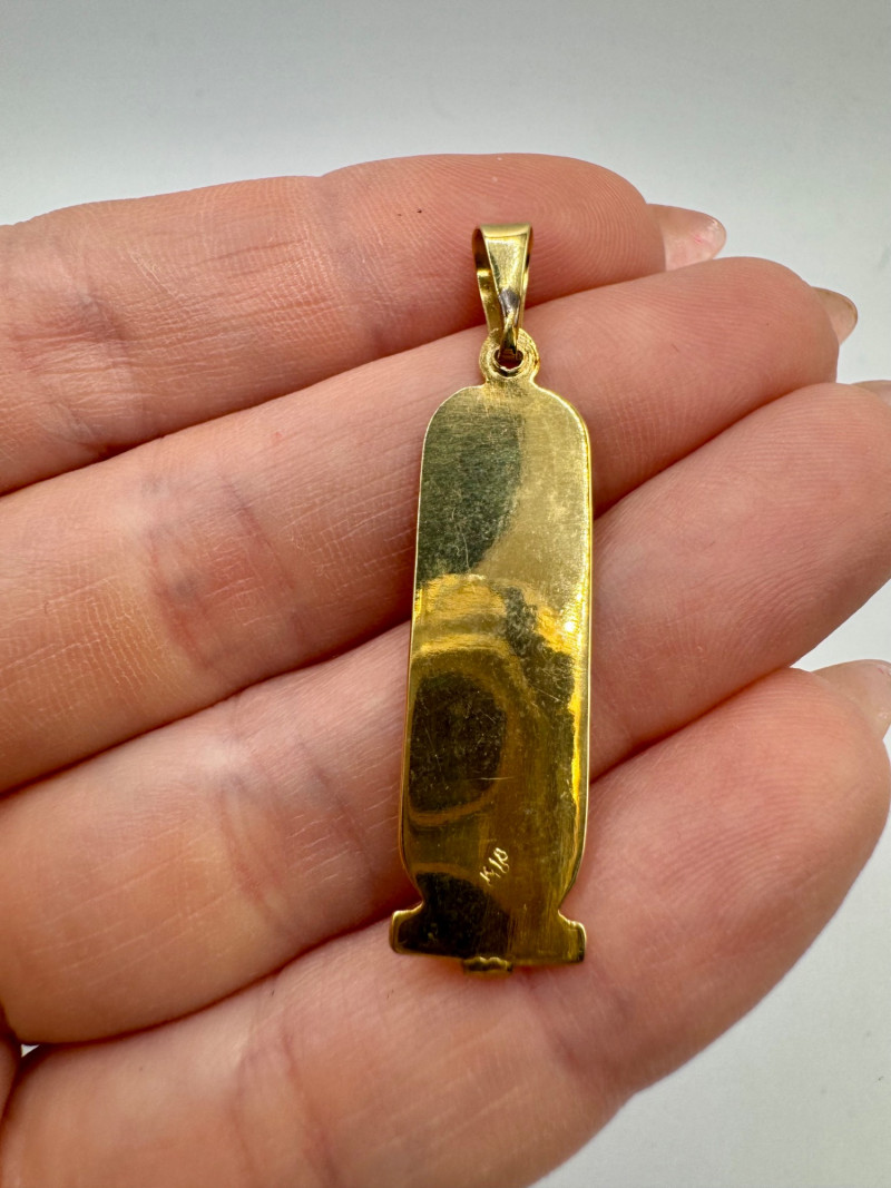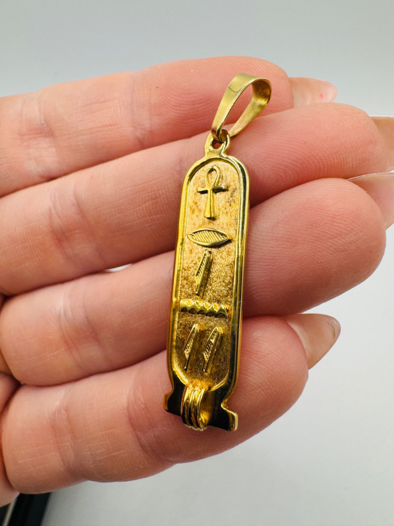 18K Gold Egyptian Cartouche Pendant, 1.25”Long, 3.55g. Disclaimer: The jewelry in this auction lot has not been tested. By placing a bid, you agree to purchase the item as is, with no guarantees regarding metal quality, content, or purity. Refunds will not be issued on these factors.