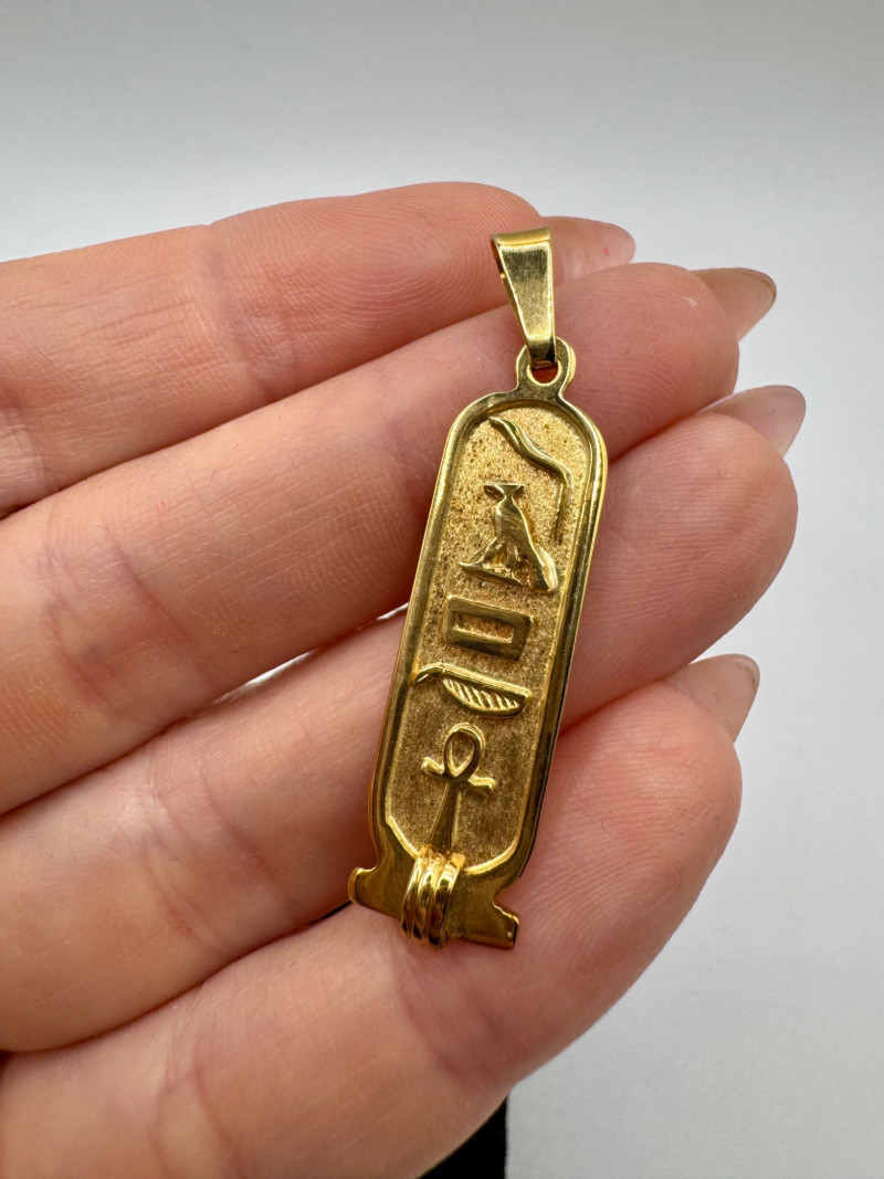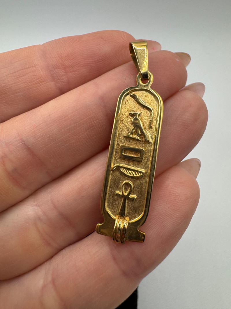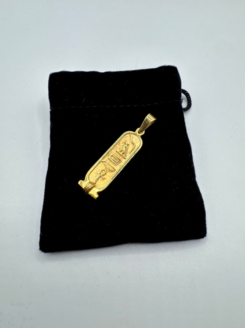 18K Gold Egyptian Cartouche Pendant w/ Hieroglyphs, 3.51g. Disclaimer: The jewelry in this auction lot has not been tested. By placing a bid, you agree to purchase the item as is, with no guarantees regarding metal quality, content, or purity. Refunds will not be issued on these factors.