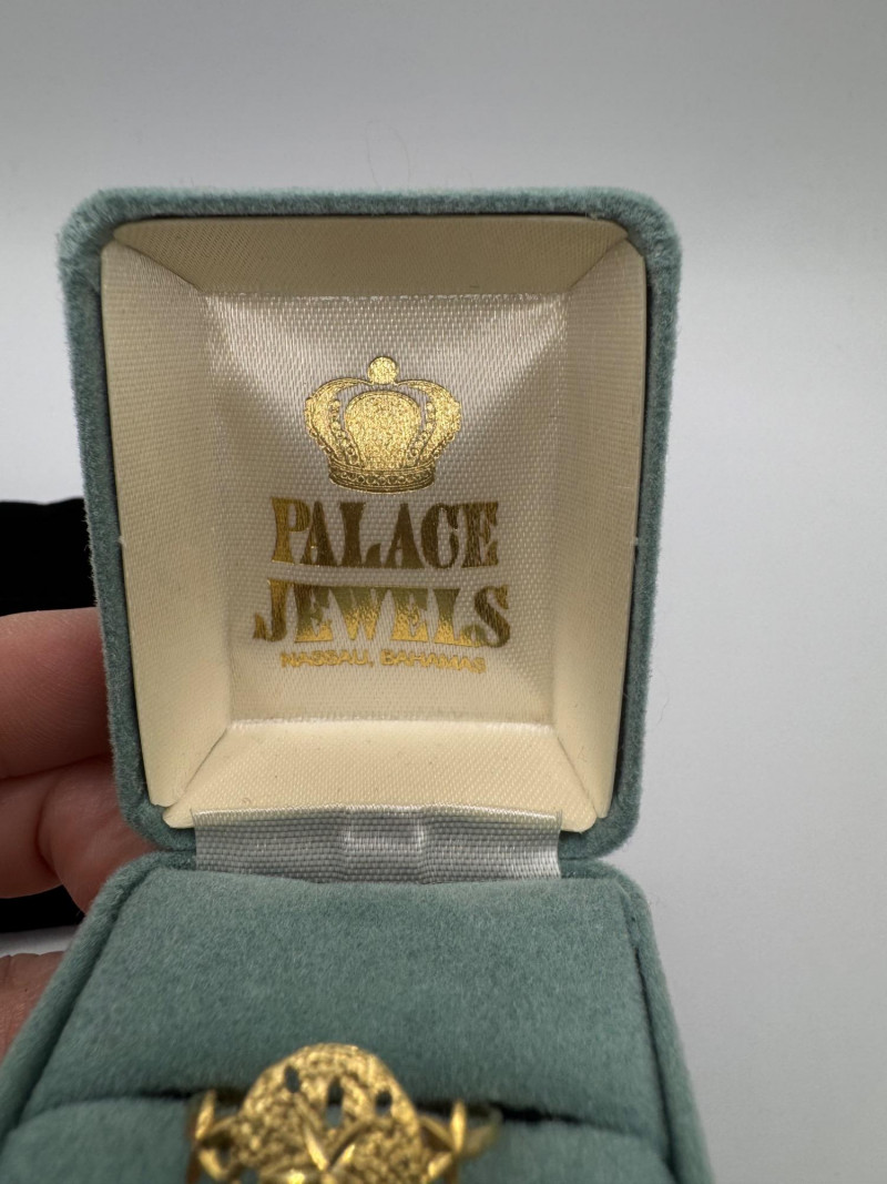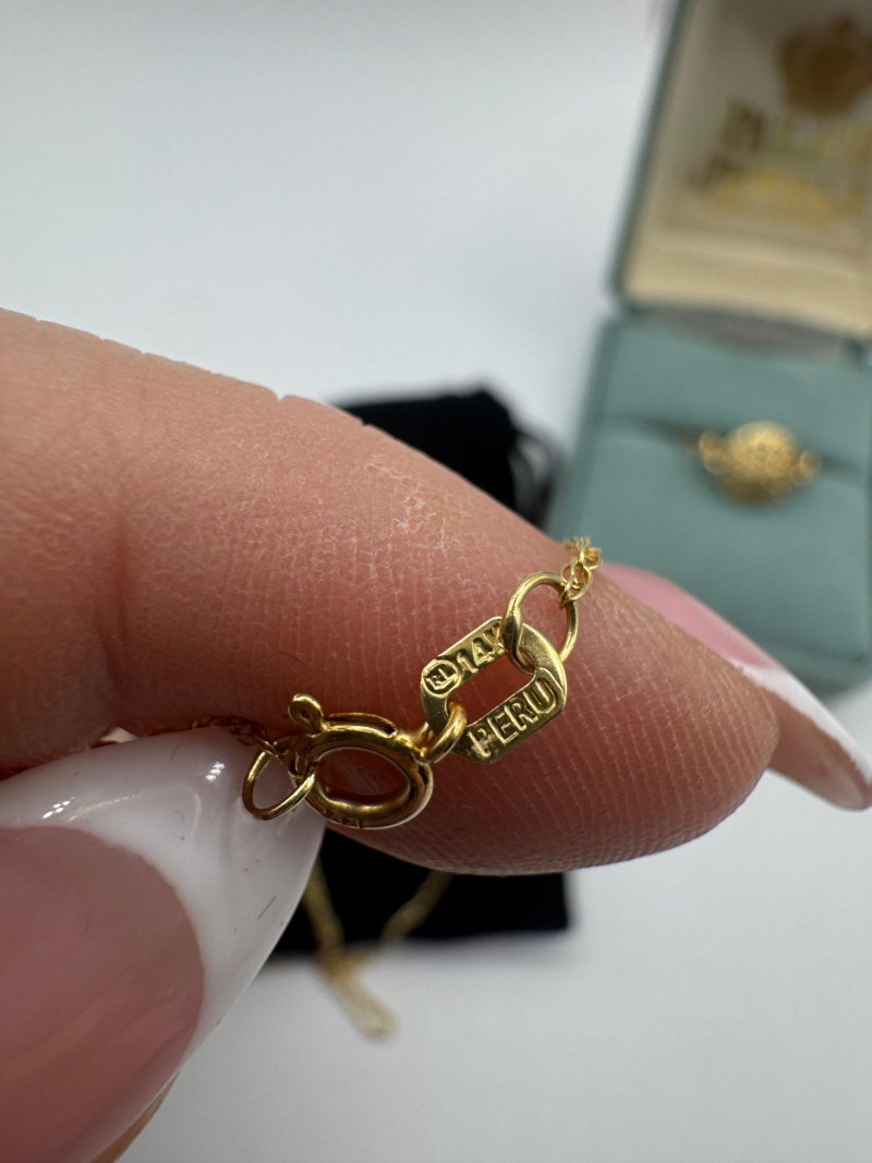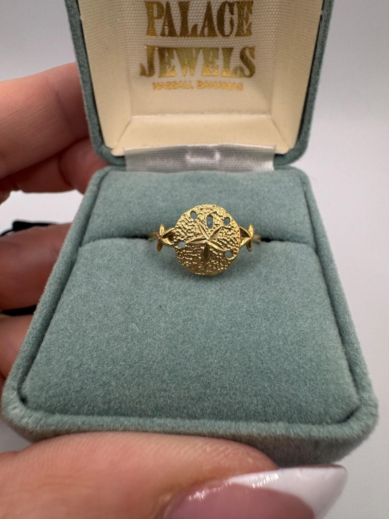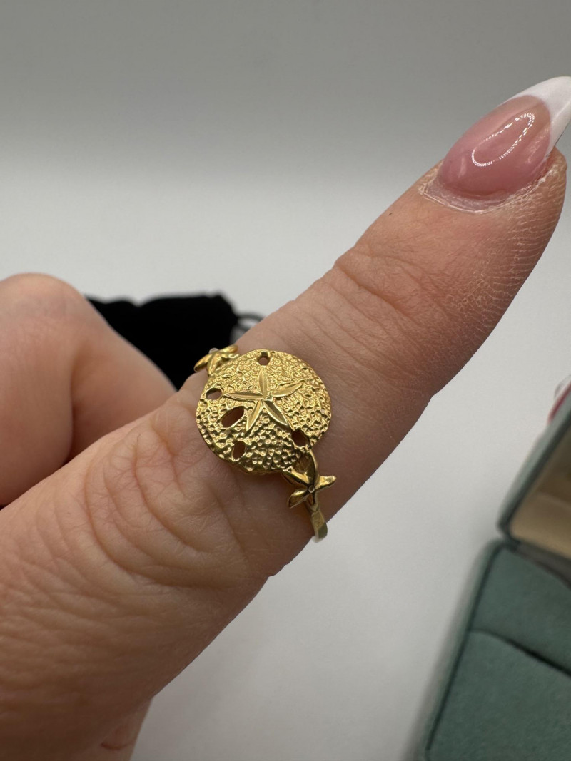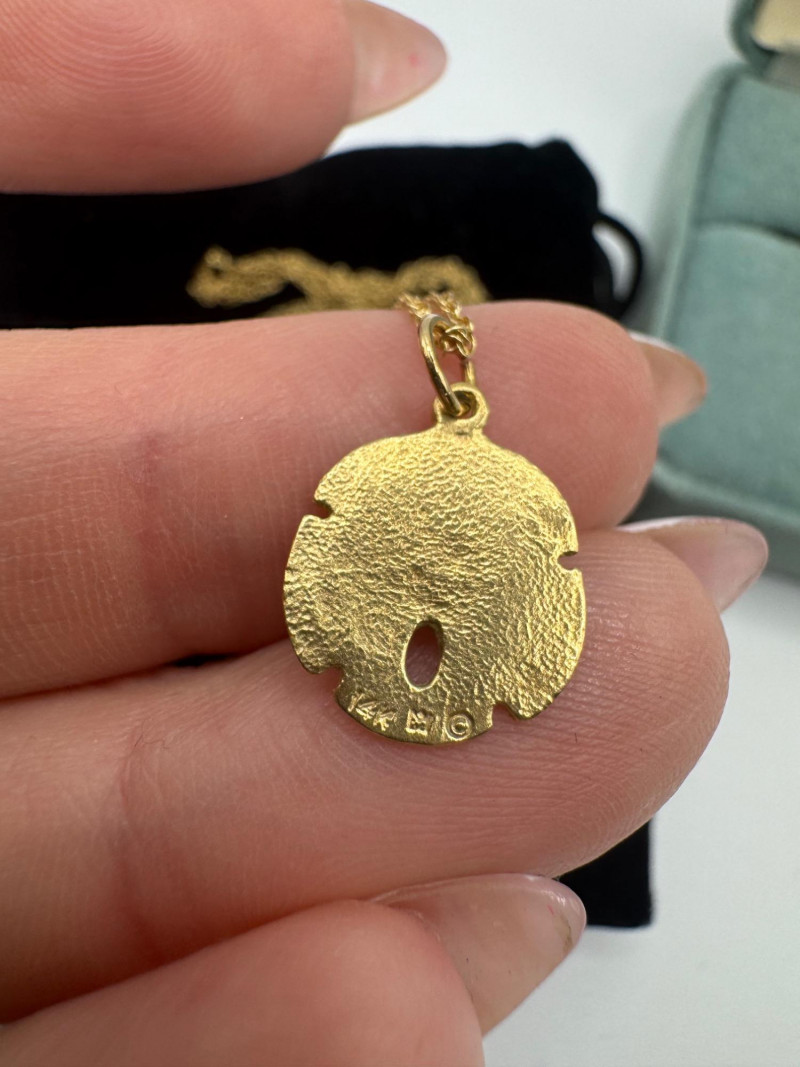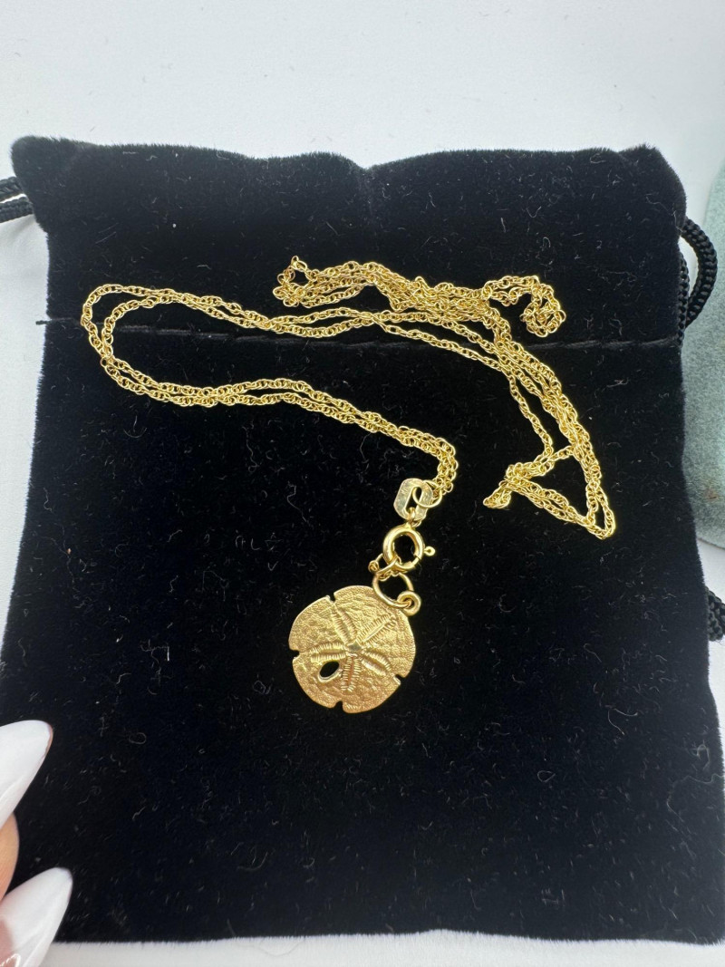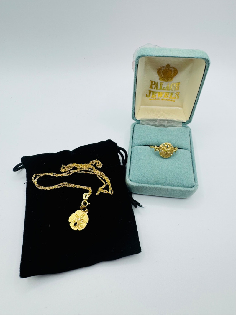 14K Gold Sand Dollar Ring & Necklace Set – Peru/Bahamas, Total 3.40g. Disclaimer: The jewelry in this auction lot has not been tested. By placing a bid, you agree to purchase the item as is, with no guarantees regarding metal quality, content, or purity. Refunds will not be issued on these factors.