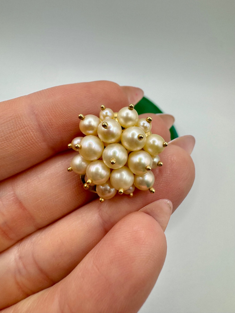 Vintage 14K Gold Cluster Pearl Clip-On Earrings w/ Green Pouch. Disclaimer: The jewelry in this auction lot has not been tested. By placing a bid, you agree to purchase the item as is, with no guarantees regarding metal quality, content, or purity. Refunds will not be issued on these factors.