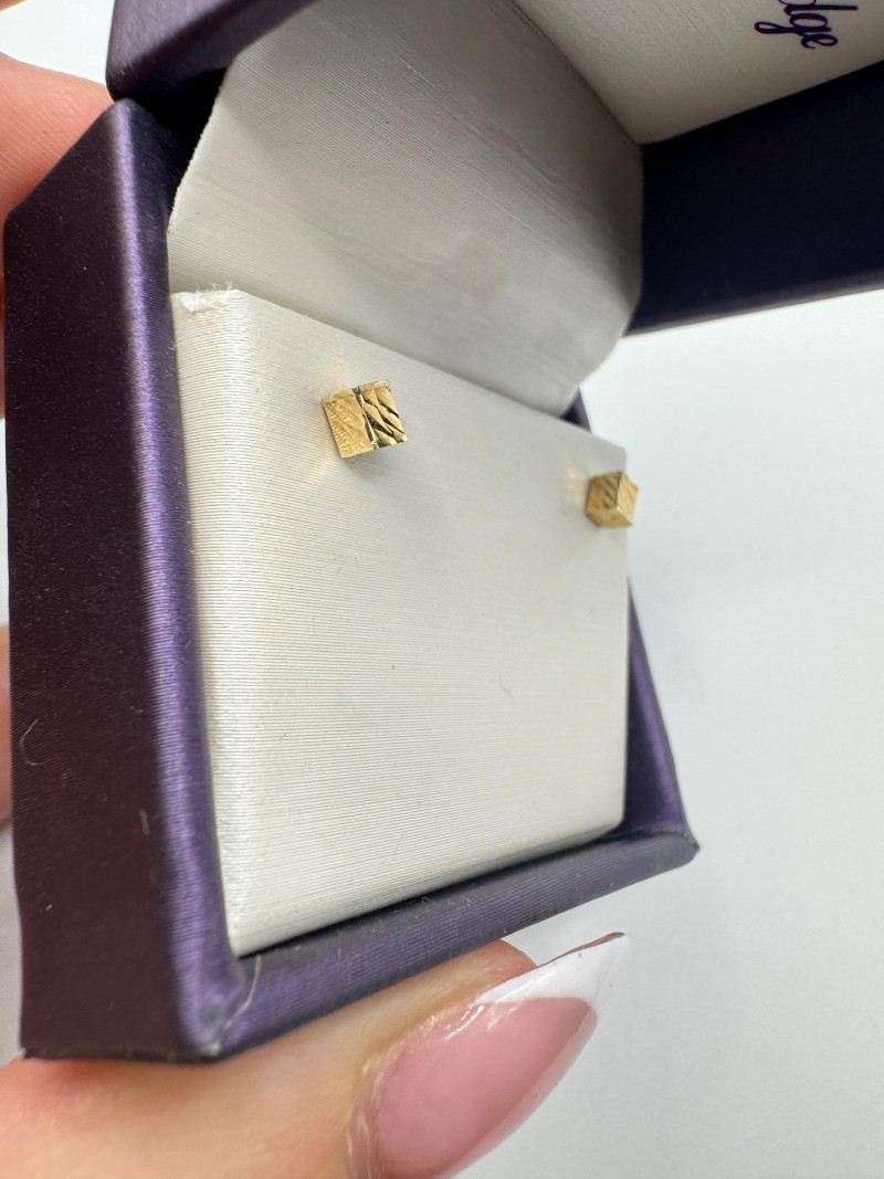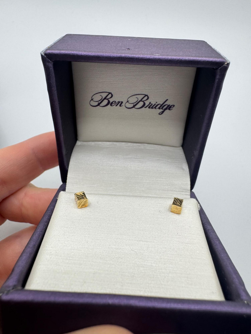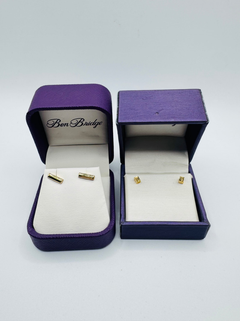 2 Pairs Ben Bridge 14k Yellow Gold Stud Earrings – Bar & Geometric. Disclaimer: The jewelry in this auction lot has not been tested. By placing a bid, you agree to purchase the item as is, with no guarantees regarding metal quality, content, or purity. Refunds will not be issued on these factors.
