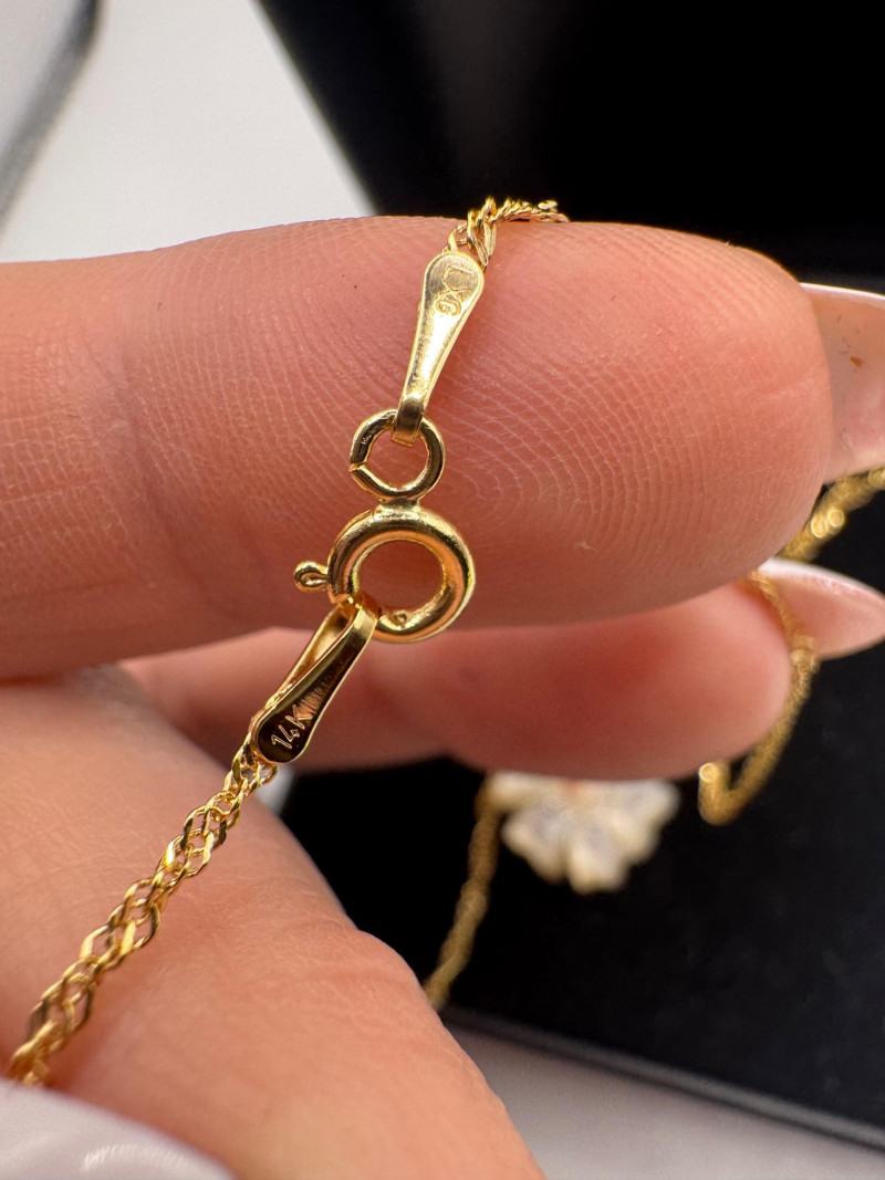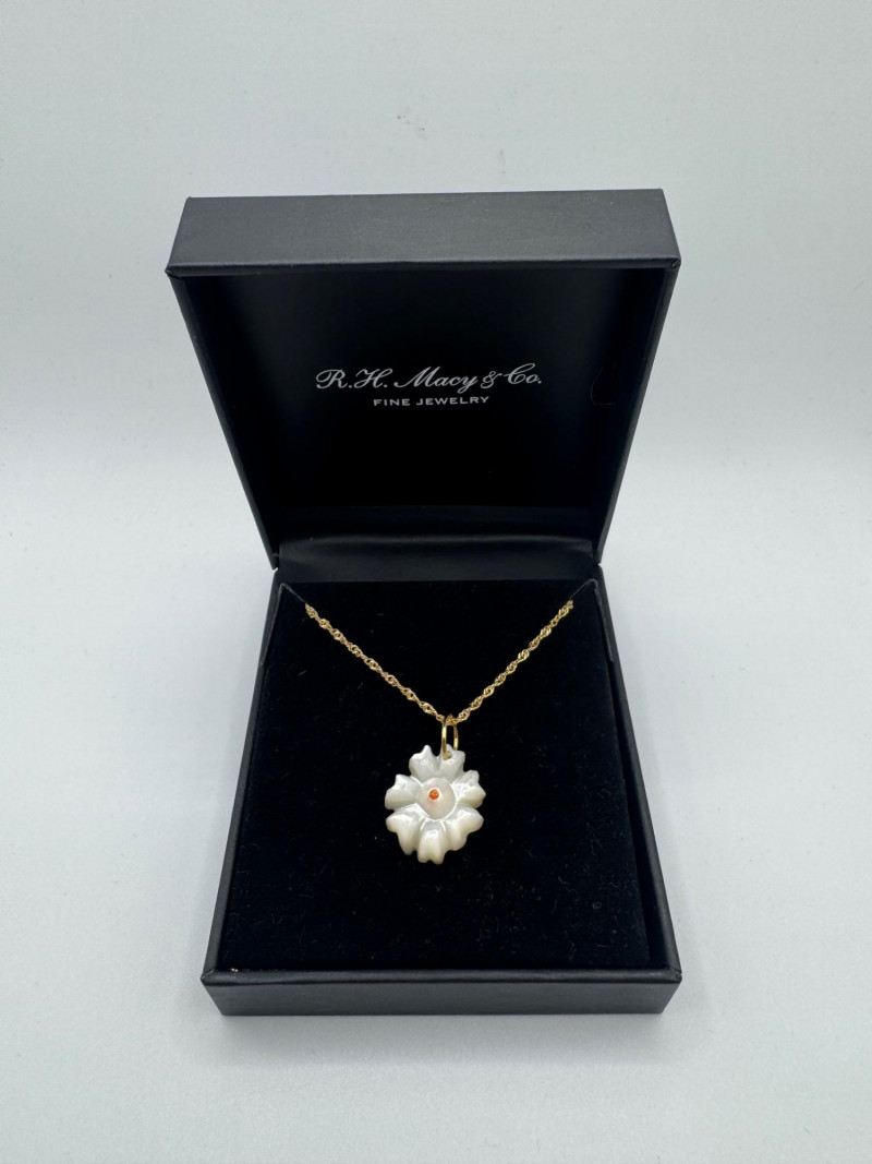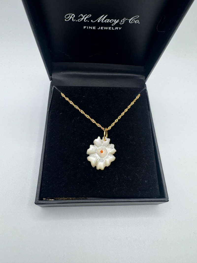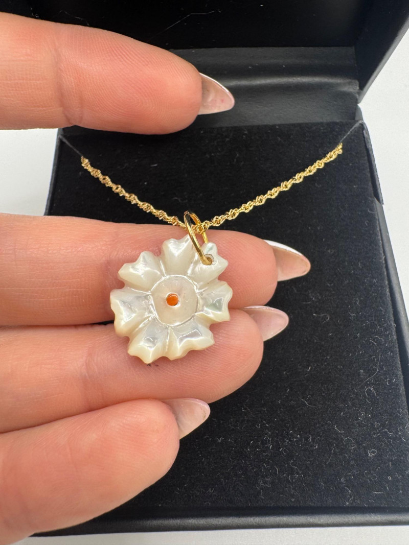 St. Marten 14K Gold Singapore Chain w/ Abalone & Coral Charm. Disclaimer: The jewelry in this auction lot has not been tested. By placing a bid, you agree to purchase the item as is, with no guarantees regarding metal quality, content, or purity. Refunds will not be issued on these factors.