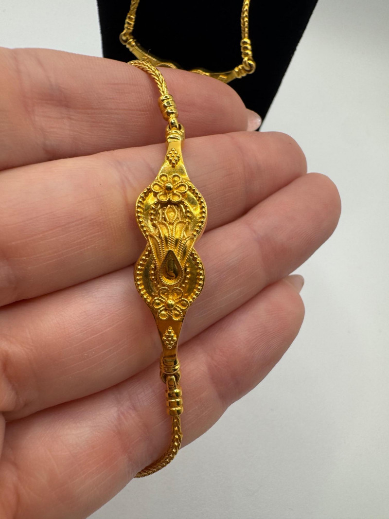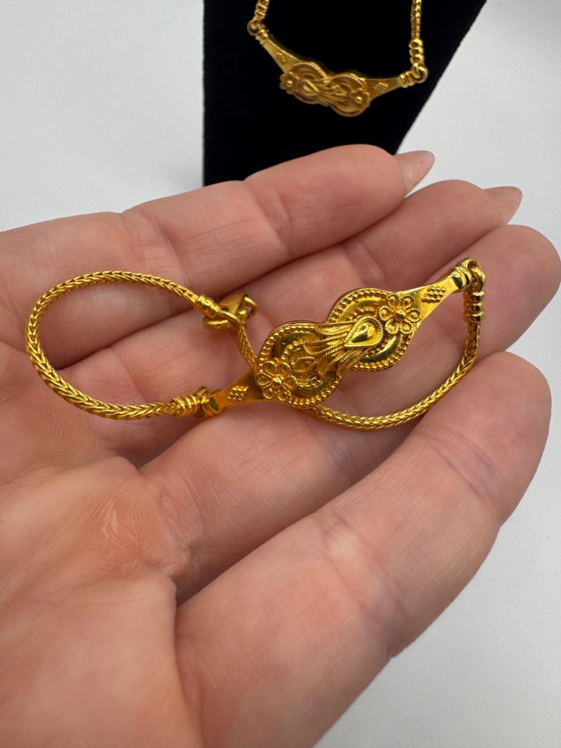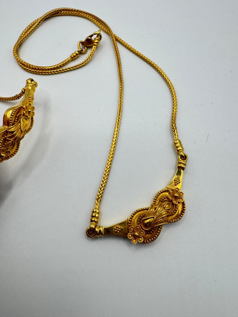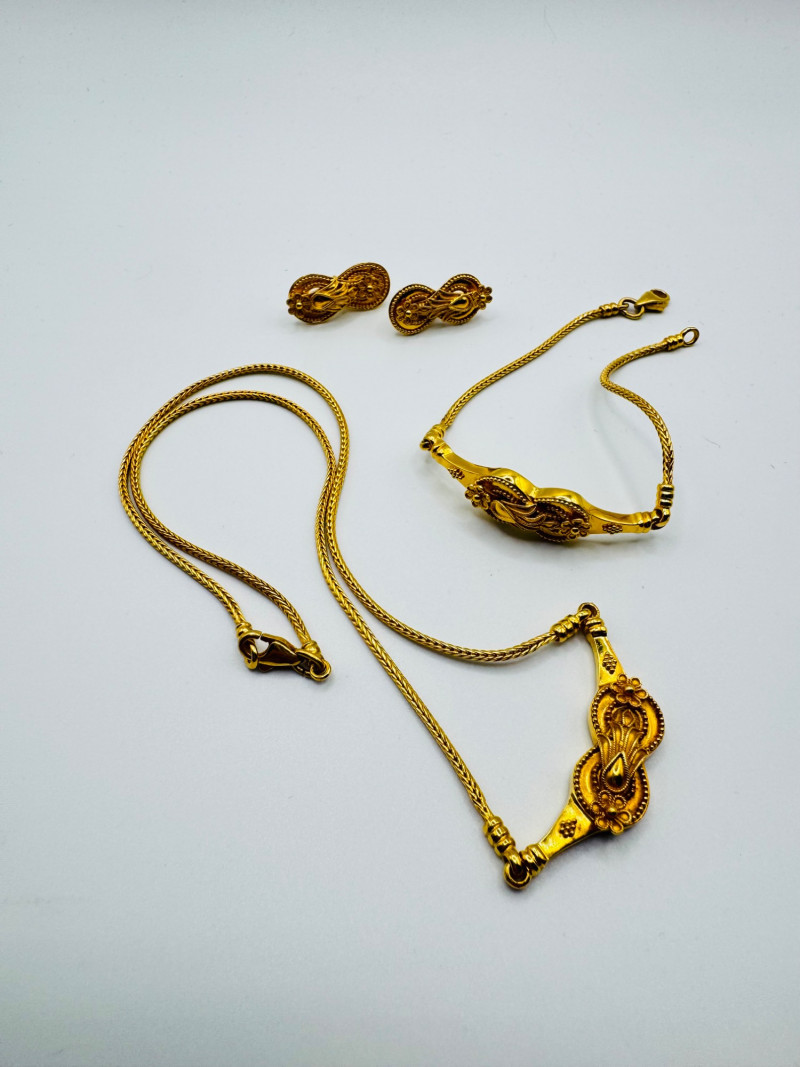 20k Gold Saudi Necklace, Bracelet & Earrings Set 34.71g. Disclaimer: By placing a bid, you agree to purchase the item as is, with no guarantees regarding metal quality, content, or purity. Refunds will not be issued on these factors.