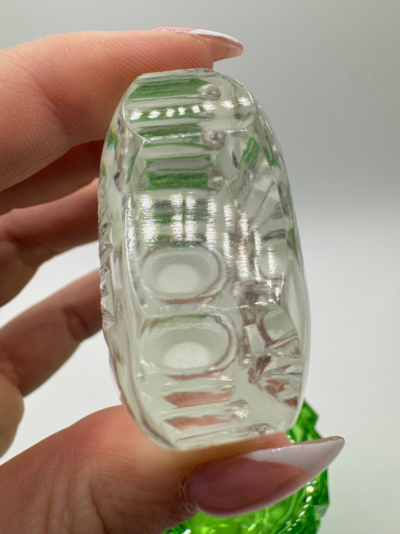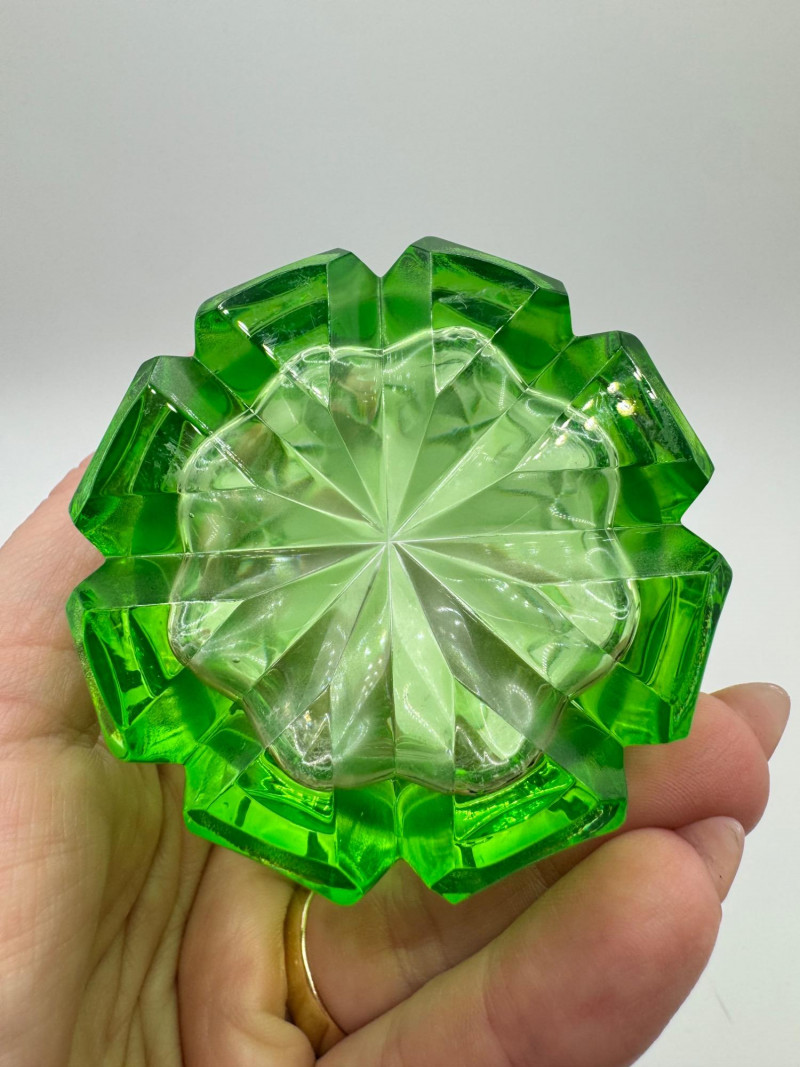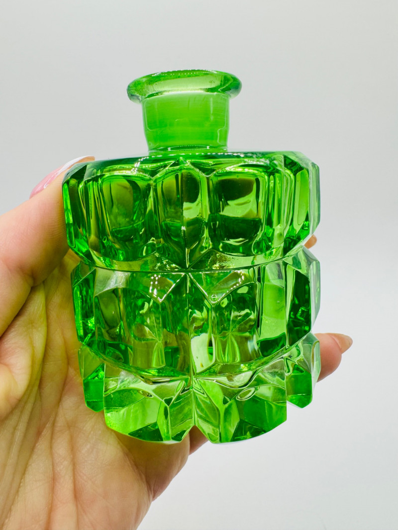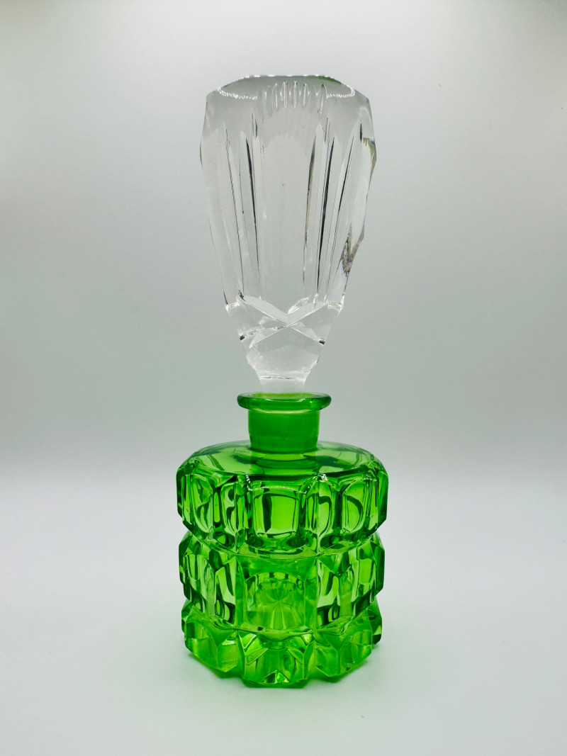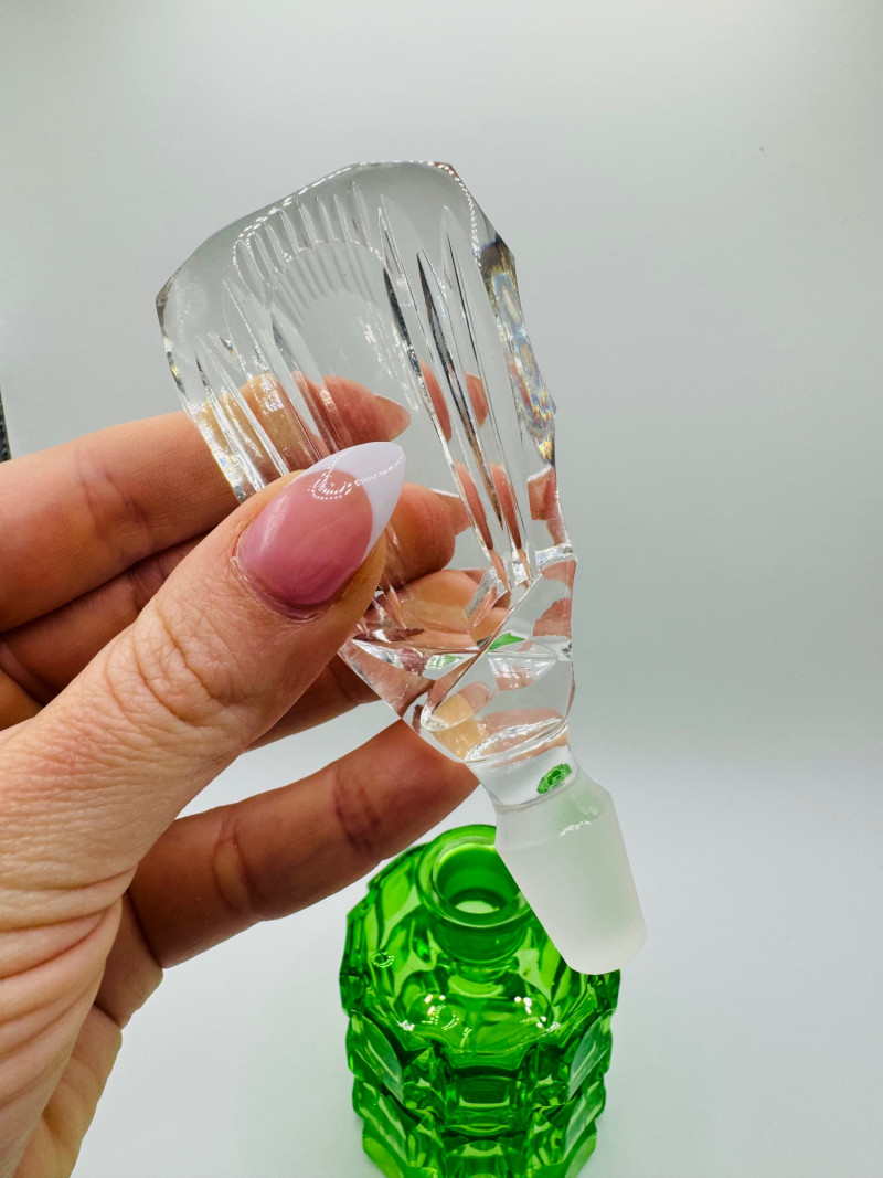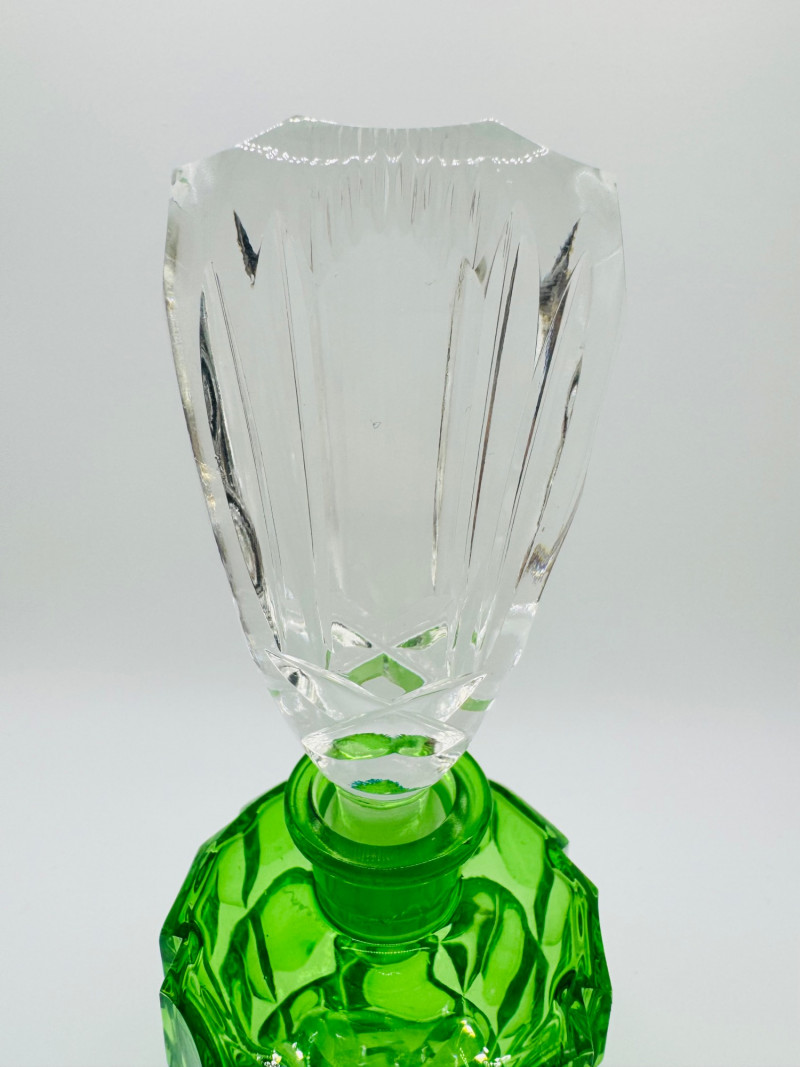 Vintage Green Cut Glass Perfume Bottle w/ Clear Faceted Stopper.