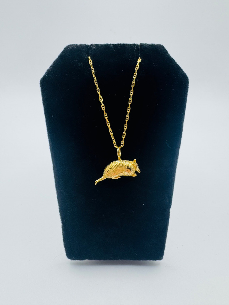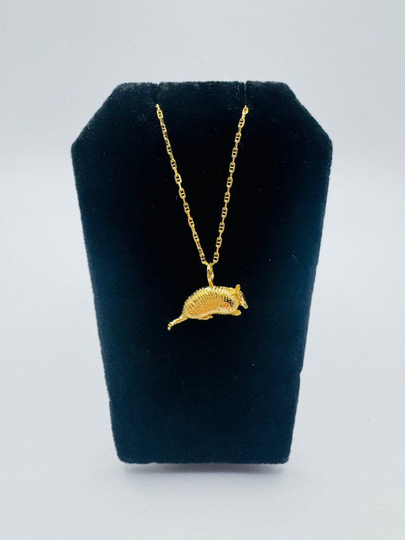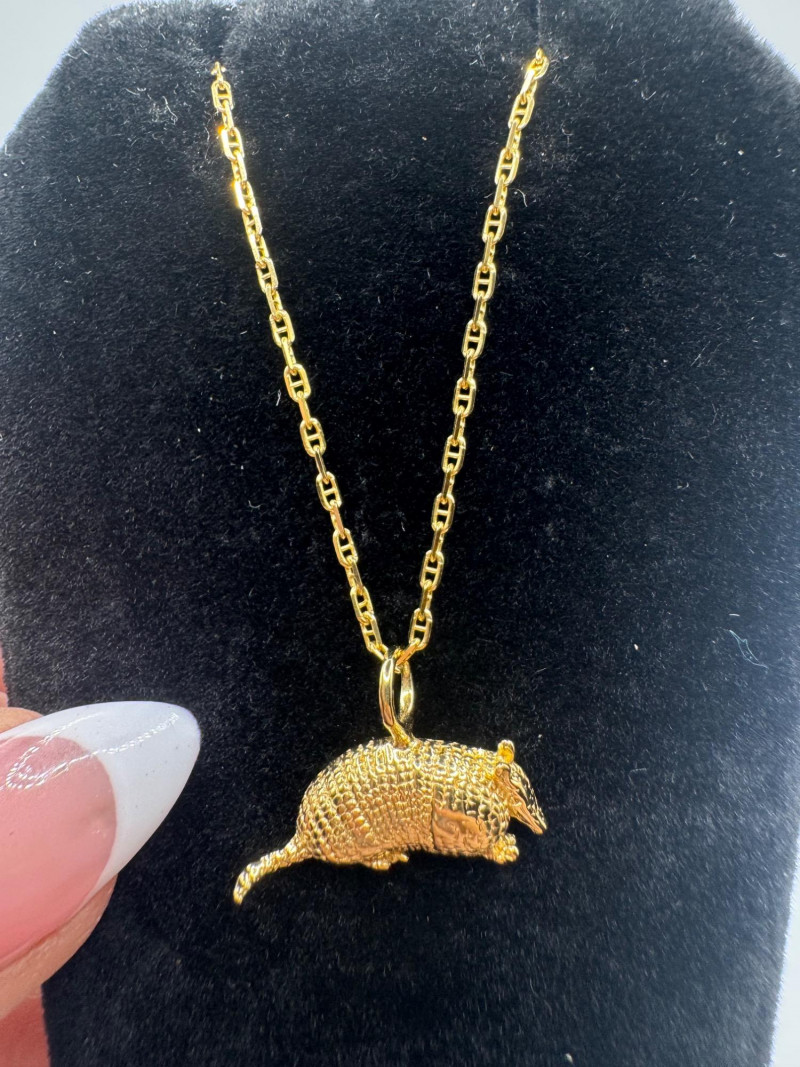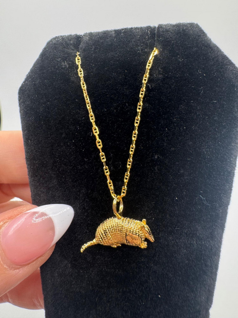 10K Armadillo Pendant (Israel) + 14K Sparkly Italy Chain, 2.97g. Disclaimer: The jewelry in this auction lot has not been tested. By placing a bid, you agree to purchase the item as is, with no guarantees regarding metal quality, content, or purity. Refunds will not be issued on these factors.