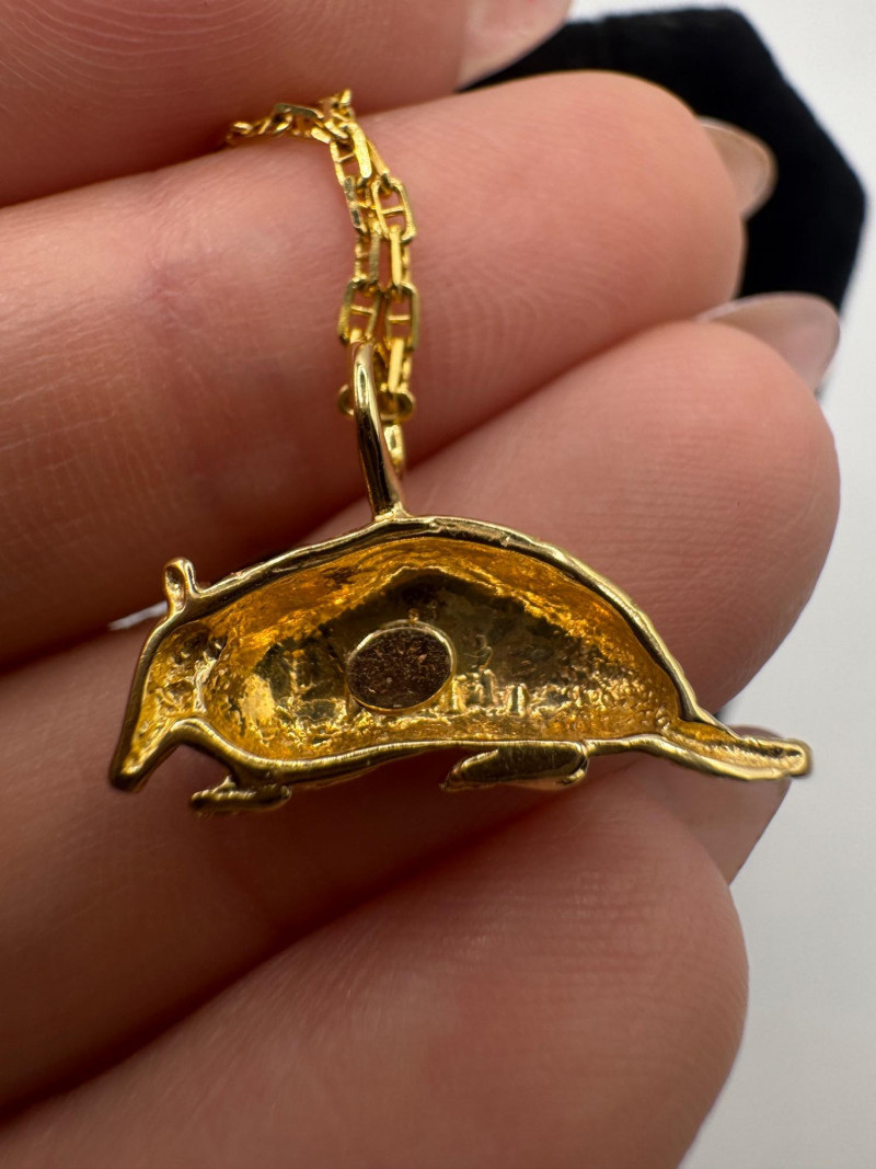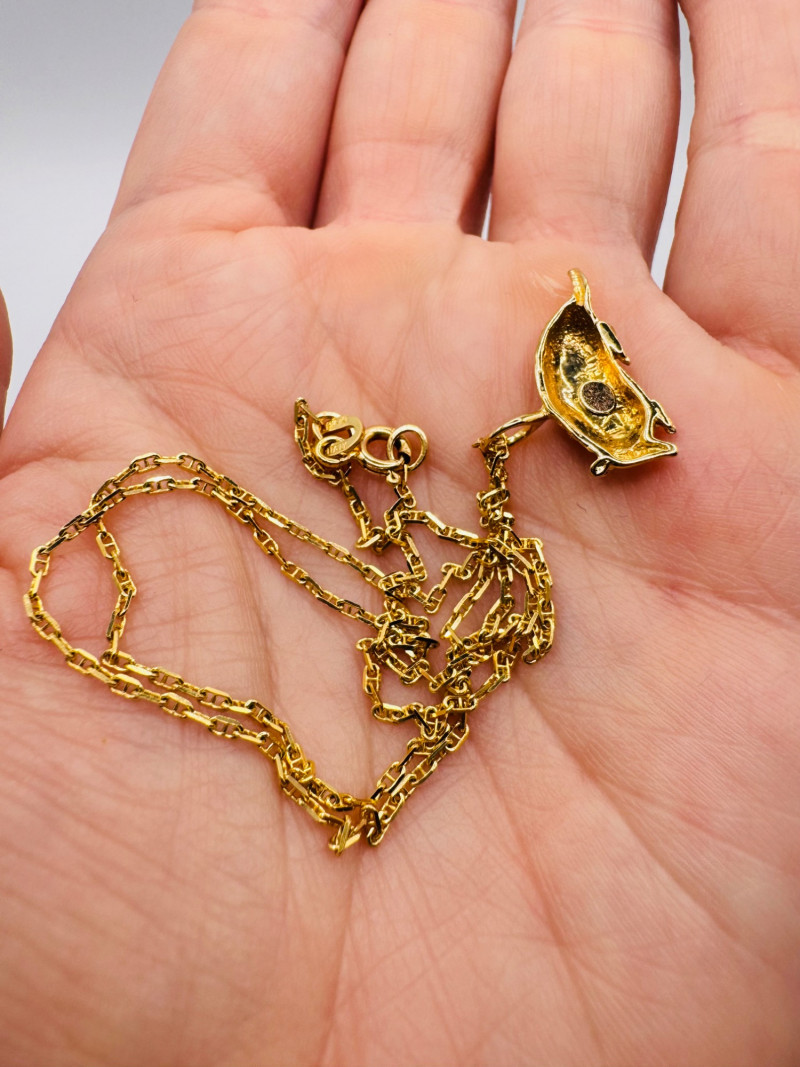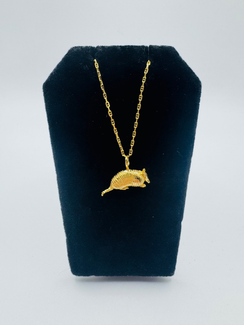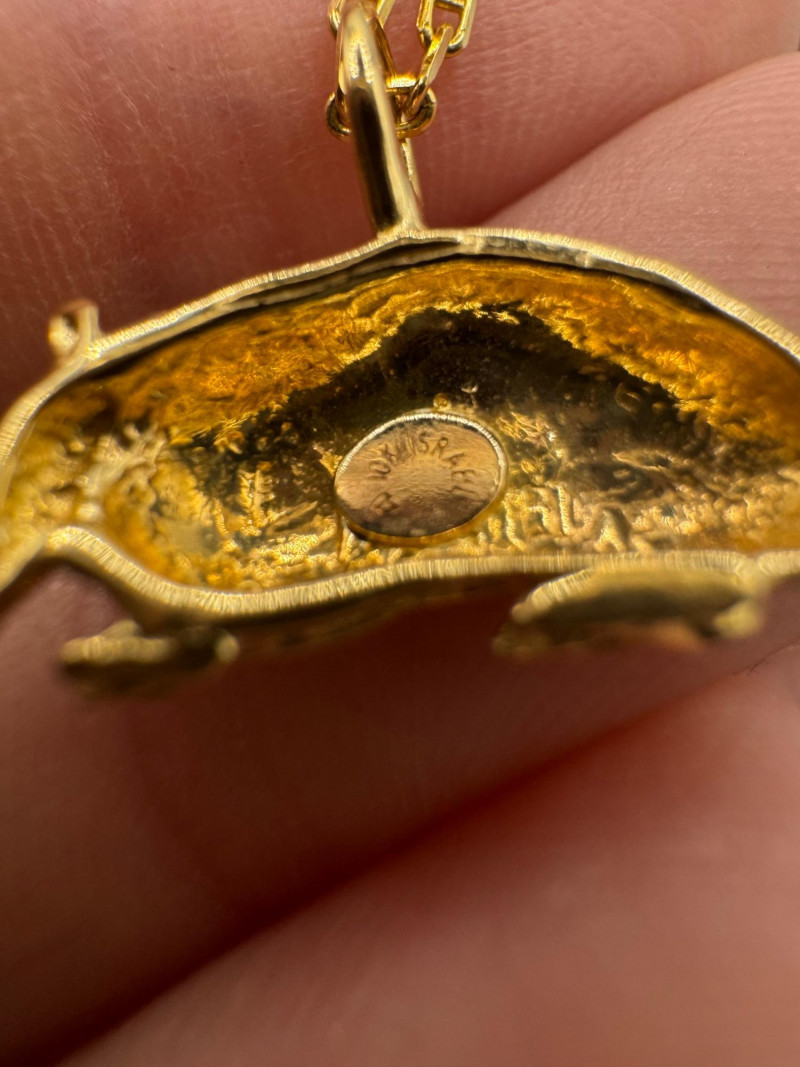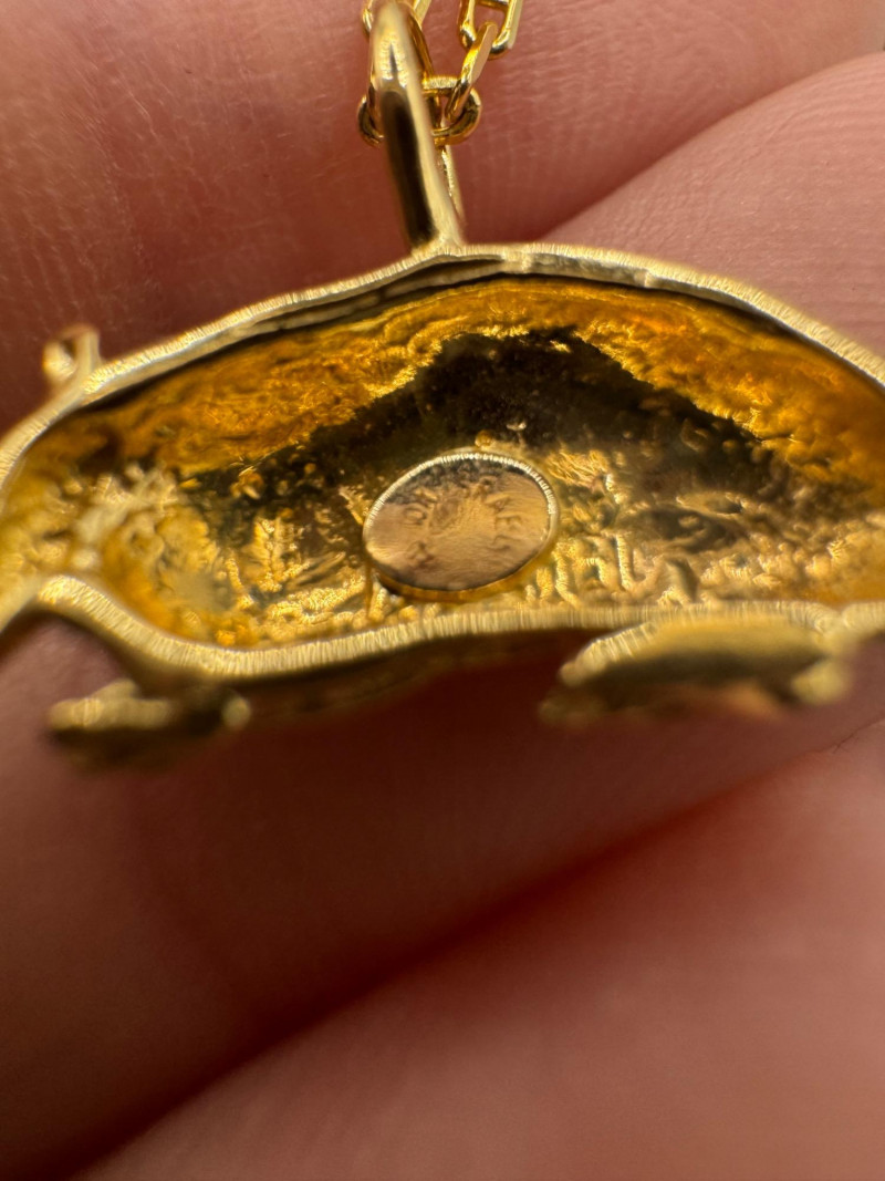 10K Armadillo Pendant (Israel) + 14K Sparkly Italy Chain, 2.97g. Disclaimer: The jewelry in this auction lot has not been tested. By placing a bid, you agree to purchase the item as is, with no guarantees regarding metal quality, content, or purity. Refunds will not be issued on these factors.