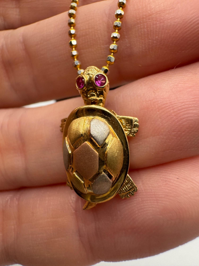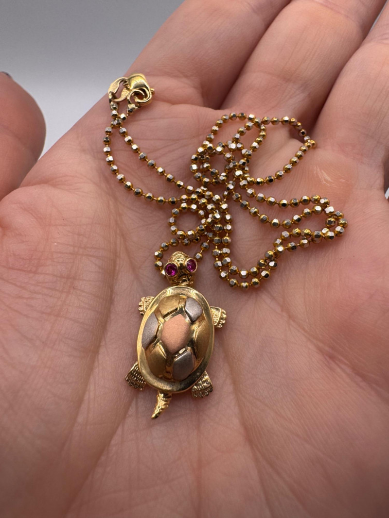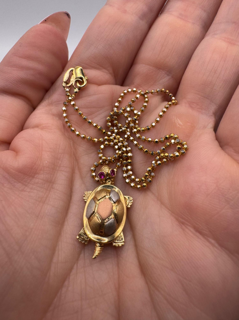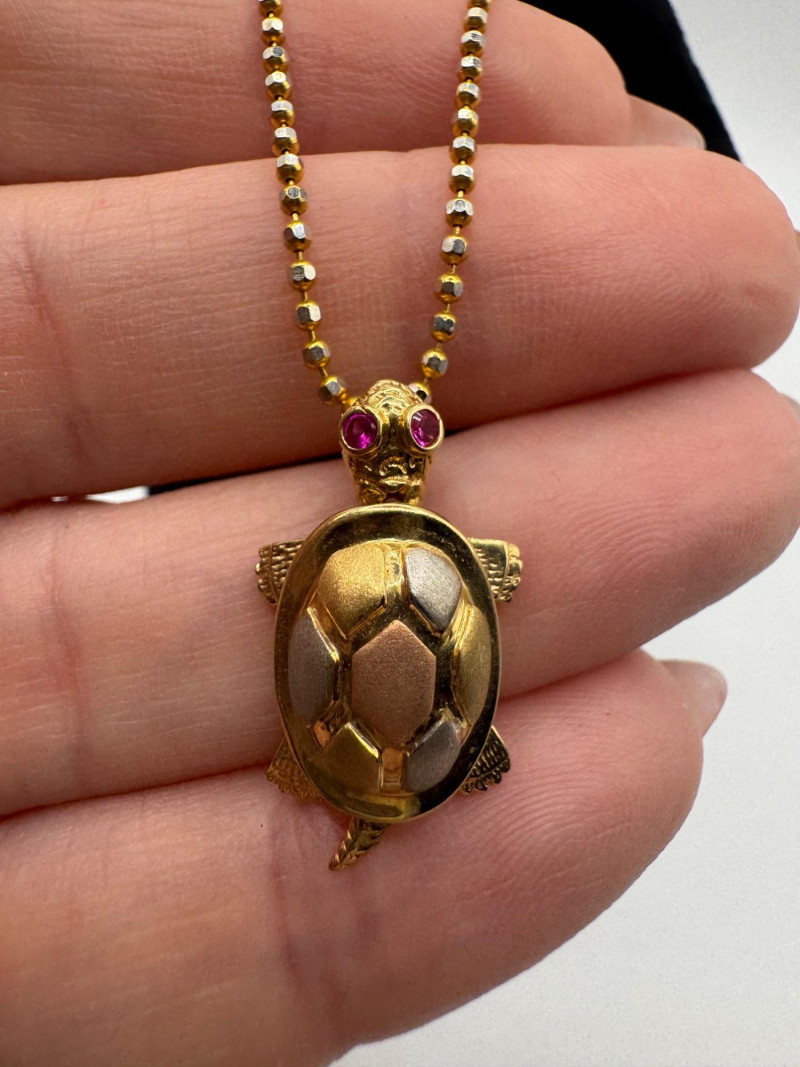 14K Gold Turtle Pendant w/ Moving Head + 15" Ball Chain, 6.3g. Disclaimer: The jewelry in this auction lot has not been tested. By placing a bid, you agree to purchase the item as is, with no guarantees regarding metal quality, content, or purity. Refunds will not be issued on these factors.