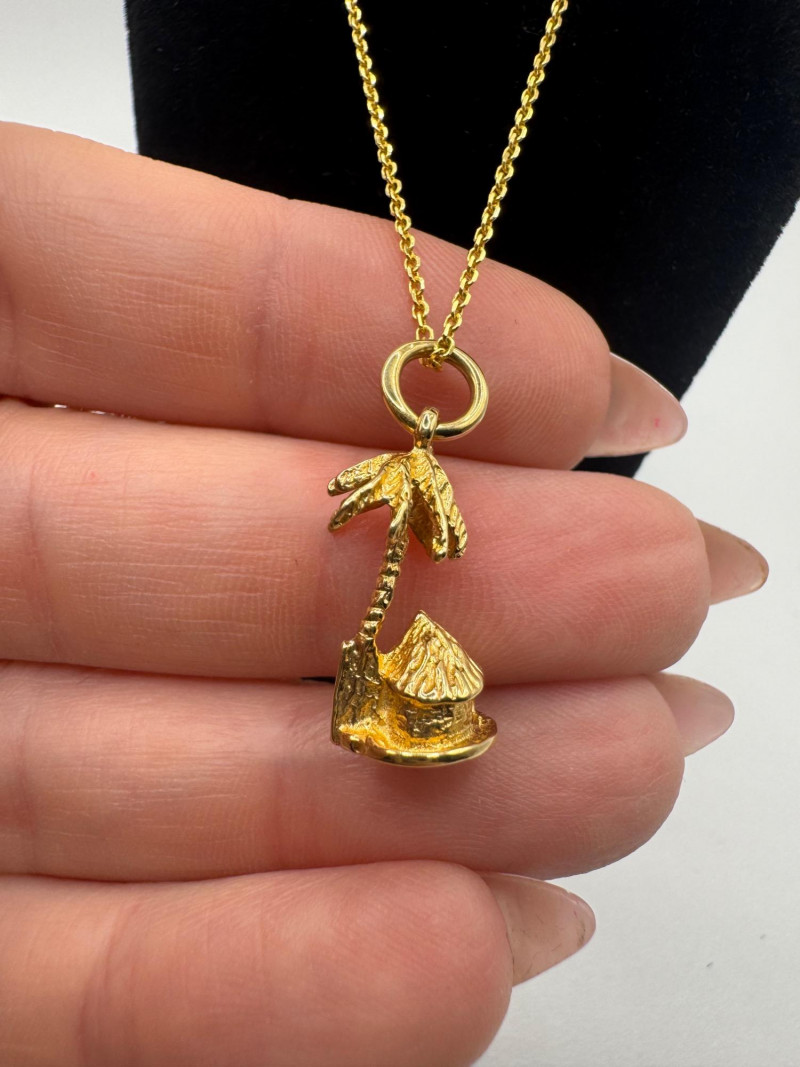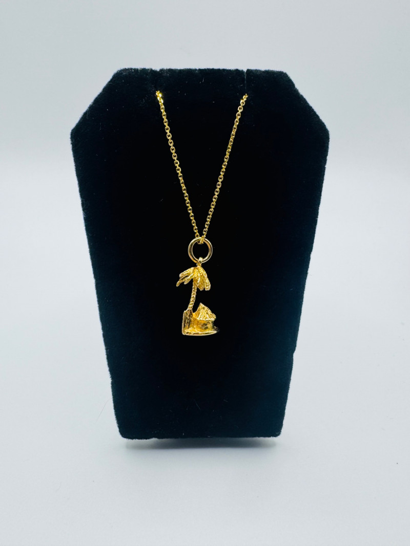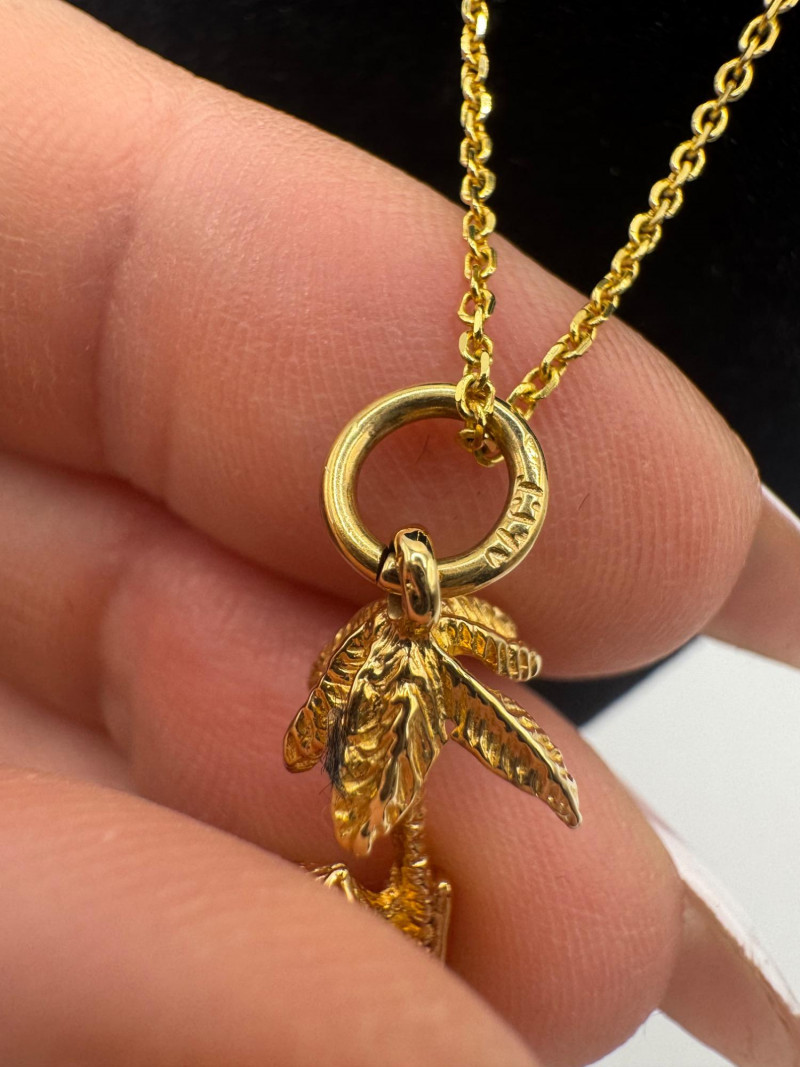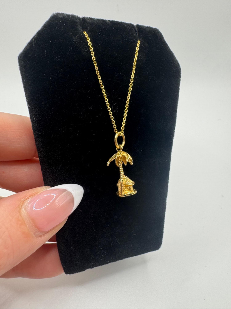 14K Gold Bahamas Papaya Tree Pendant on 17" Chain – 4.0g. Disclaimer: The jewelry in this auction lot has not been tested. By placing a bid, you agree to purchase the item as is, with no guarantees regarding metal quality, content, or purity. Refunds will not be issued on these factors.