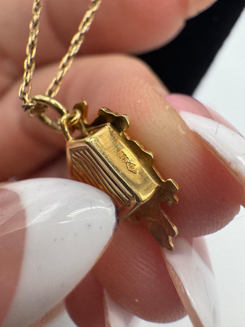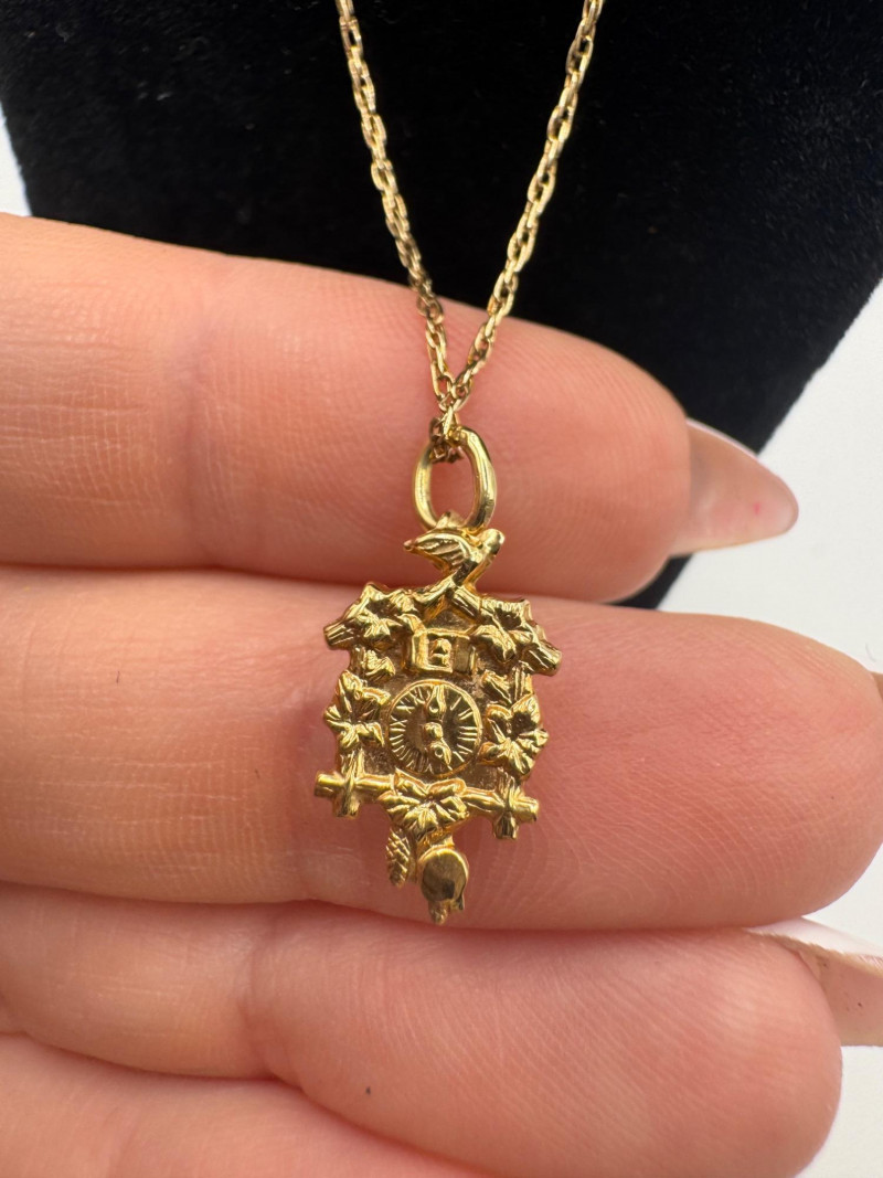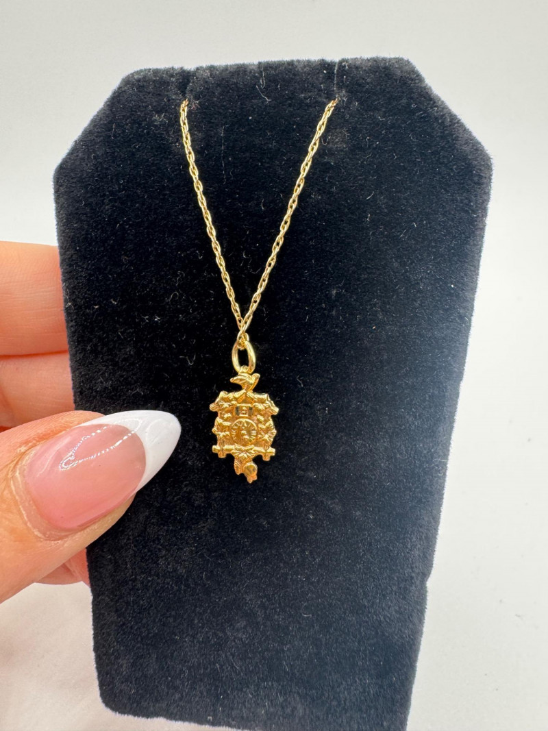 10K German Cuckoo Clock Charm on 14K Gold Chain – 1.58g. Disclaimer: The jewelry in this auction lot has not been tested. By placing a bid, you agree to purchase the item as is, with no guarantees regarding metal quality, content, or purity. Refunds will not be issued on these factors.