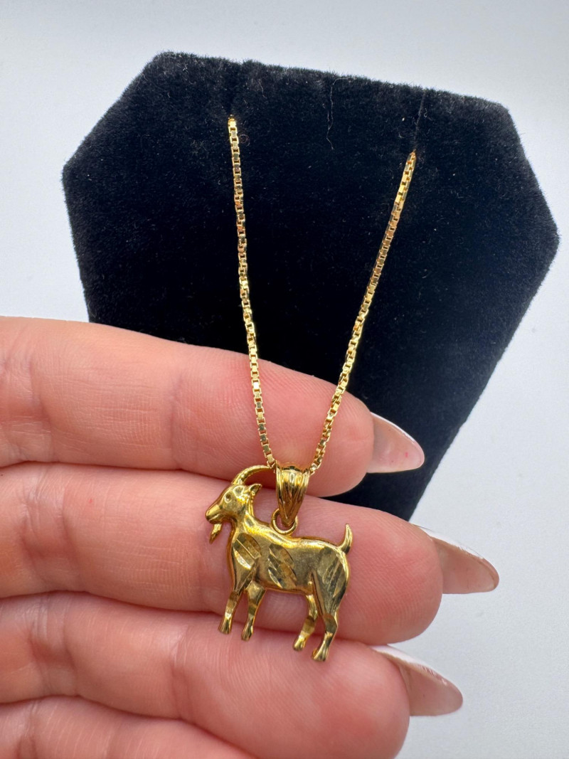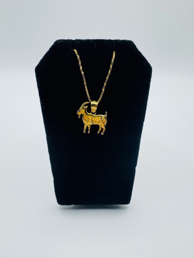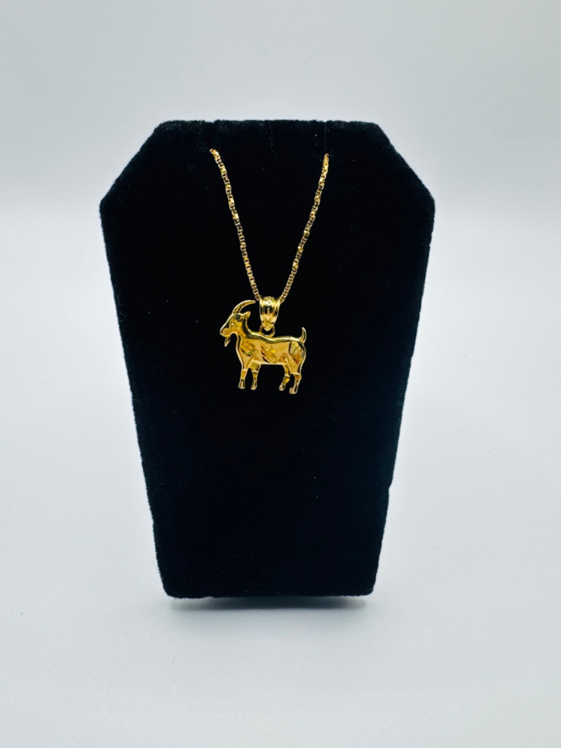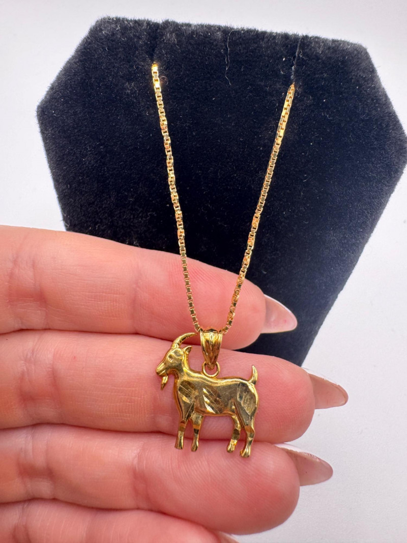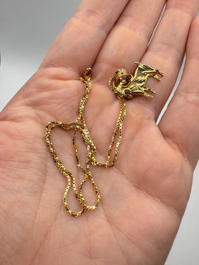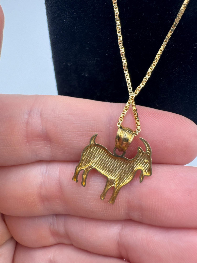 14K Gold Goat Pendant on 18" Perfectina Chain – 3.48g. Disclaimer: The jewelry in this auction lot has not been tested. By placing a bid, you agree to purchase the item as is, with no guarantees regarding metal quality, content, or purity. Refunds will not be issued on these factors.