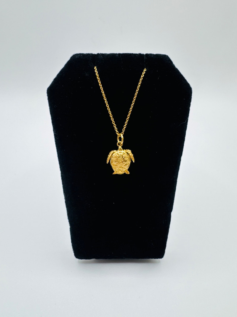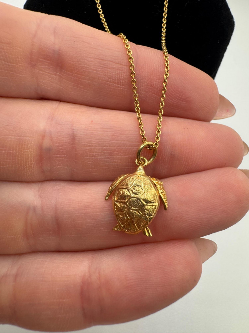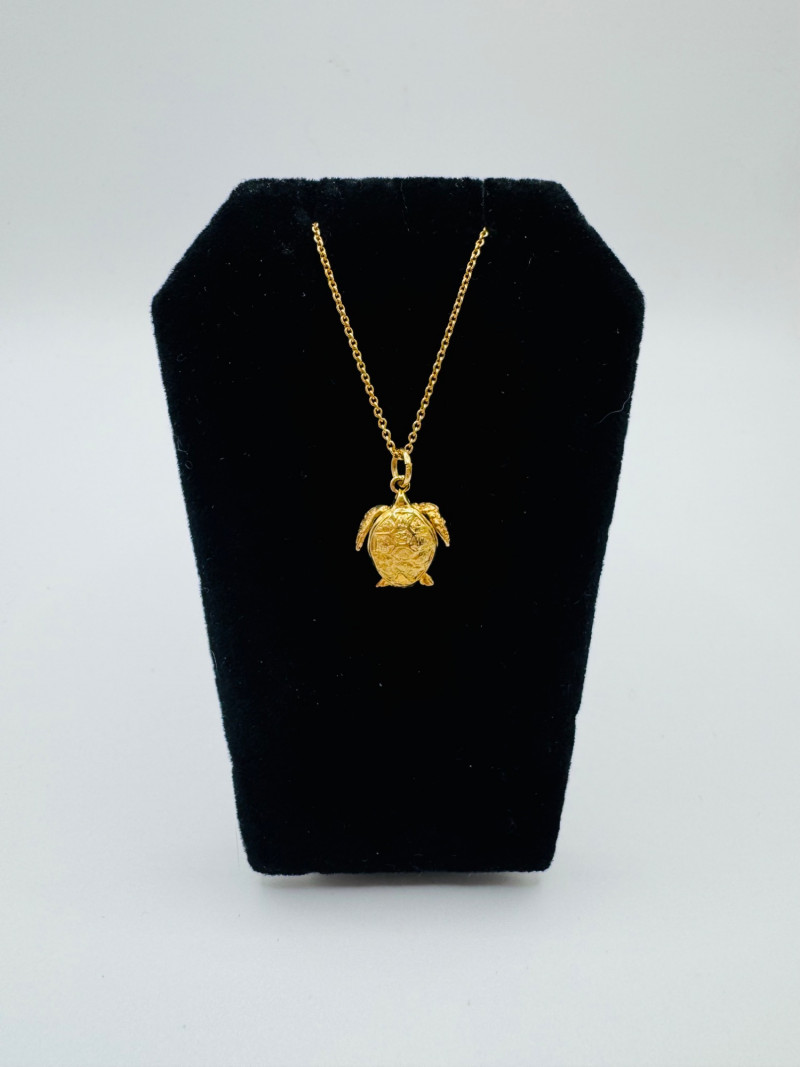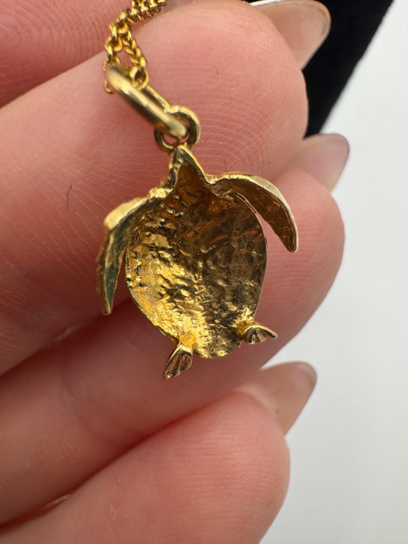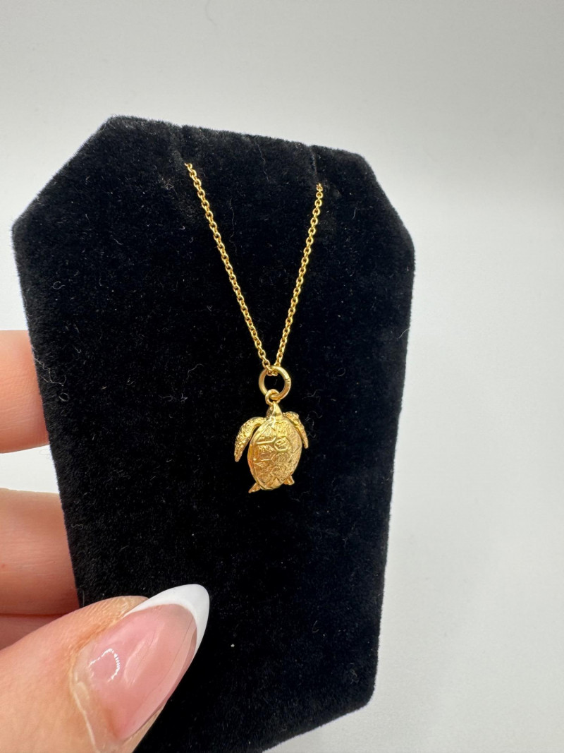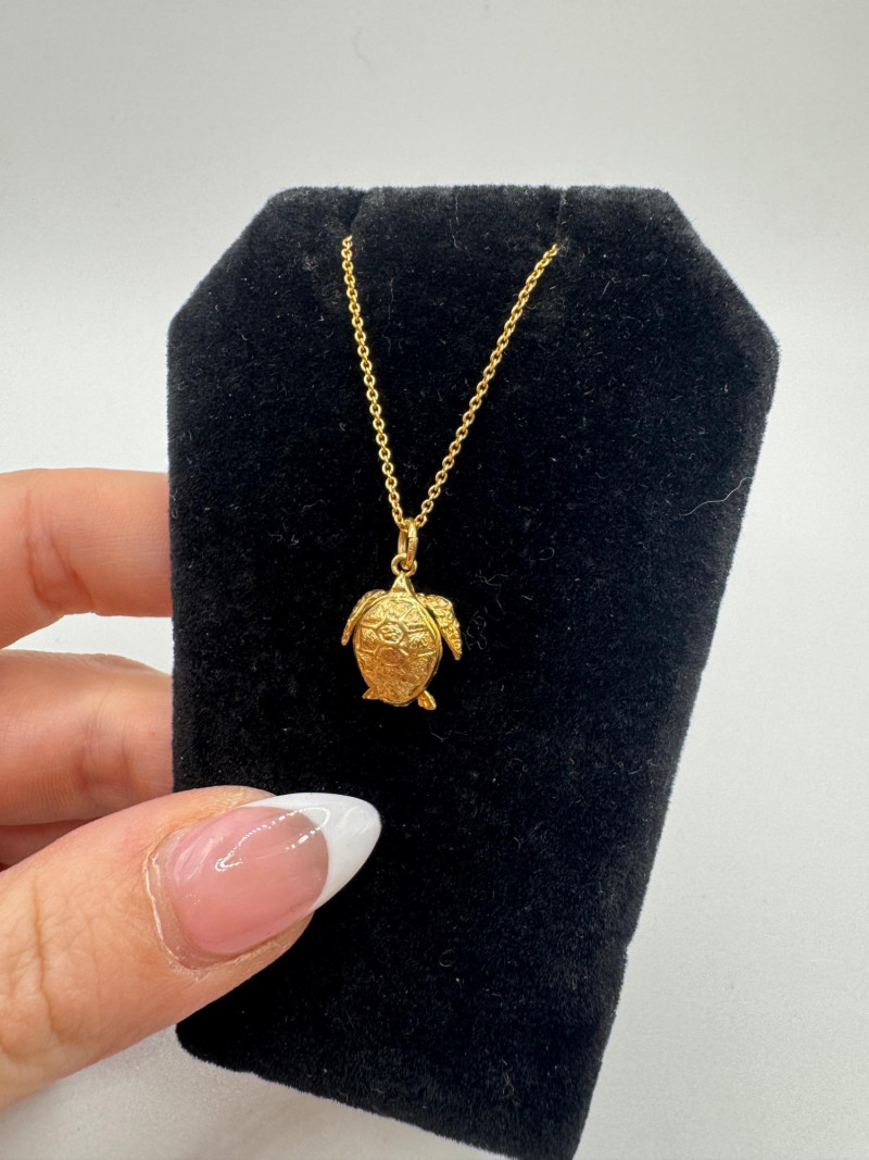 14K Gold Turtle Pendant Necklace – 18” Chain, 3.04g. Disclaimer: The jewelry in this auction lot has not been tested. By placing a bid, you agree to purchase the item as is, with no guarantees regarding metal quality, content, or purity. Refunds will not be issued on these factors.