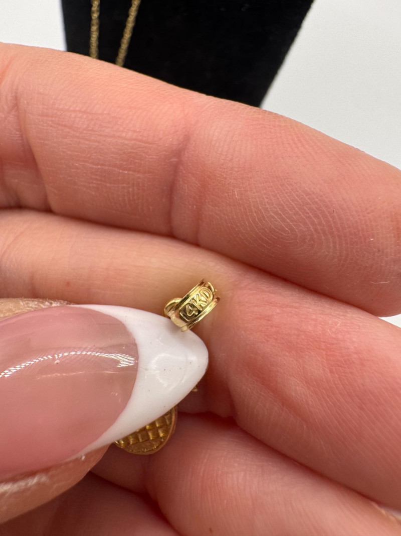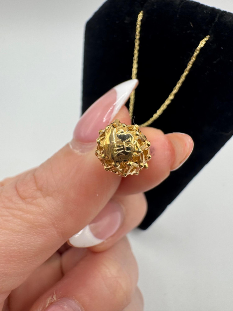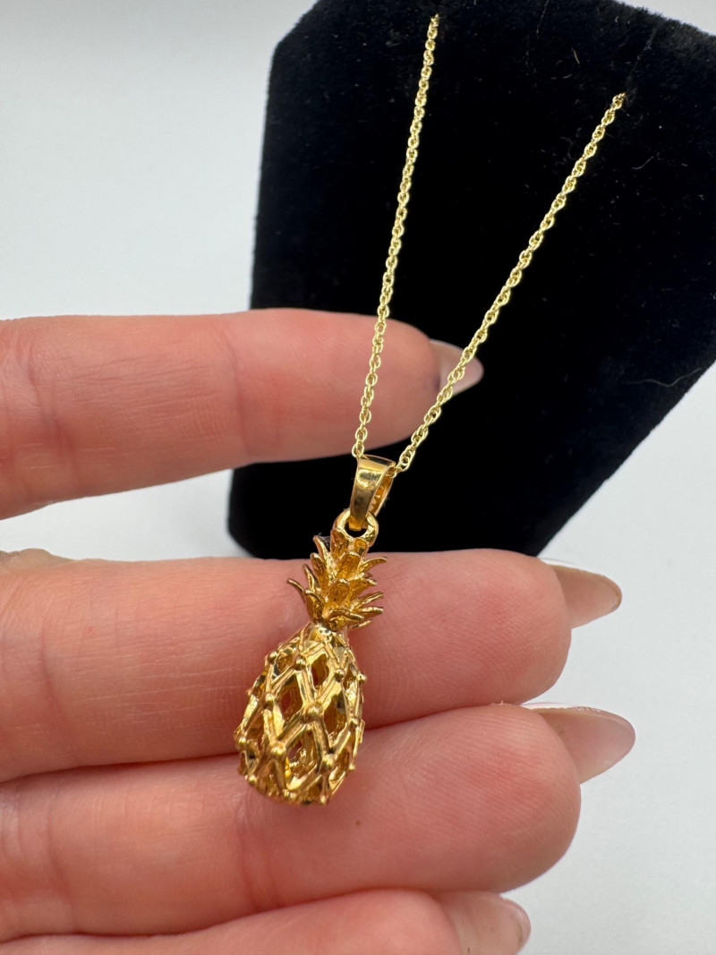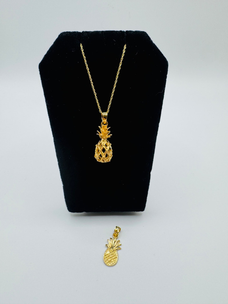 14K Gold Pineapple Pendant Necklace & Extra Pendant – 18” Rope Chain. Total weight: approx. 5.03 grams Both pendants and chain are 14k gold Includes: Open lattice pineapple pendant on chain (14k marked) Solid textured pineapple pendant (14k marked) Chain: 18” light rope chain, marked 14K Peru