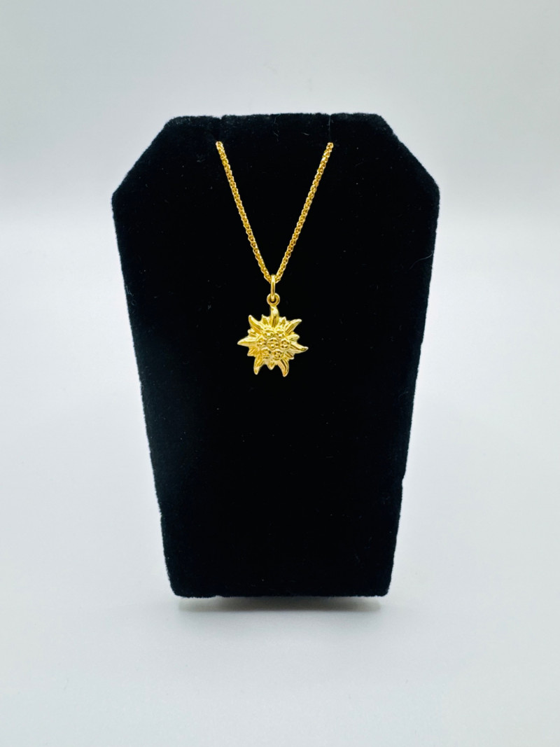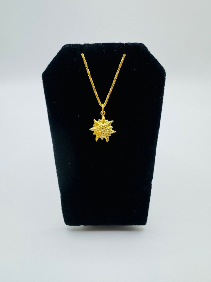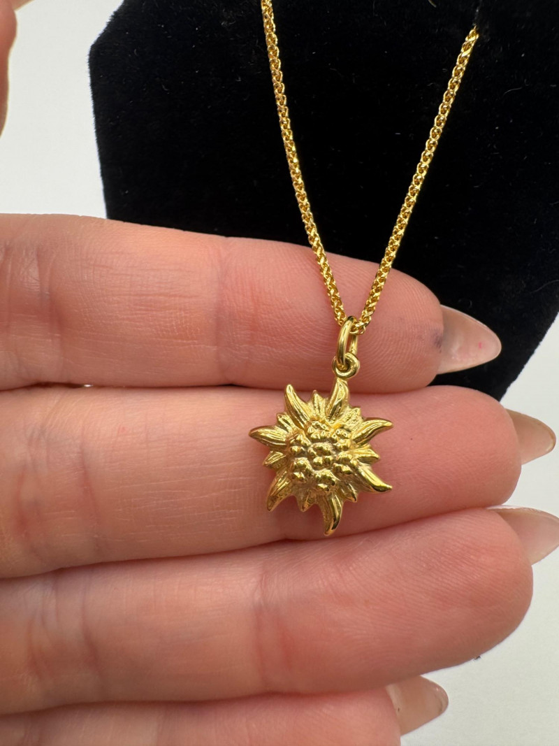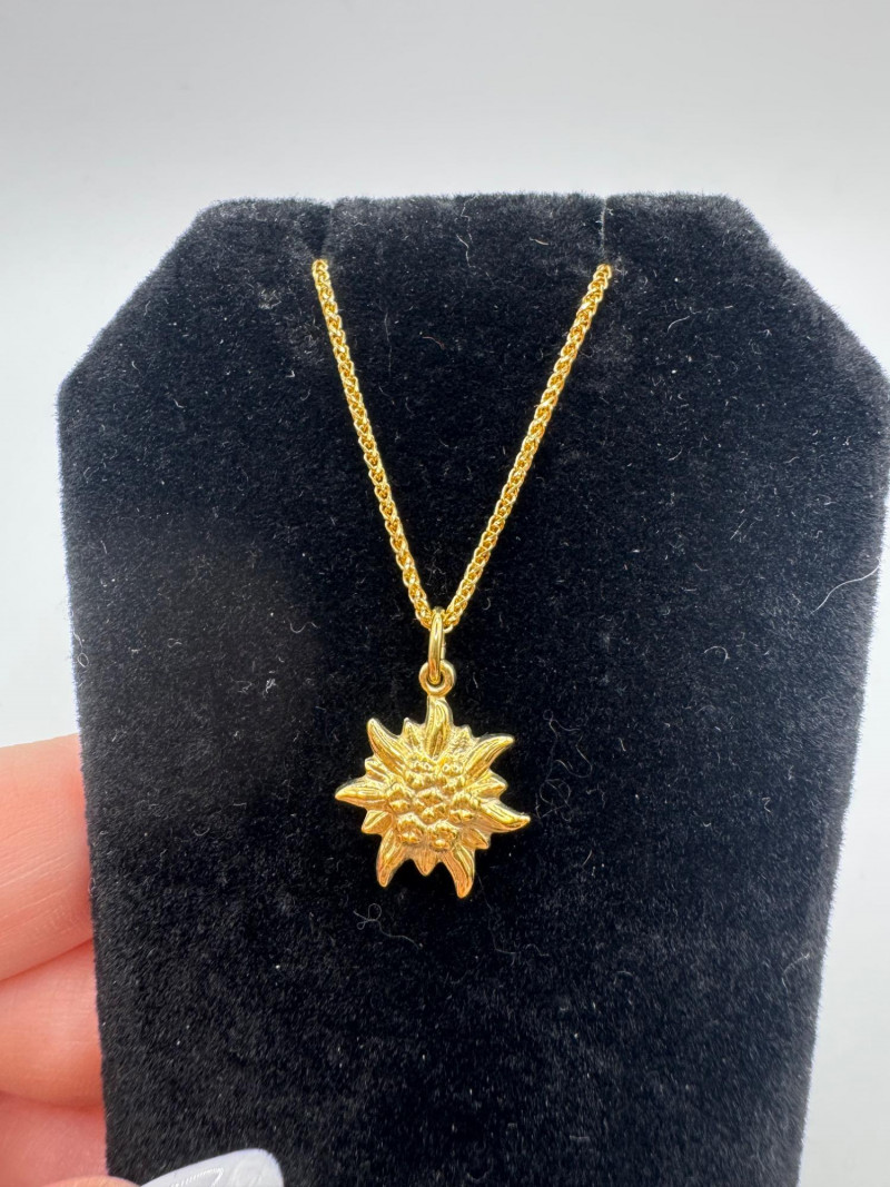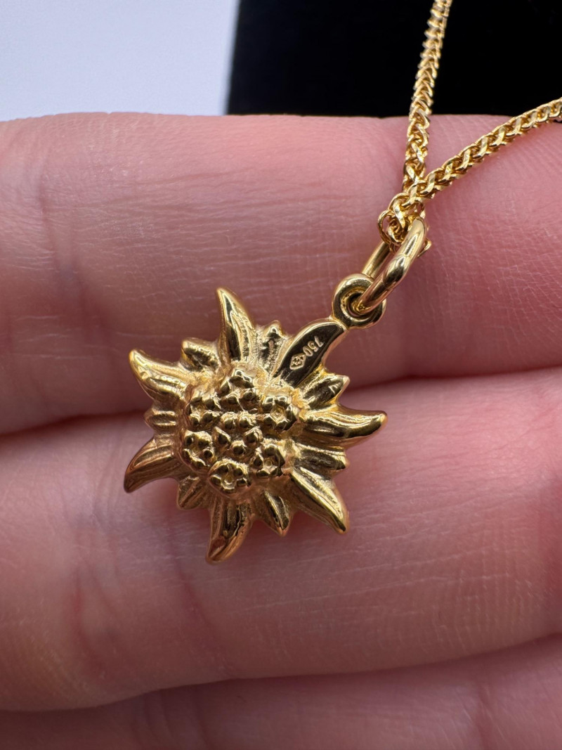 14K Wheat Chain w/ 18K Edelweiss Flower Pendant – Switzerland. Disclaimer: The jewelry in this auction lot has not been tested. By placing a bid, you agree to purchase the item as is, with no guarantees regarding metal quality, content, or purity. Refunds will not be issued on these factors.