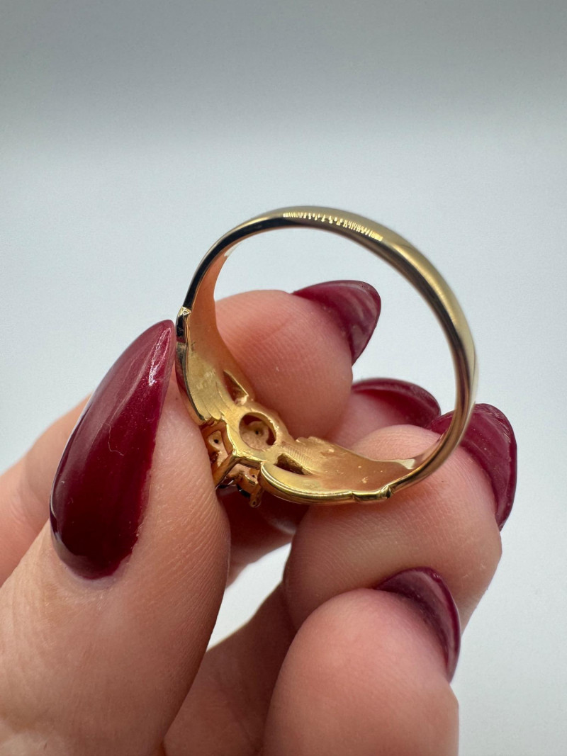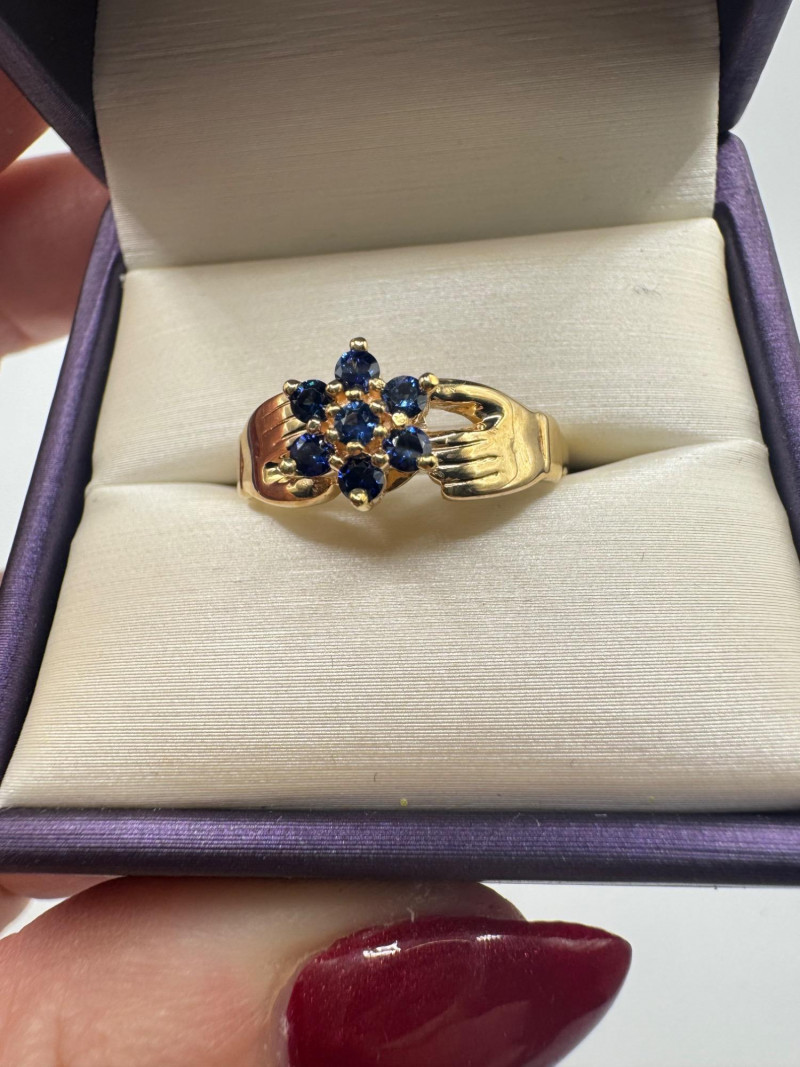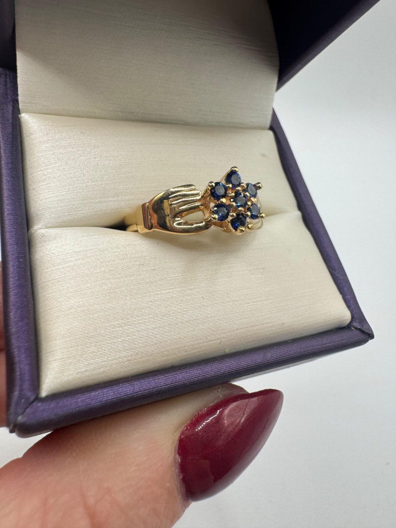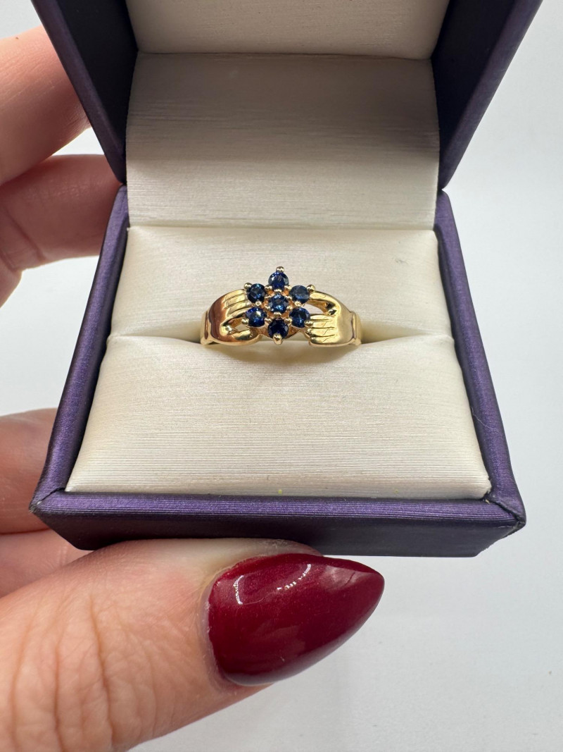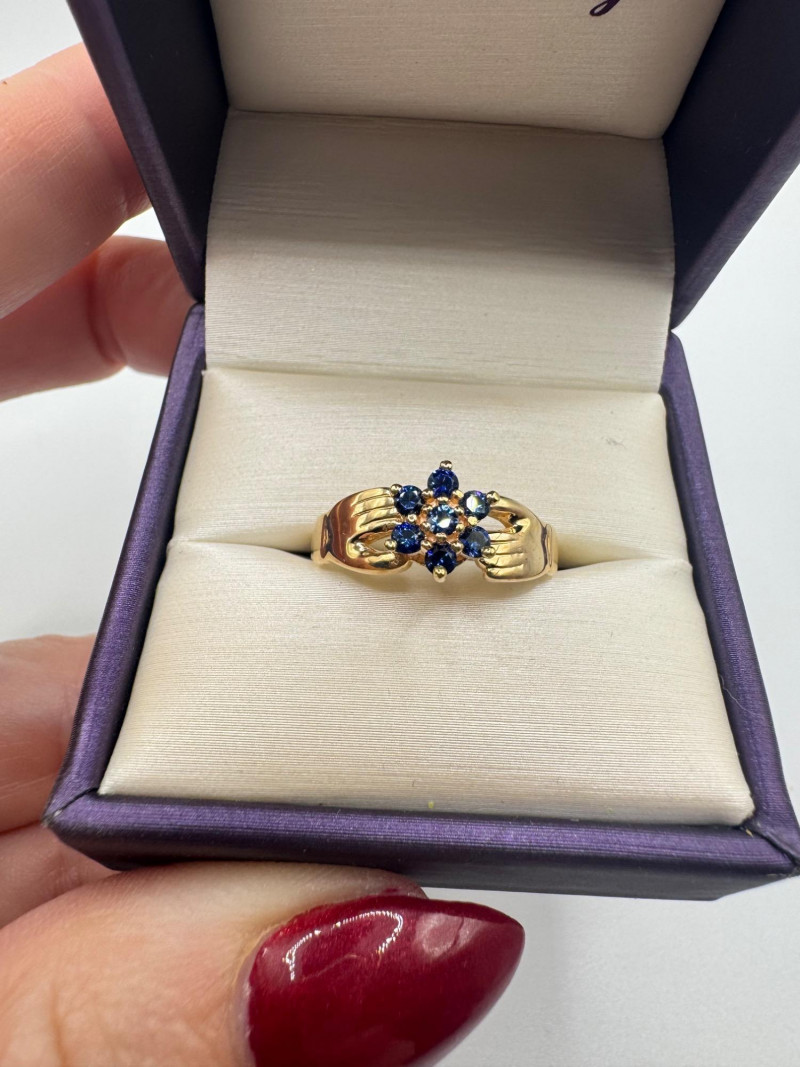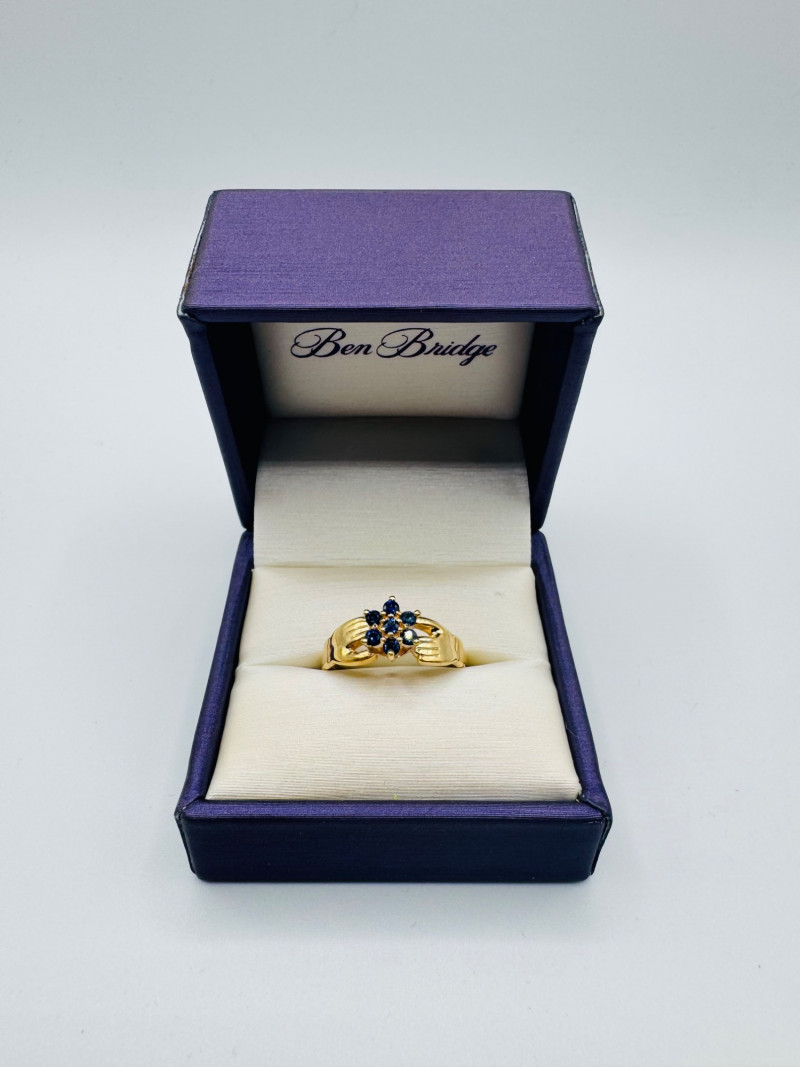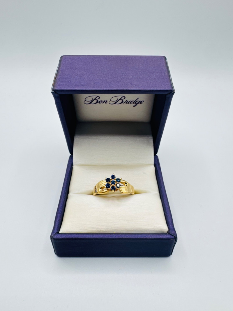 14K Gold Ben Bridge Ring w/ Blue Stones – Size 7.75, 3.21g. Disclaimer: The jewelry in this auction lot has not been tested. By placing a bid, you agree to purchase the item as is, with no guarantees regarding metal quality, content, or purity. Refunds will not be issued on these factors.