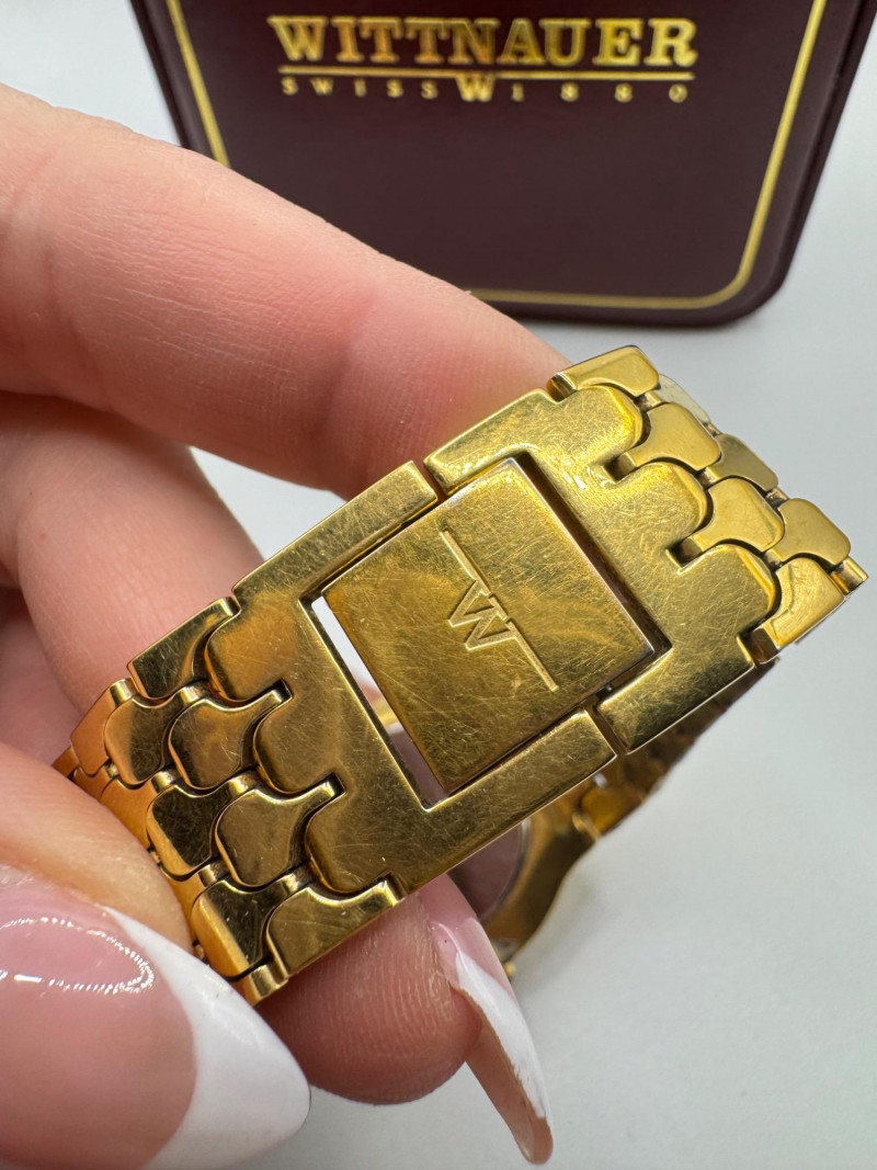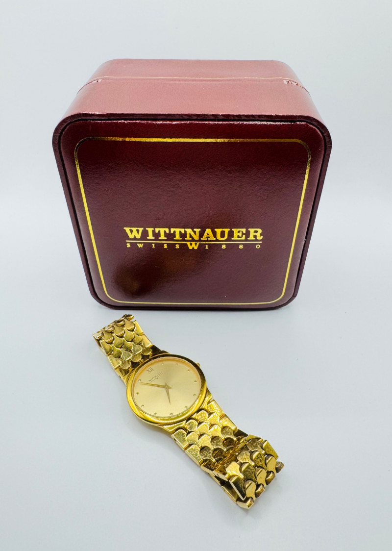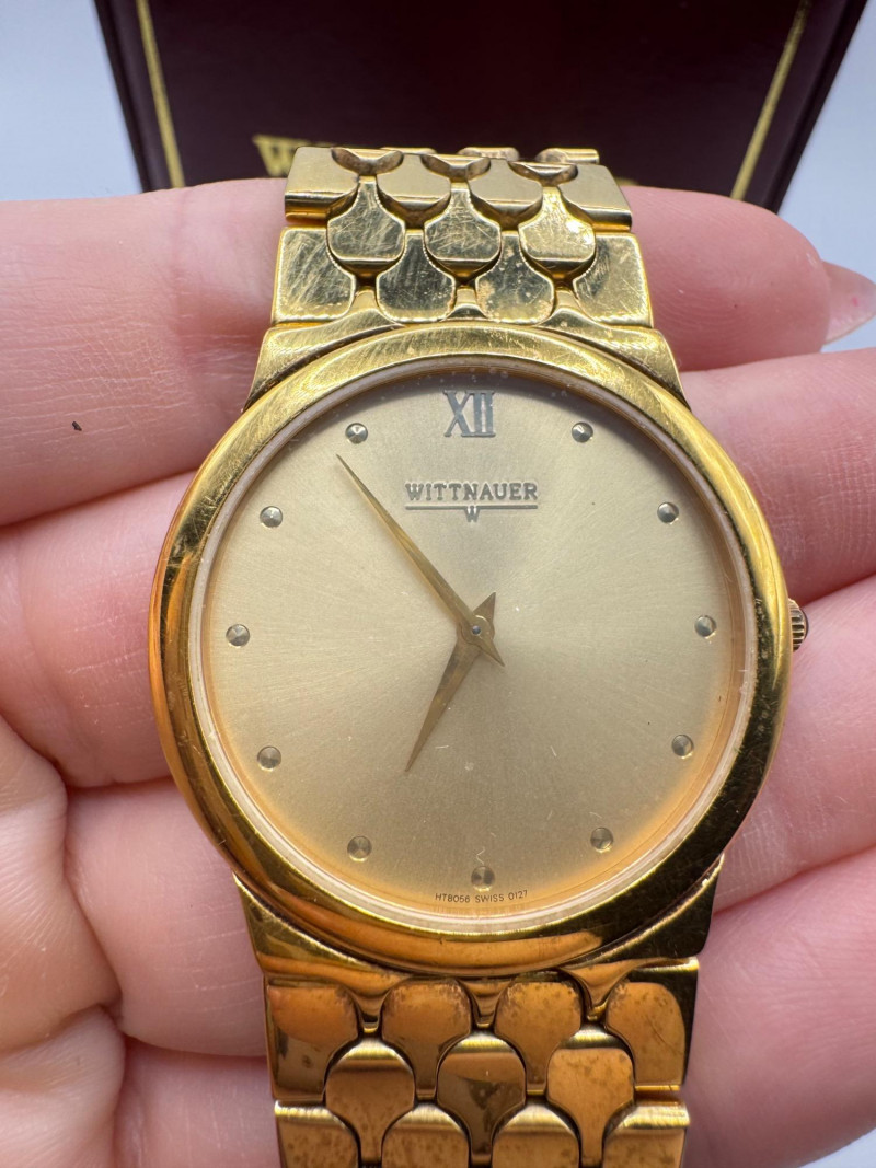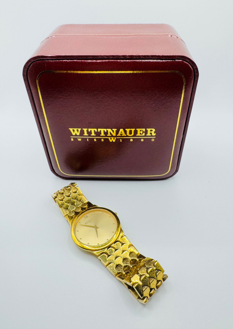 Wittnauer Swiss Gold Tone Men’s Watch w/ Box - Large Size. Disclaimer: The jewelry in this auction lot has not been tested. By placing a bid, you agree to purchase the item as is, with no guarantees regarding metal quality, content, or purity. Refunds will not be issued on these factors.