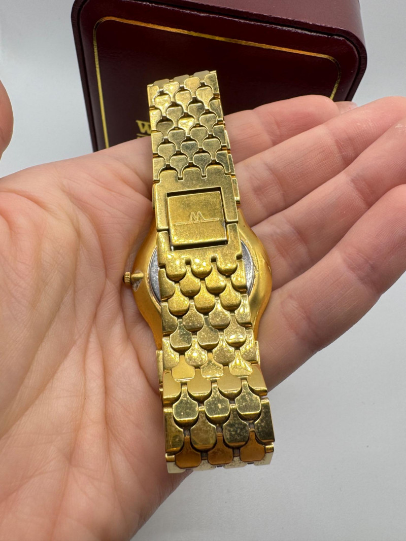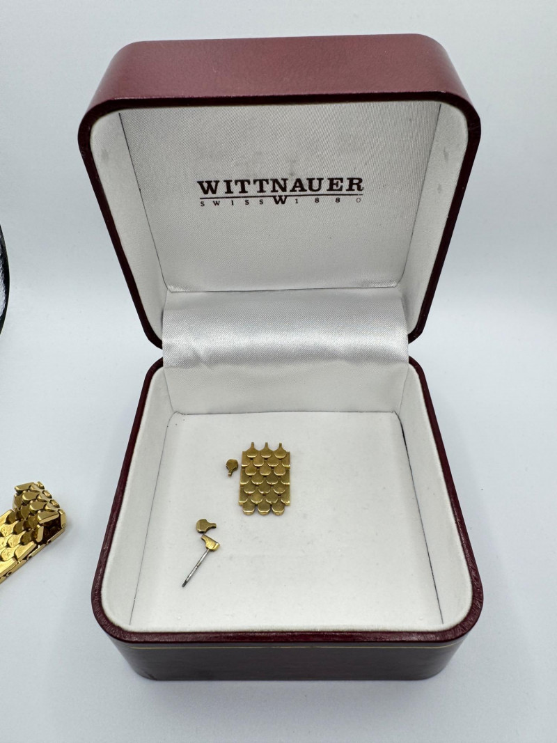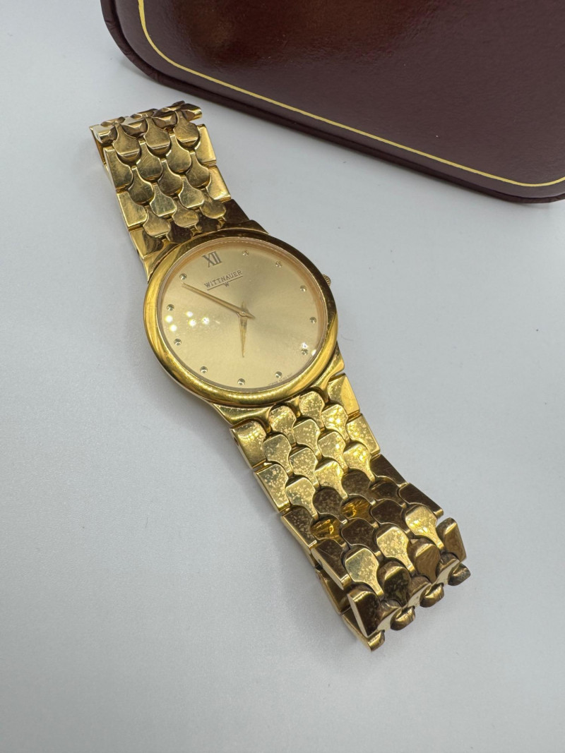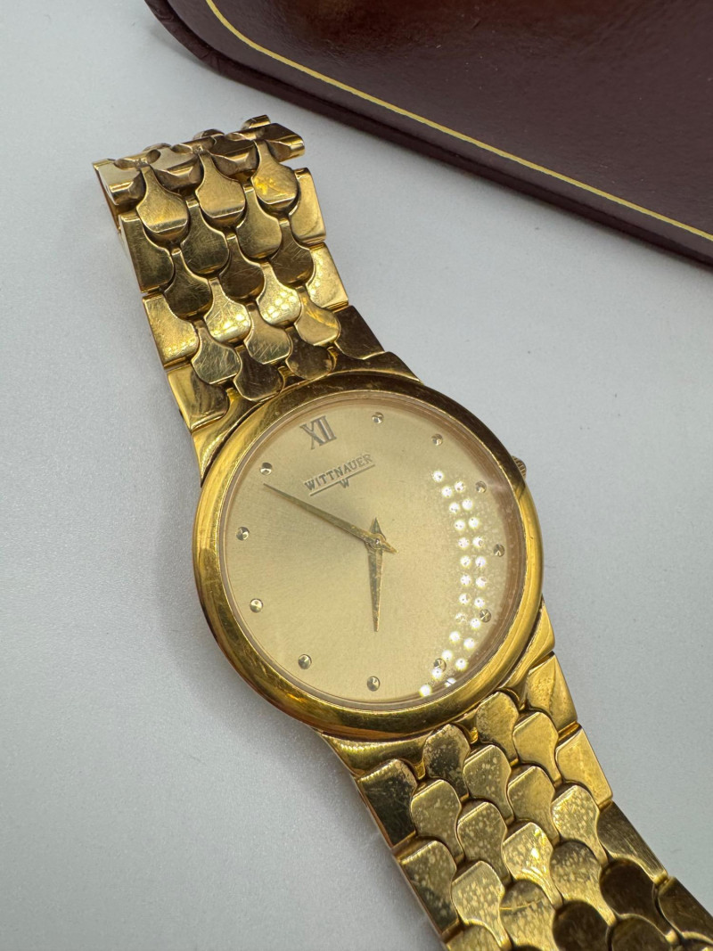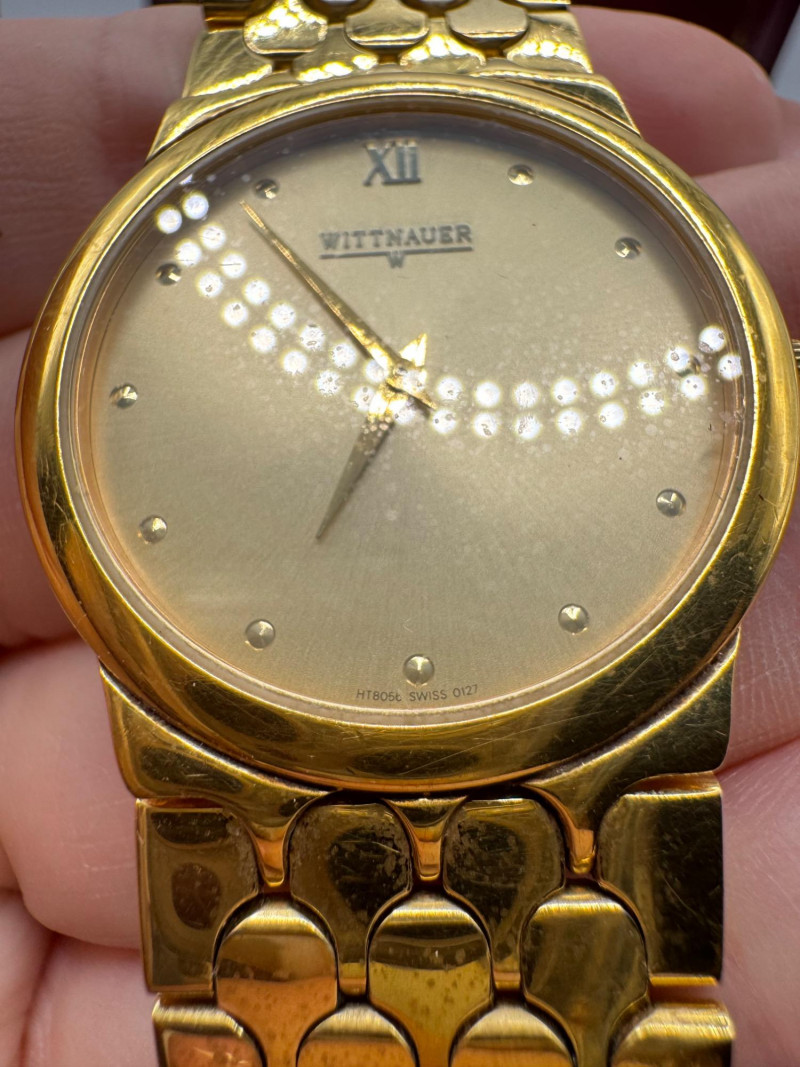 Wittnauer Swiss Gold Tone Men’s Watch w/ Box - Large Size. Disclaimer: The jewelry in this auction lot has not been tested. By placing a bid, you agree to purchase the item as is, with no guarantees regarding metal quality, content, or purity. Refunds will not be issued on these factors.