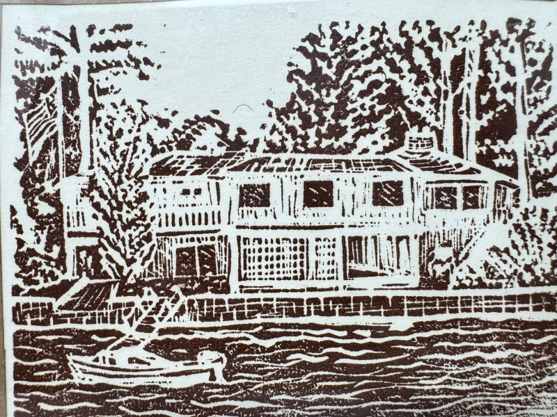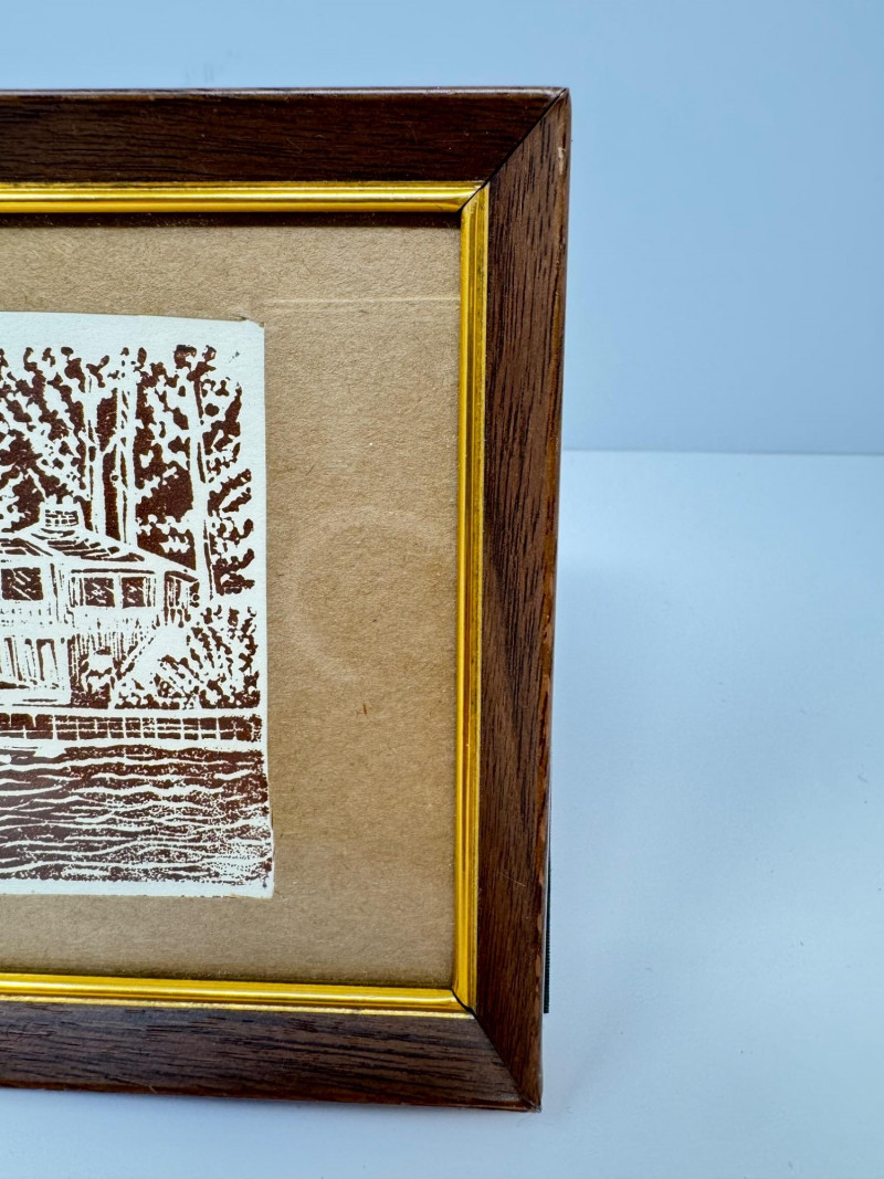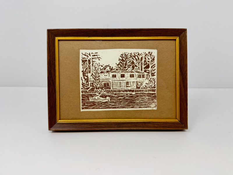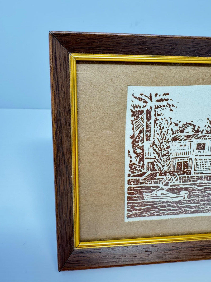 Framed Brown & White House on Water Print. Frame measures approx. 7.25" x 5.3"
