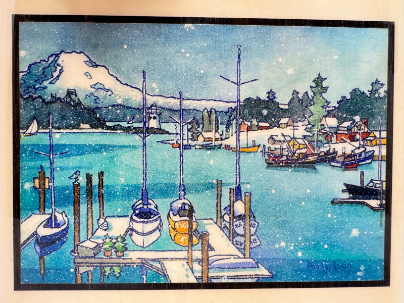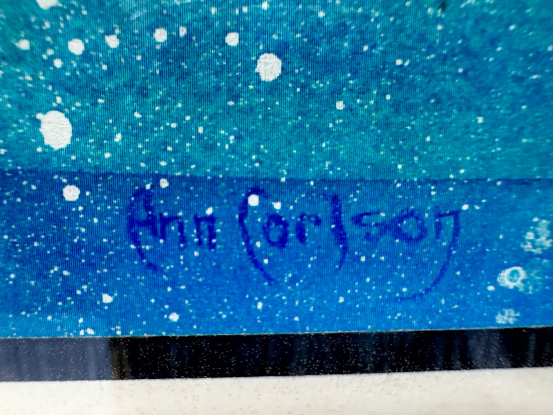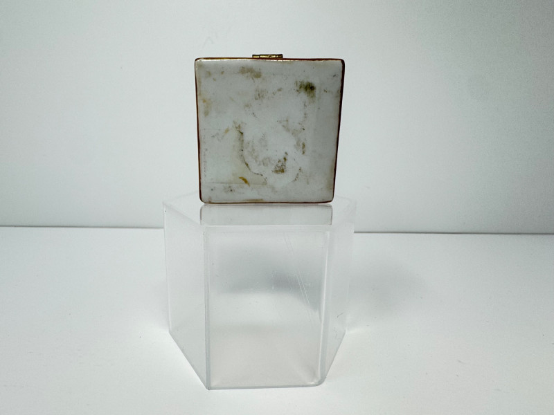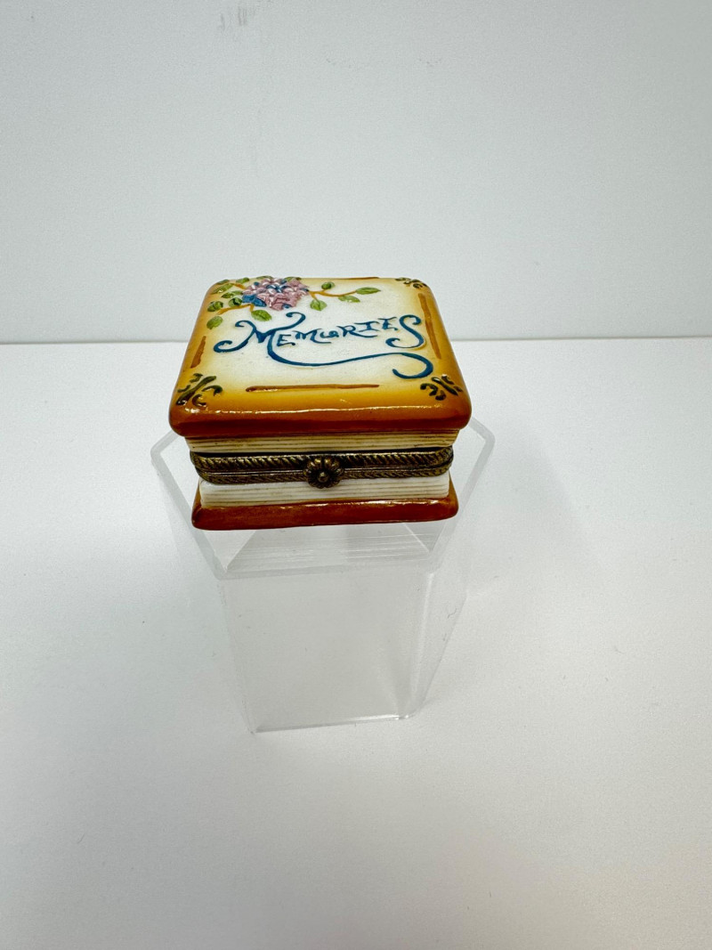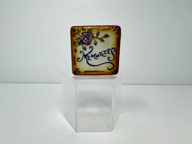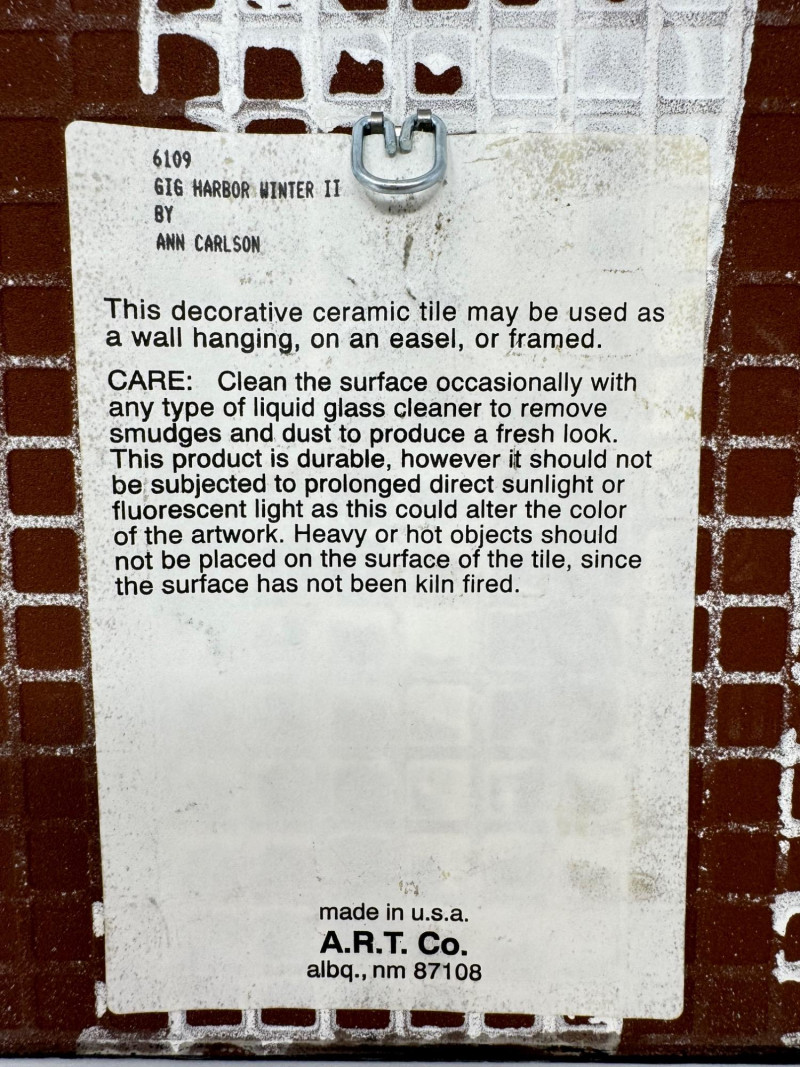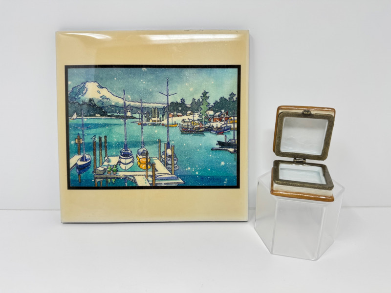 Signed Ann Carlson Ceramic Art Tile & Memories Trinket Box. Decorative Art Tile – Gig Harbor Winter II by Ann Carlson. 8x8 inches, made in USA by A.R.T. Co. Signed by the artist. Ceramic Trinket Box – Small square box with hinged lid. 2x2 inches with floral design and “Memories” text on lid. Hand-painted details, metal trim with clasp closure.