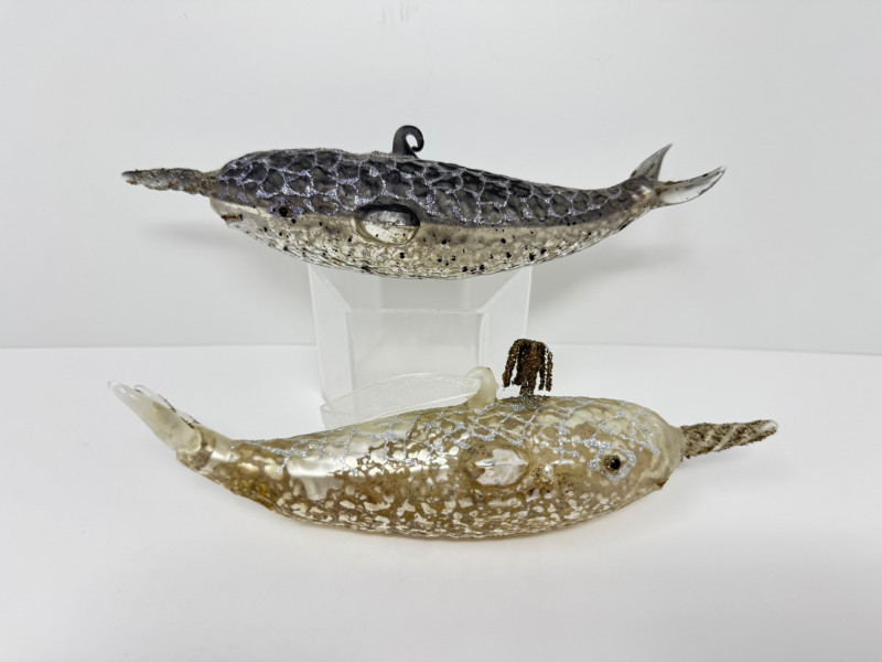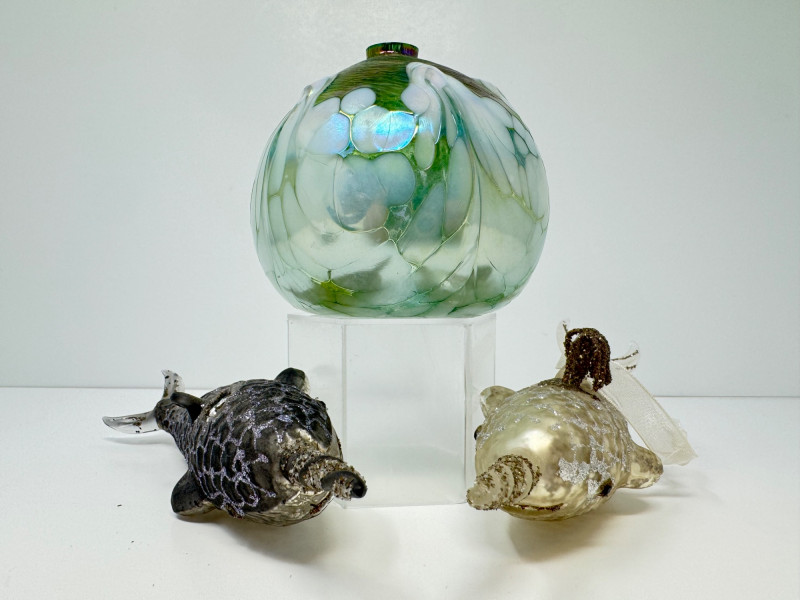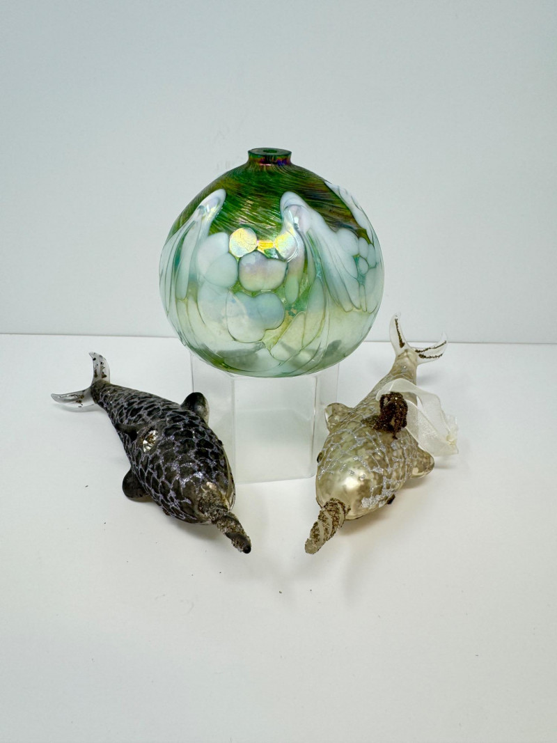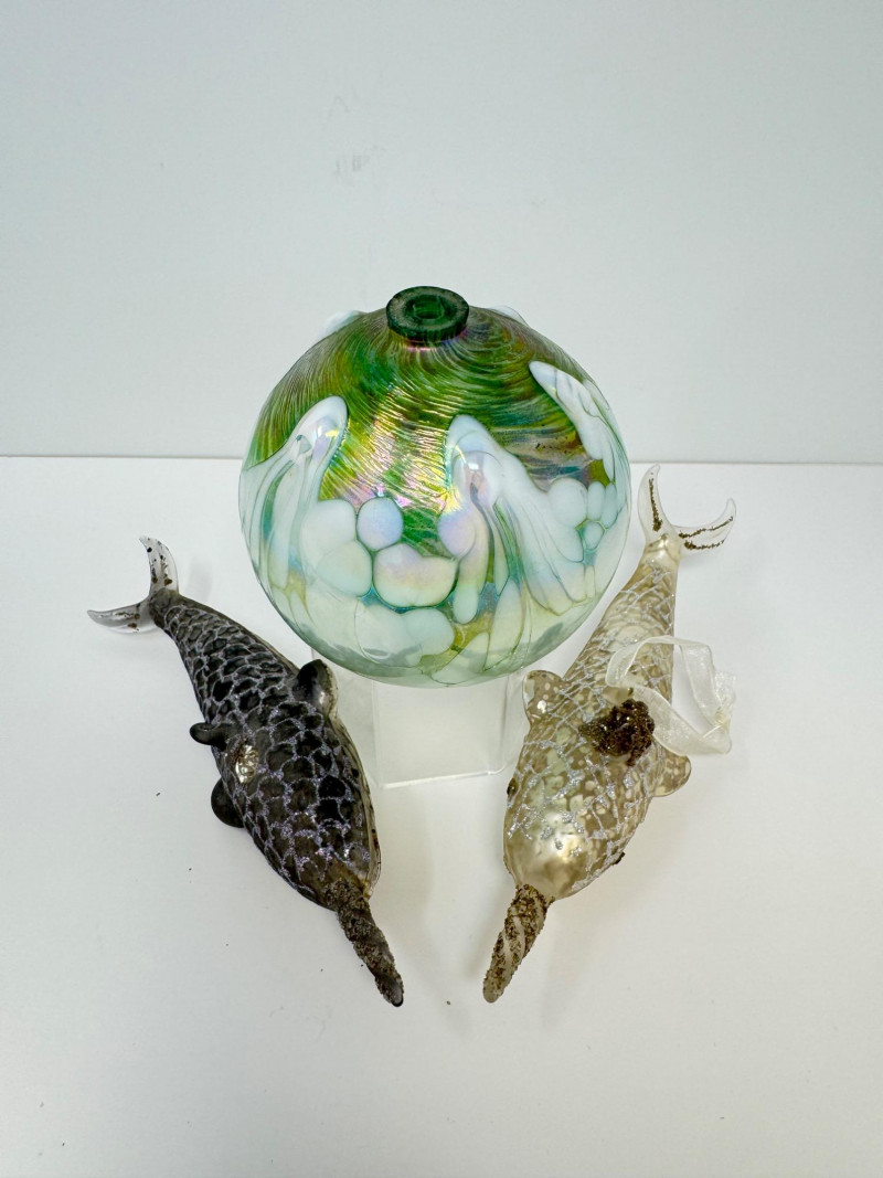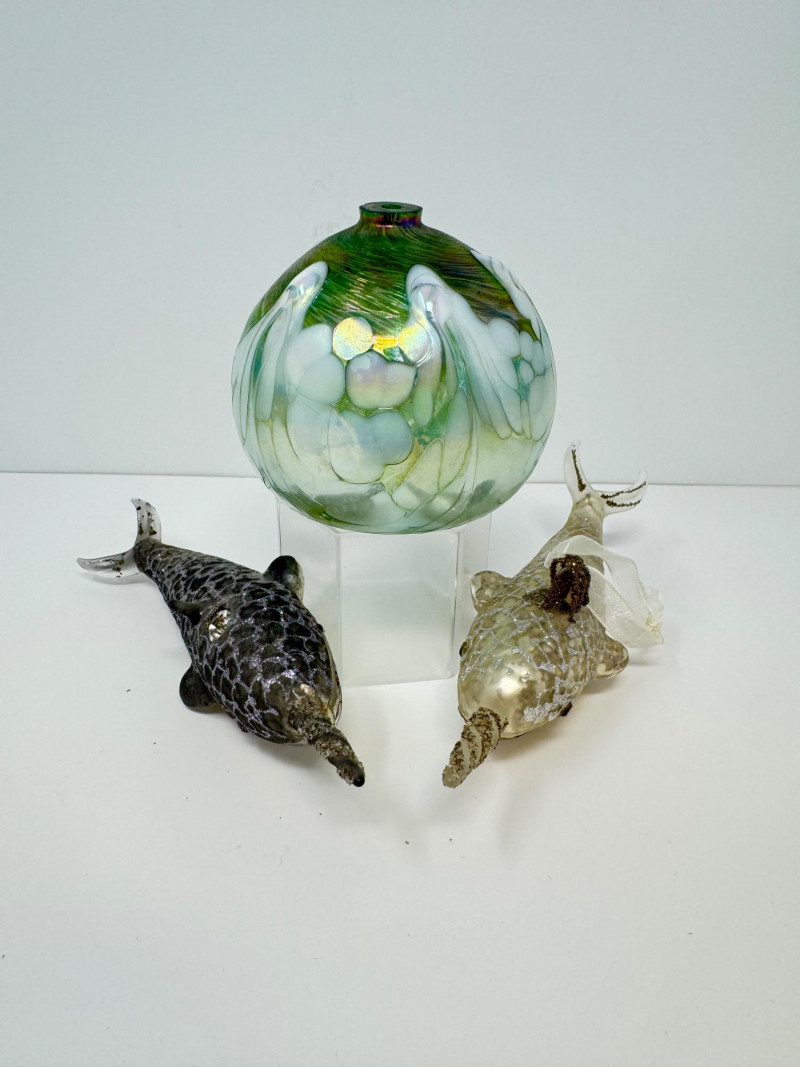 Blown Glass Green Swirl Oil Lamp + 2 Narwhal Ornaments.