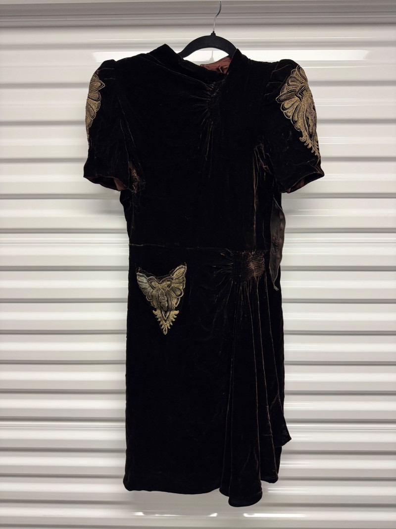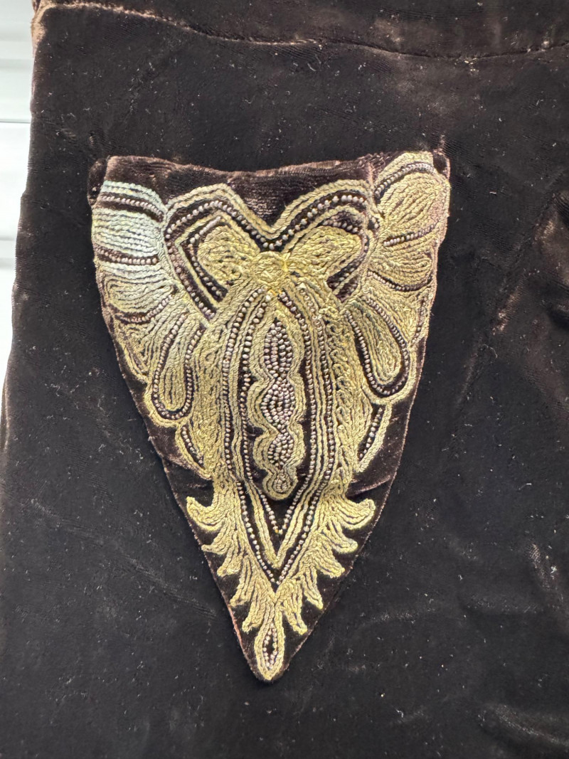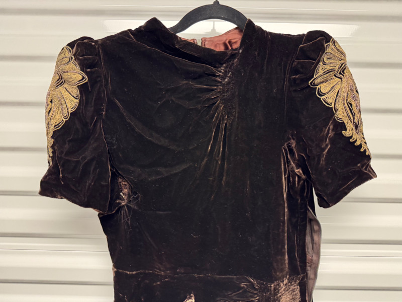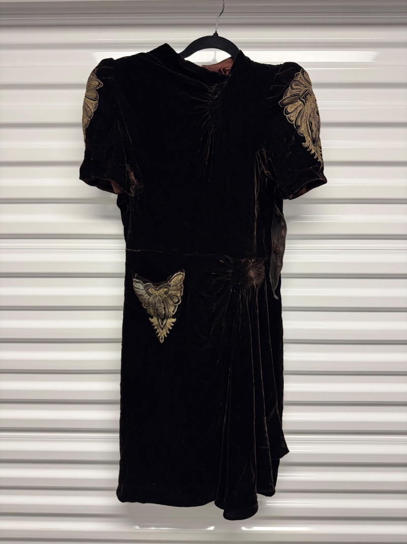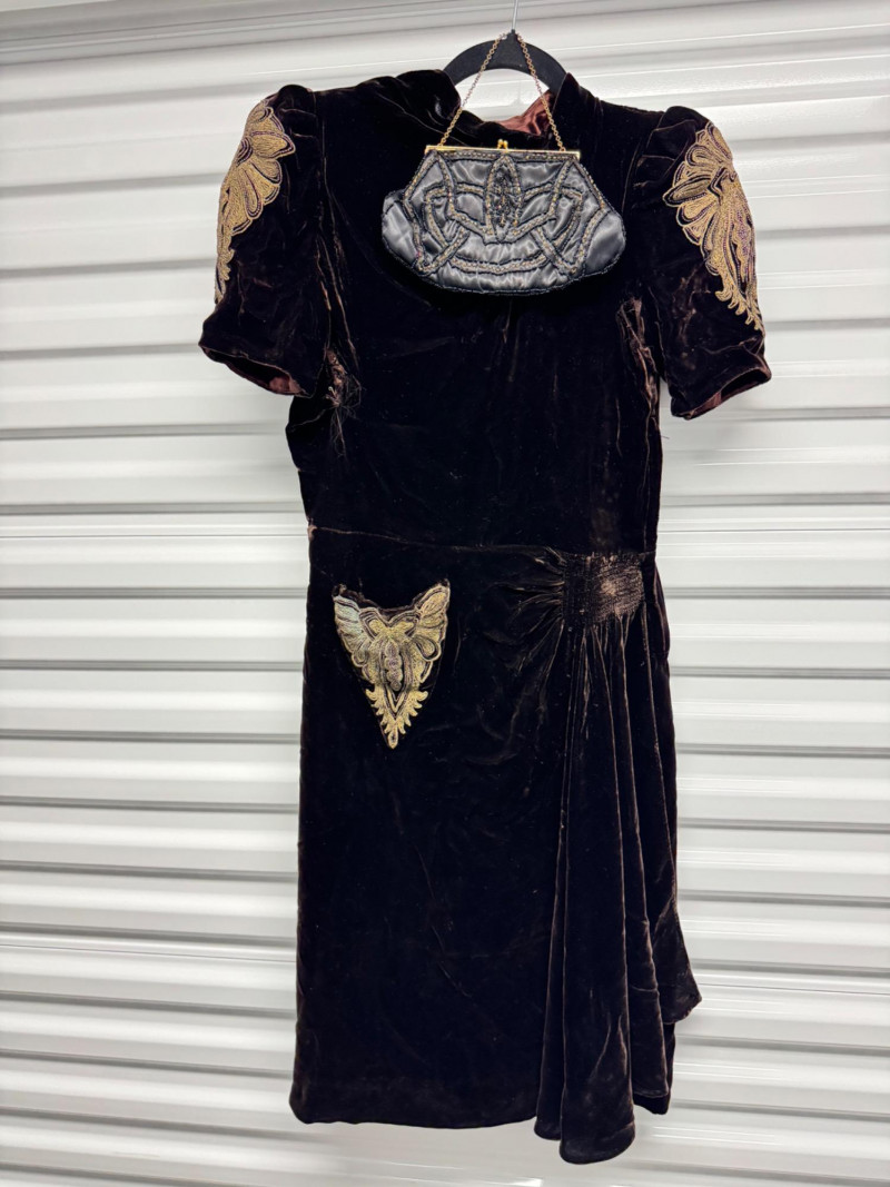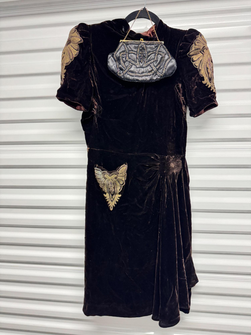 Lot # 53 - Antique 1920s Black Velvet Dress w/ Gold Embroidery + Beaded Purse