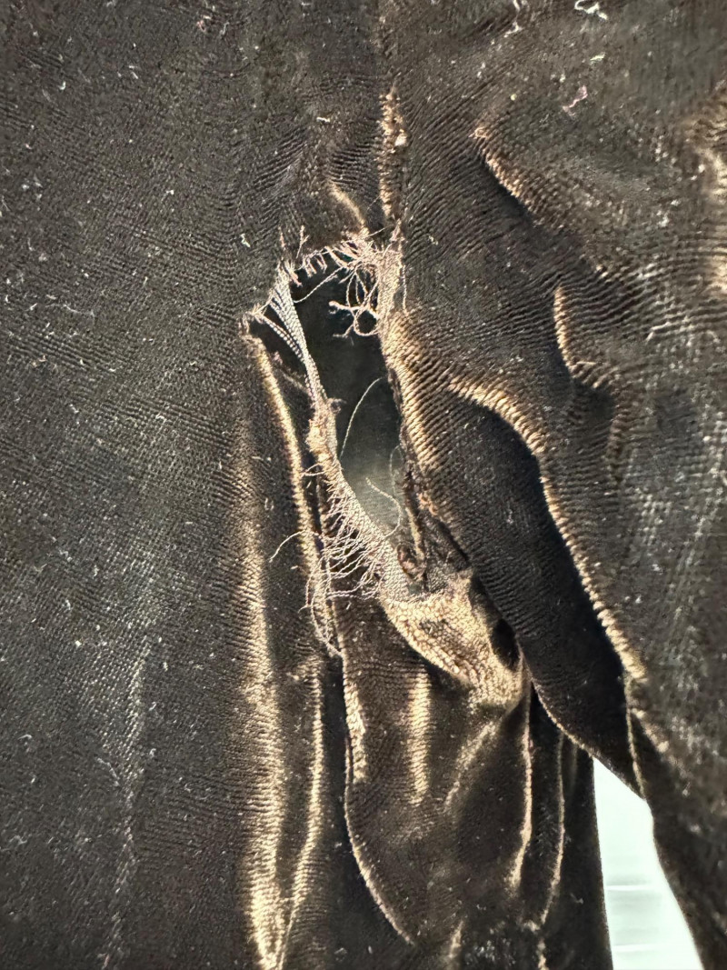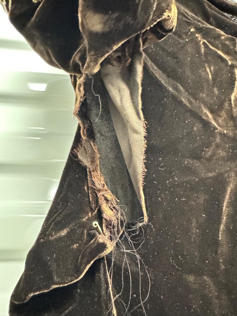 Antique 1920s Black Velvet Dress w/ Gold Embroidery + Beaded Purse. Condition: Fabric wear, seam tears, fraying (see photos)