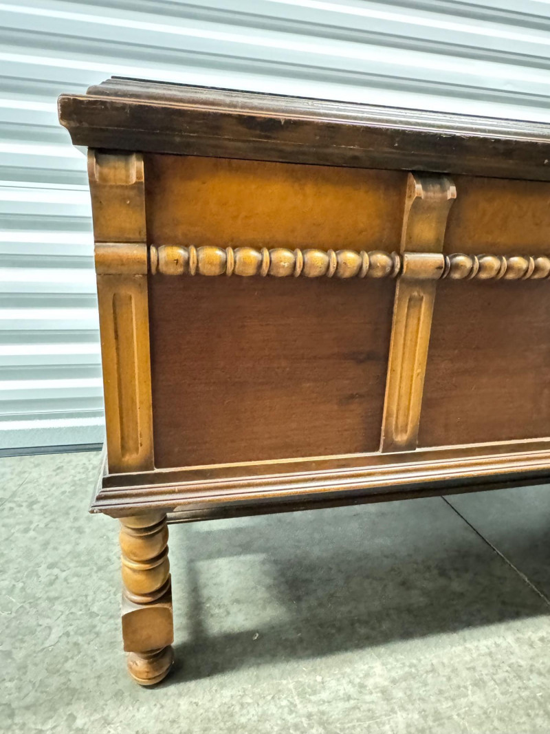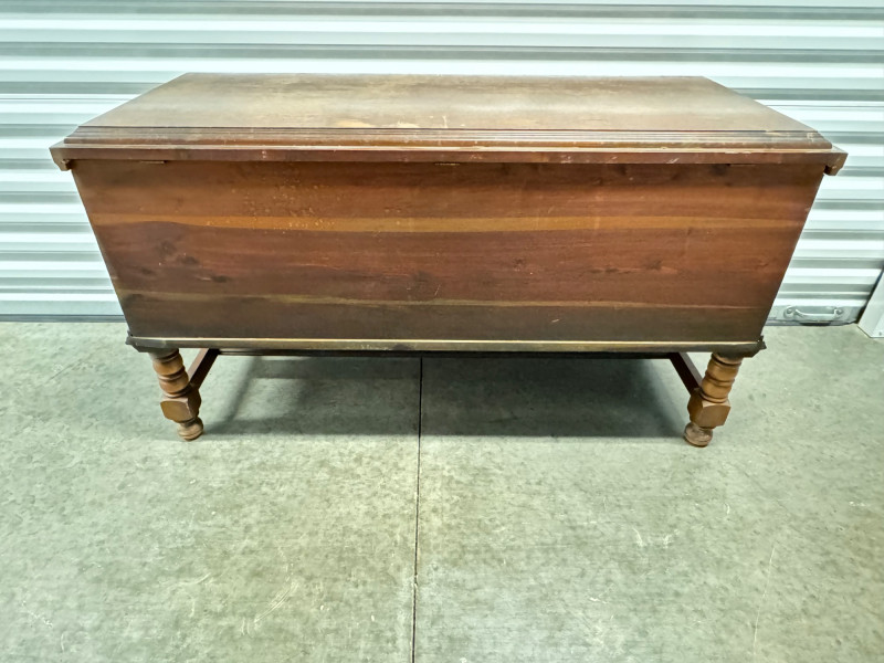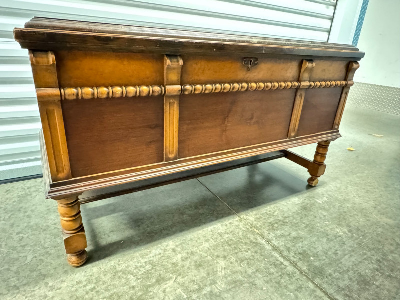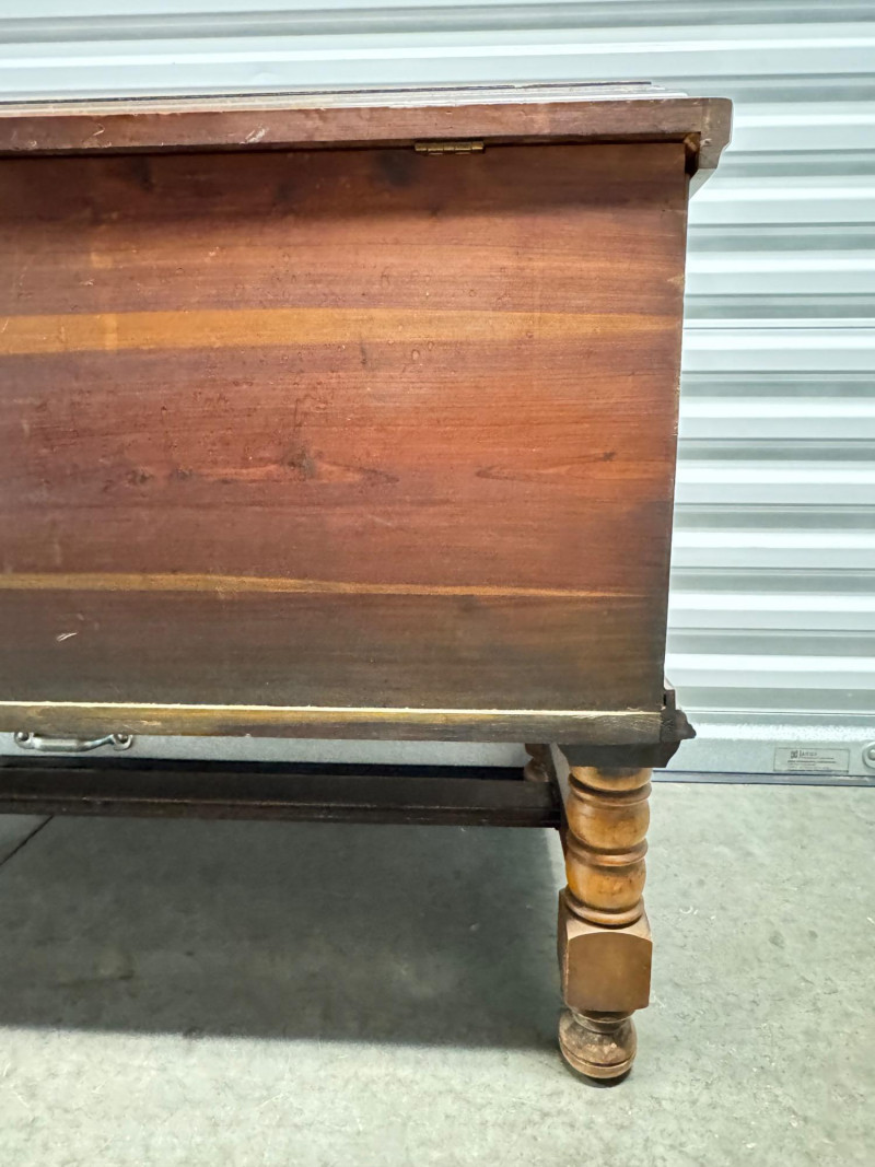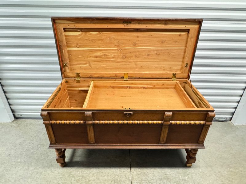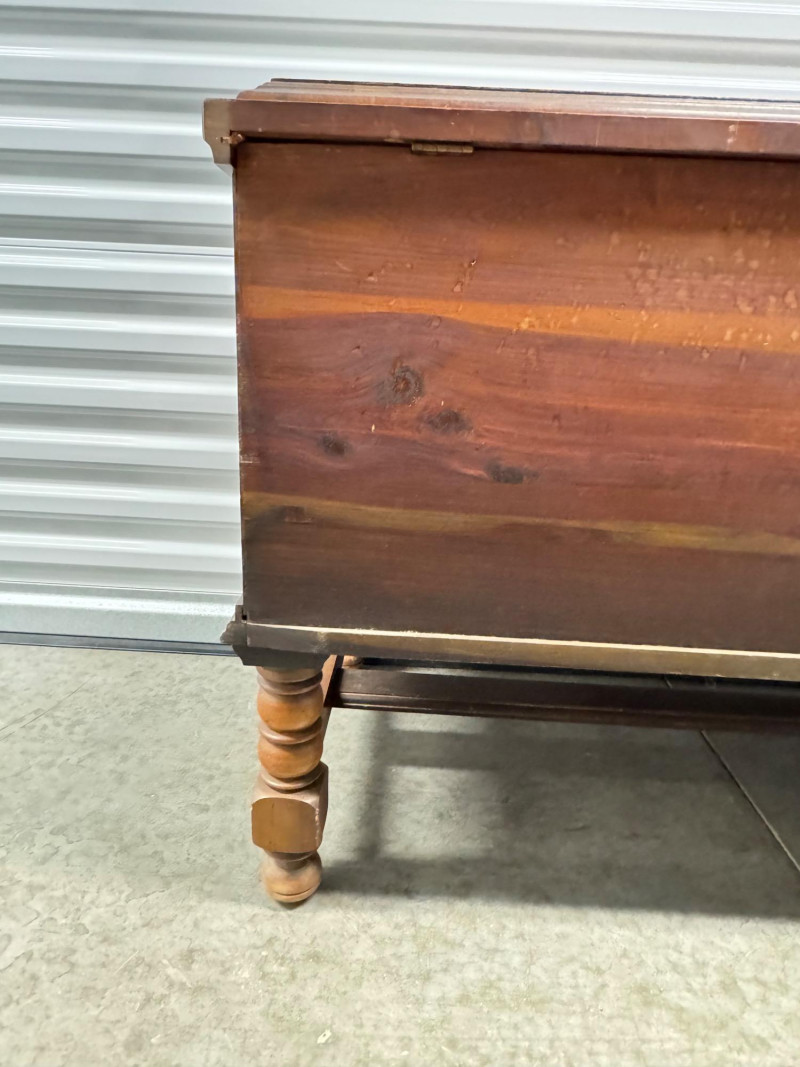 Vintage Cedar Hope Chest on Turned Legs w/ Interior Tray. Bidding on this lot is an agreement that: (1.) You will have at least 2 capable, able bodied persons to lift and load at a minimum. (2.) You will bring a hand truck and/or any other tools needed to remove this item. If these steps are not followed your item will be forfeit and no refund given.