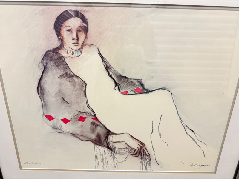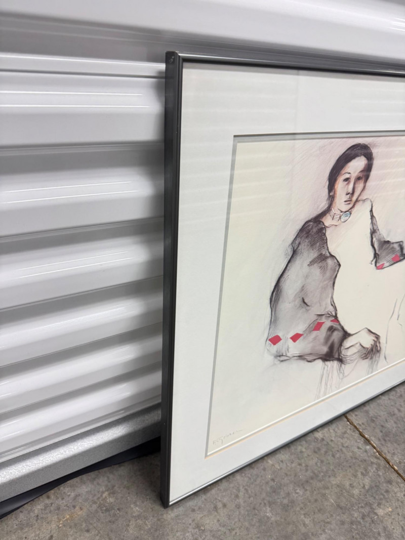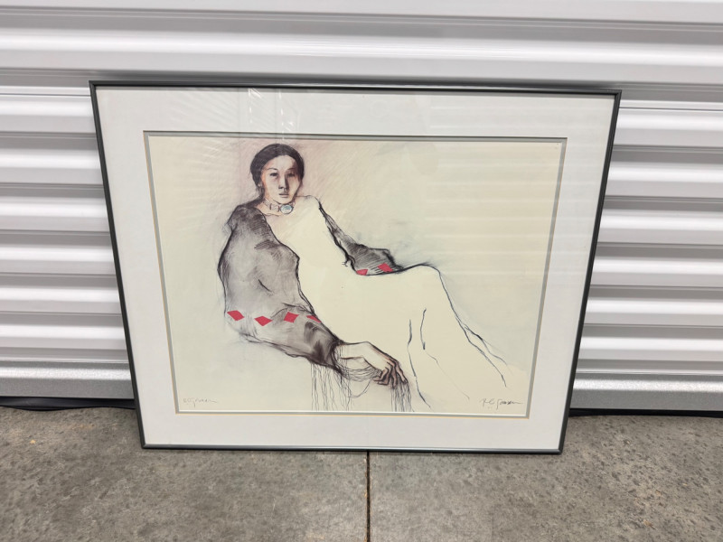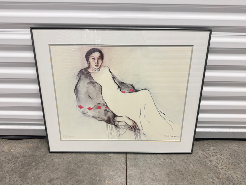 Signed RC Gorman Framed Artwork – Woman in Shawl – Est. Value $1,000. R.C. Gorman (1931–2005) Since 2002, Gorman’s art has achieved prices ranging from $2 to $22,500, with a record sale of Maiden with Turquoise Necklace in 2021 at Freeman’s | Hindman Chicago. Over the past year, his works on paper averaged $1,285, while sculptures averaged $857. Widely recognized in publications such as Daily Art Magazine, ArtDaily, and Southwest Art, Gorman remains an influential figure in contemporary Indigenous art.