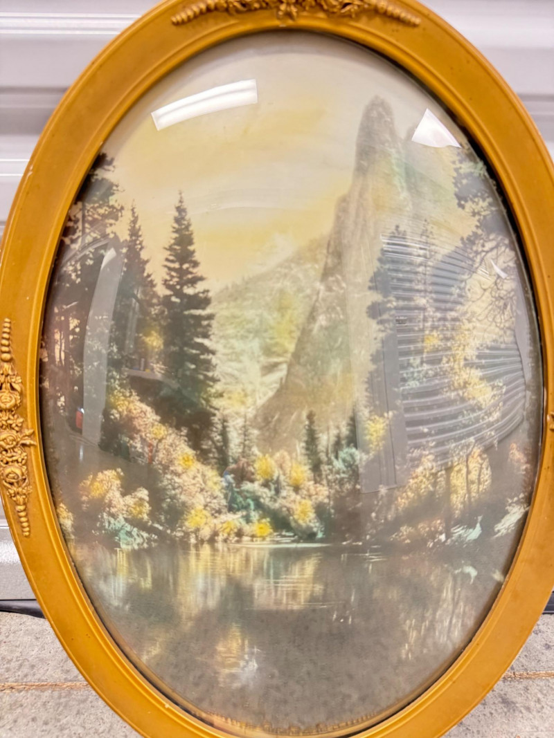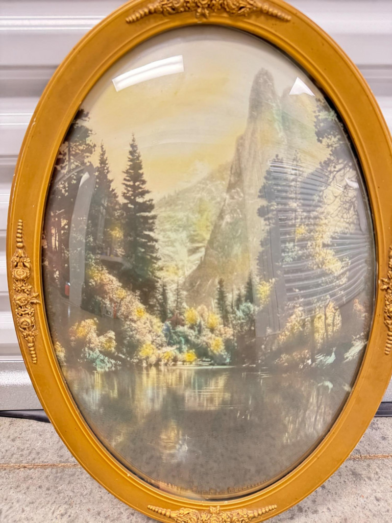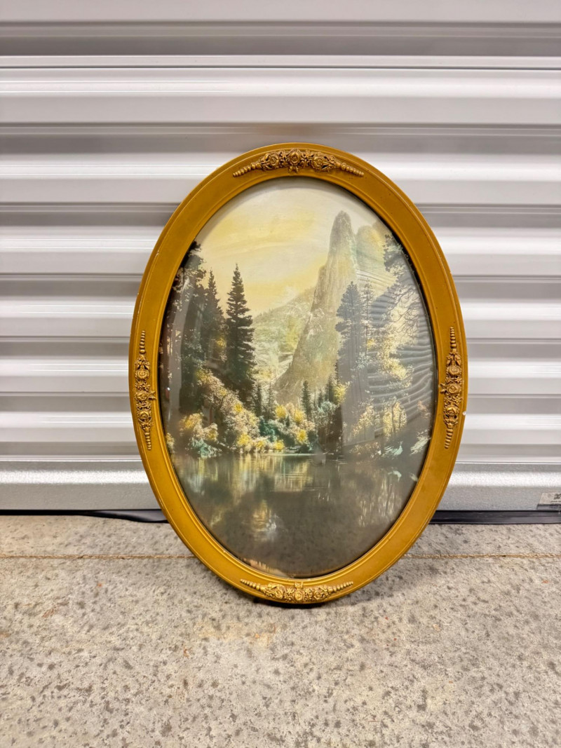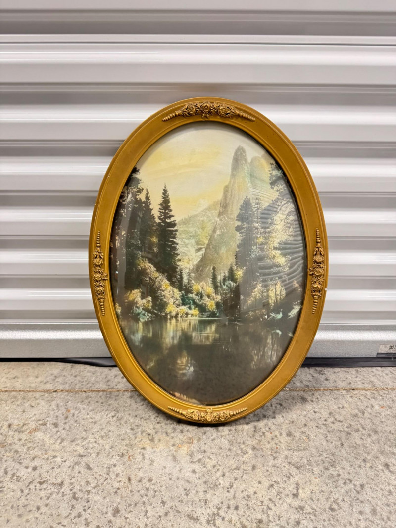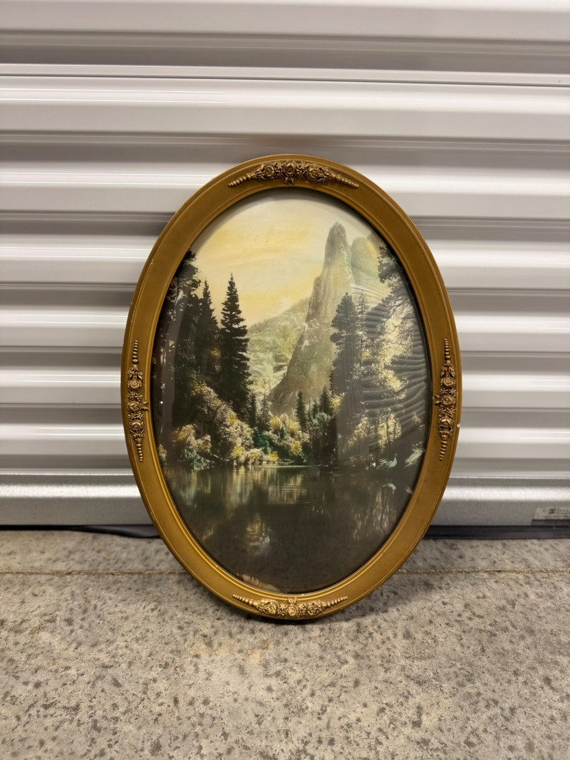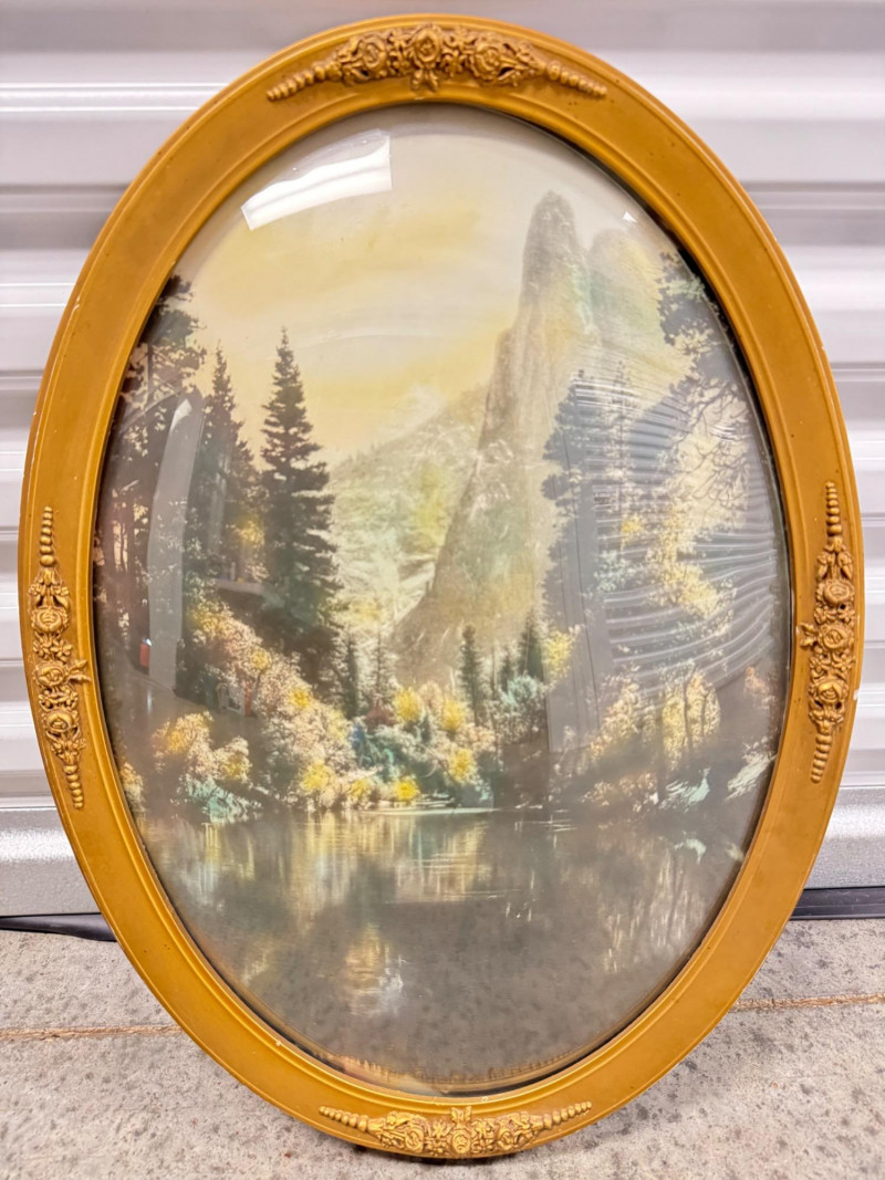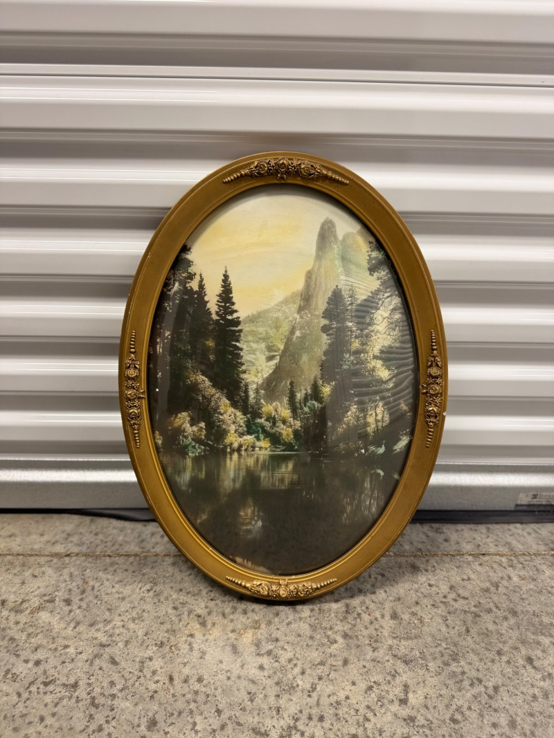 Antique Ornate Oval Frame – National Forest Nature Scene. Frame size: 15 1/2 x 22 inches