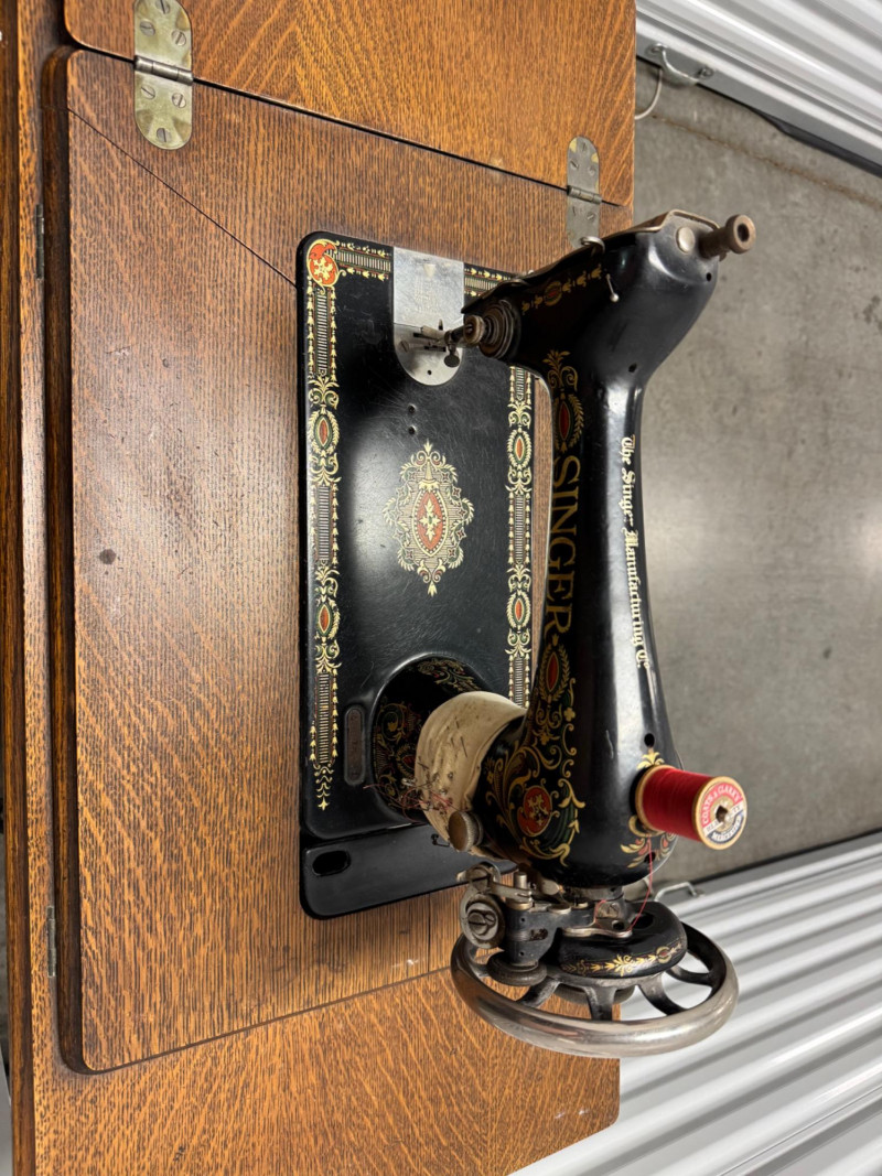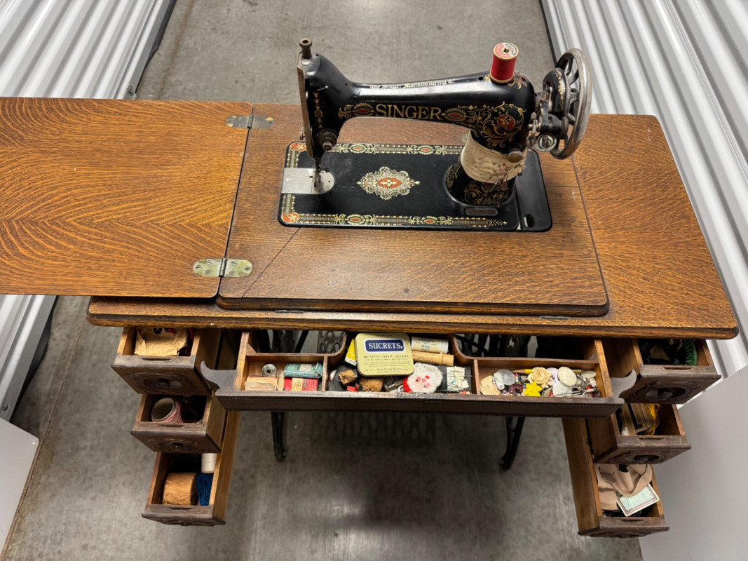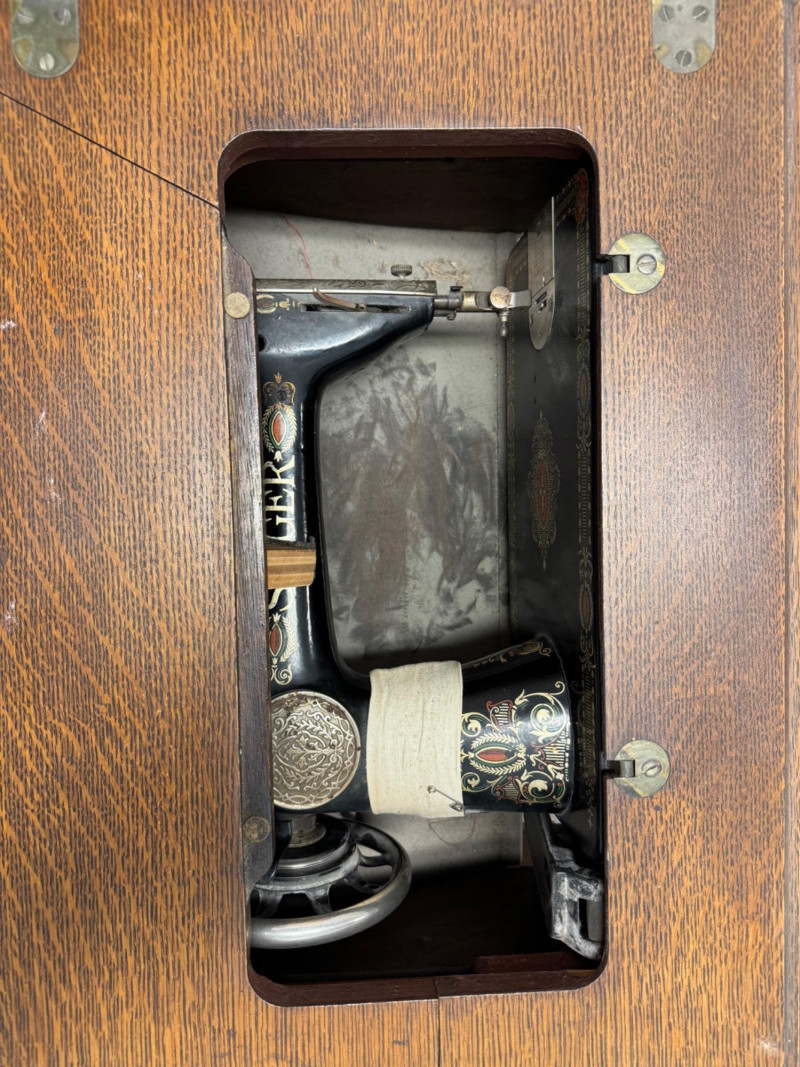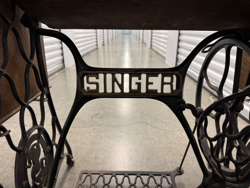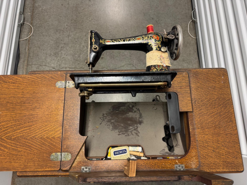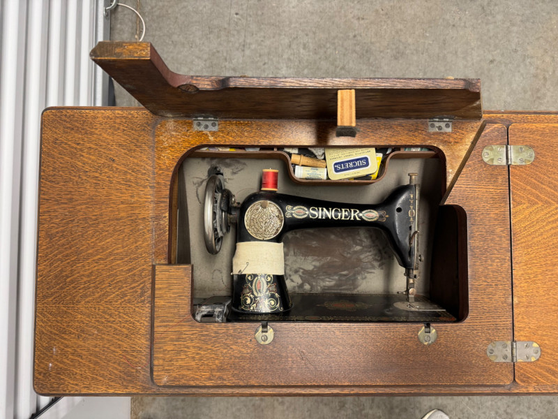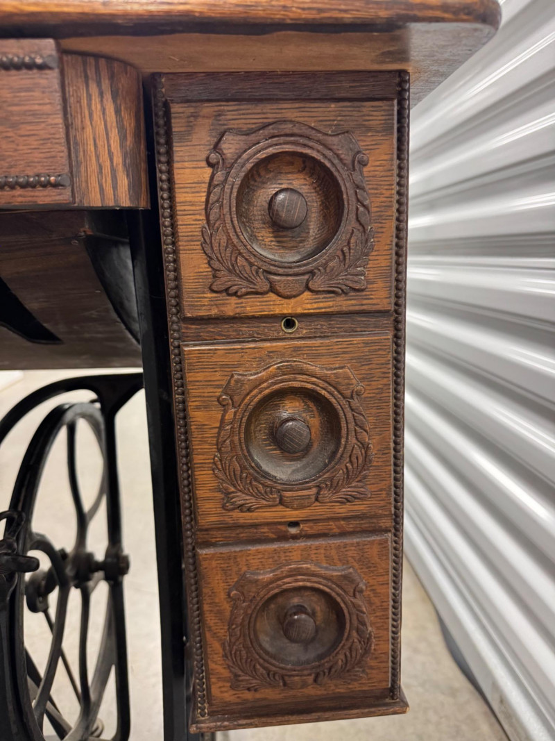 Lot # 90 - Antique Singer Treadle Sewing Machine w/ Drawers & Cabinet 1900–1910