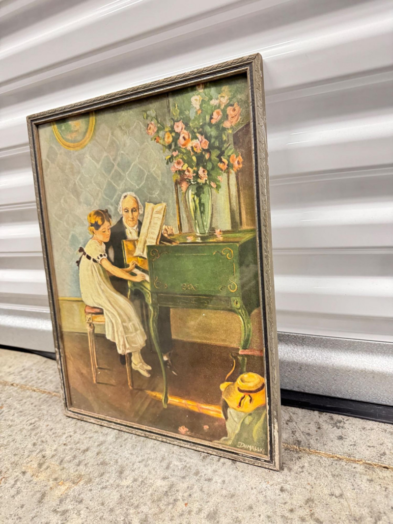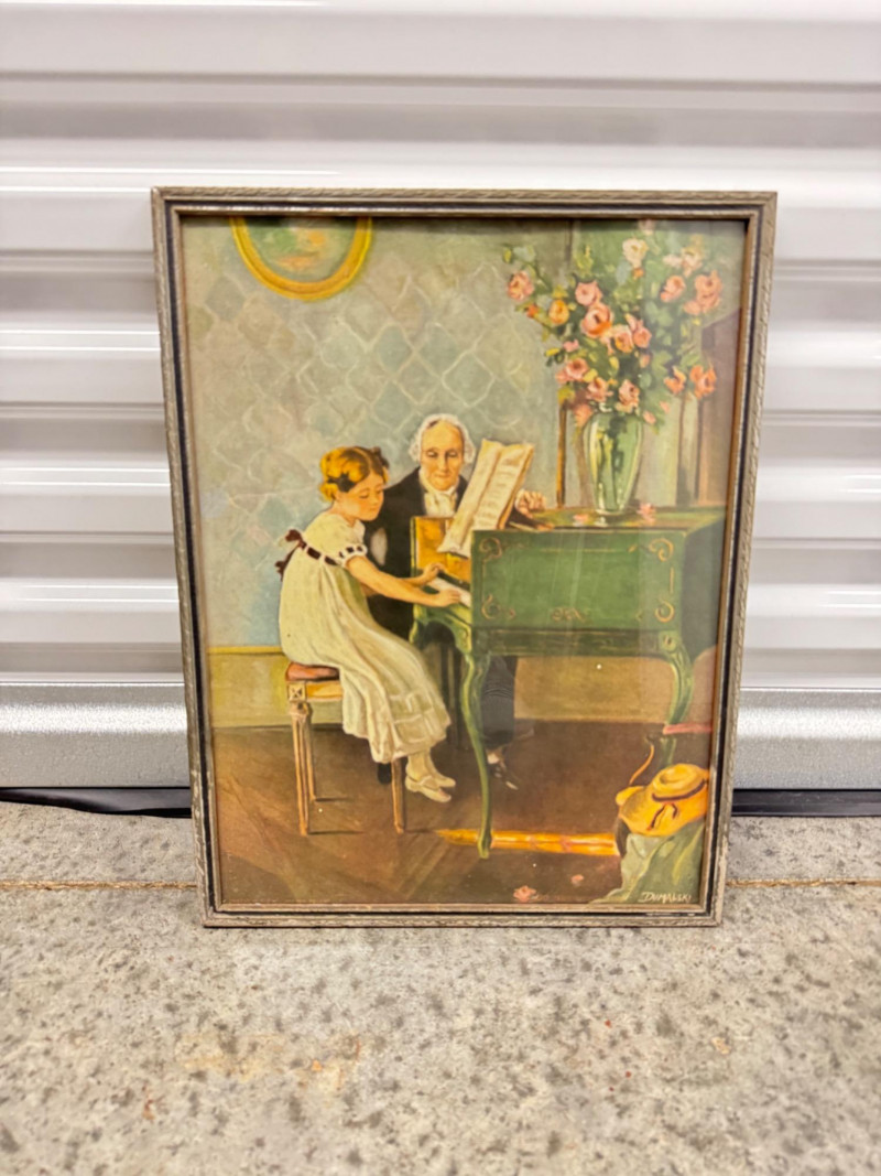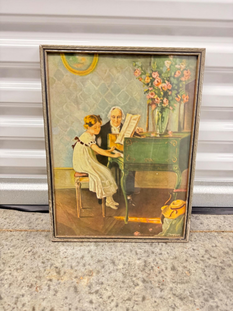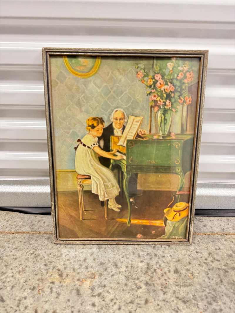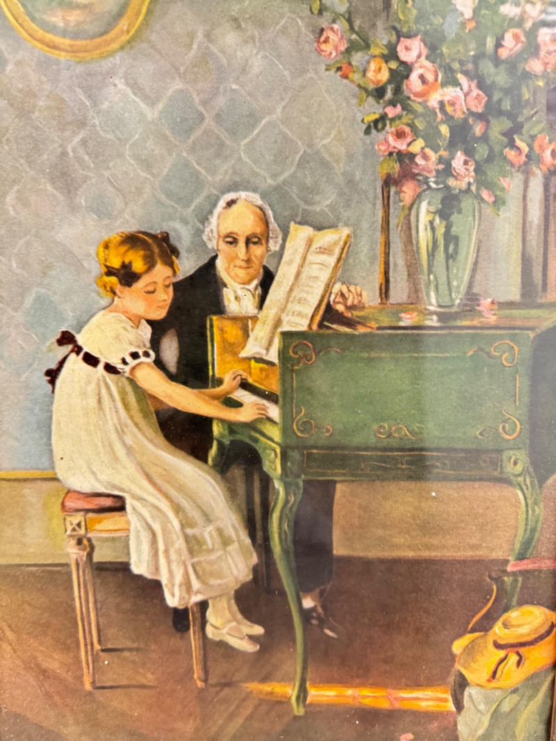 First Music Lesson by Dumalski – Framed Print, Girl & Man at Piano. 13" x 17"