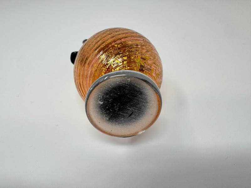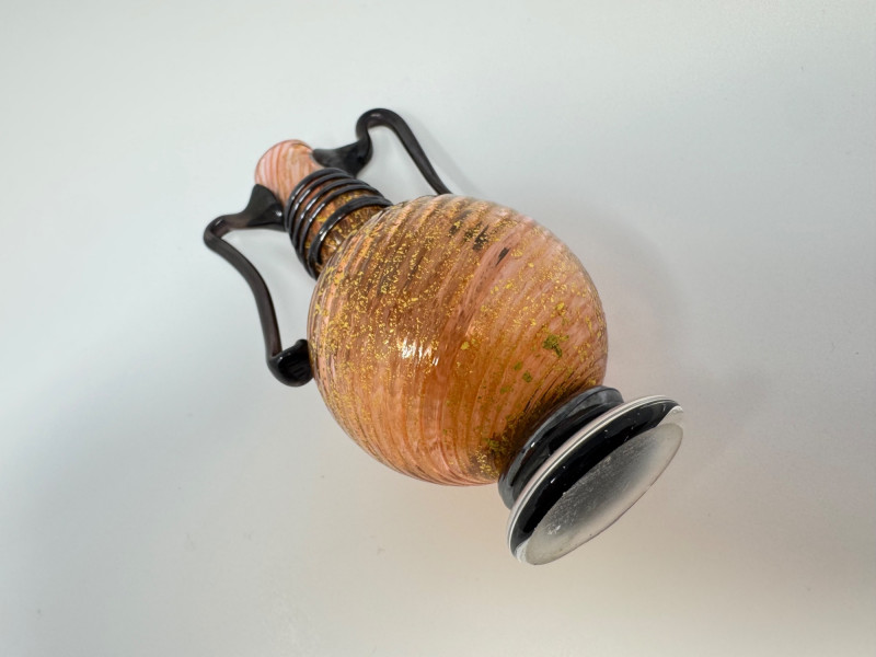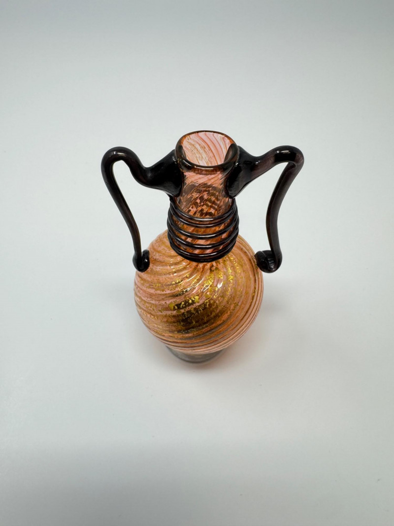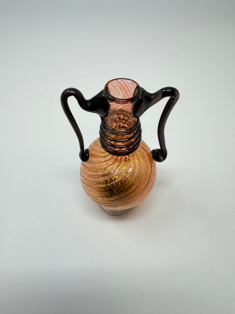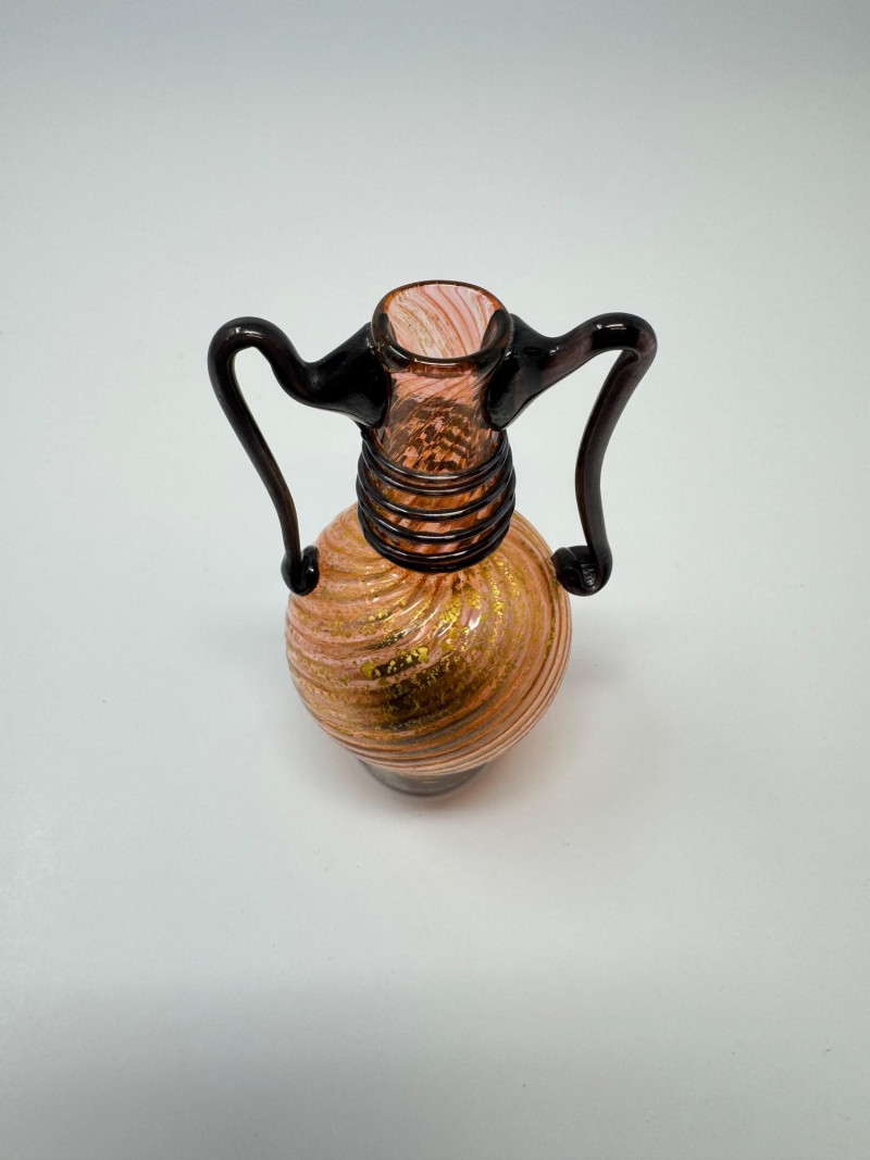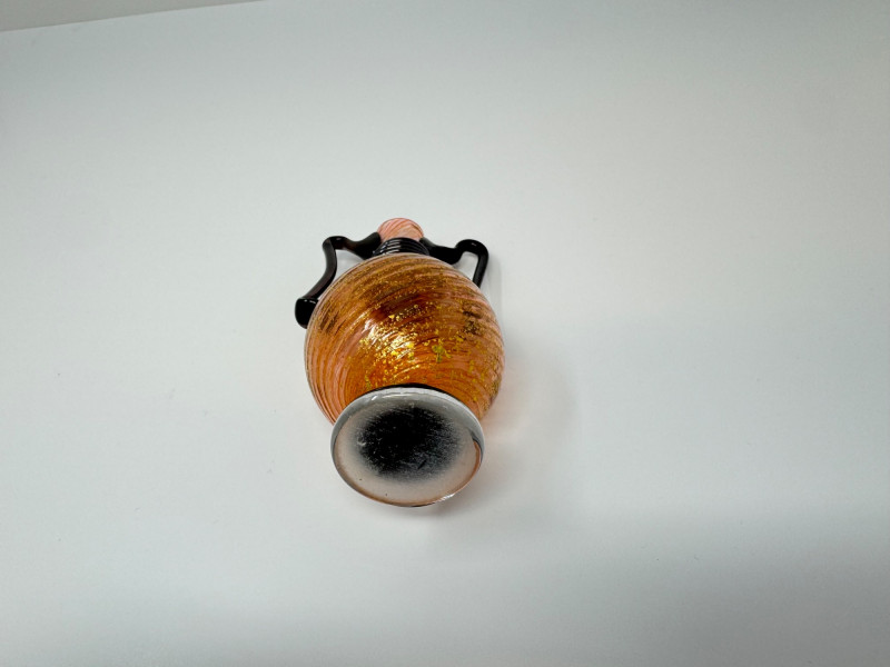 Swirled Orange & Gold Art Glass Vase w/ Dual Black Handles. Measures approx. 2.5" wide x 4.5" tall.